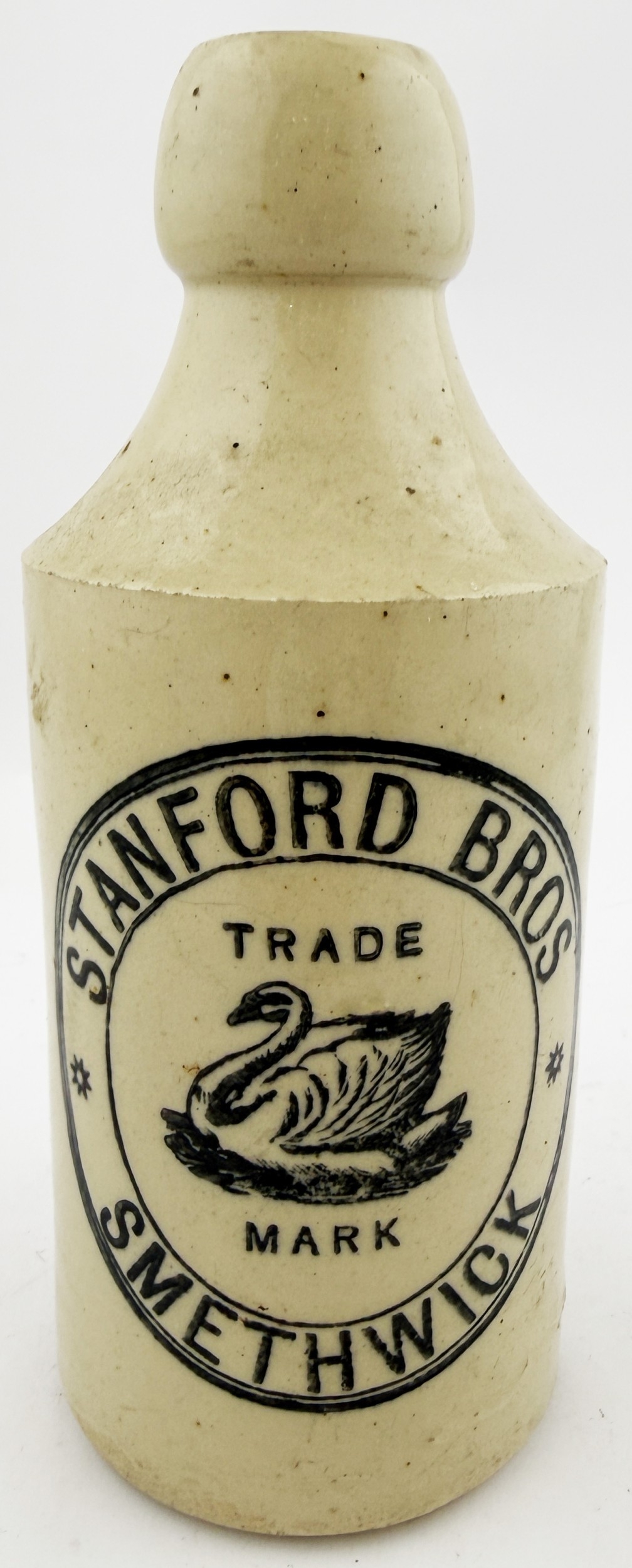 STANFORD BROS SMETHWICK GINGER BEER BOTTLE. 6.8ins tall. All white std. ginger STANFORD BROS/ SMETHWICK around a pict. t.m. of a swan. Price Bristol p.m.