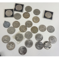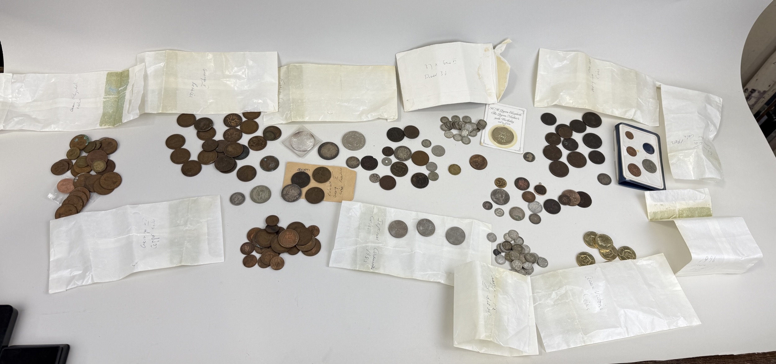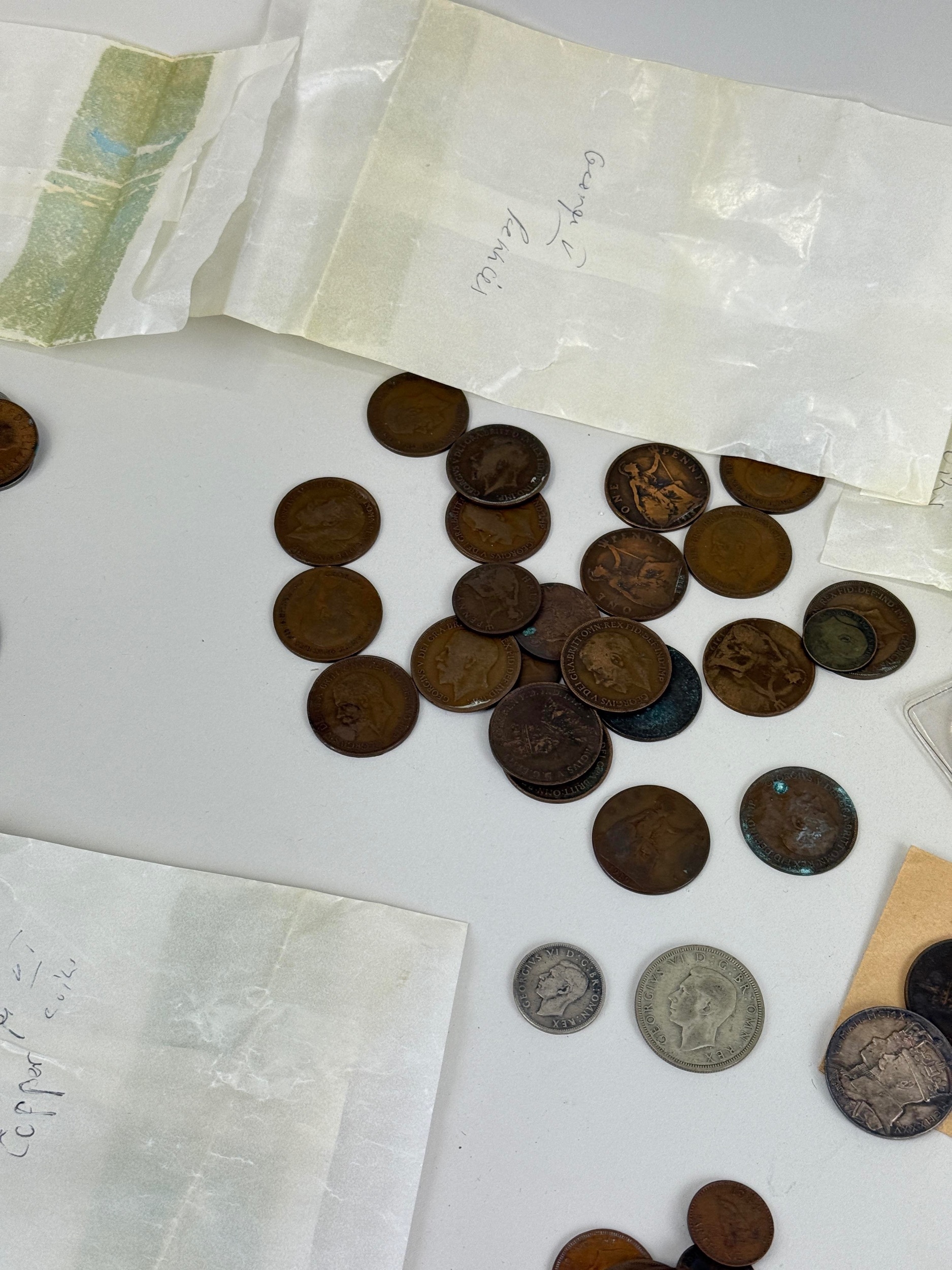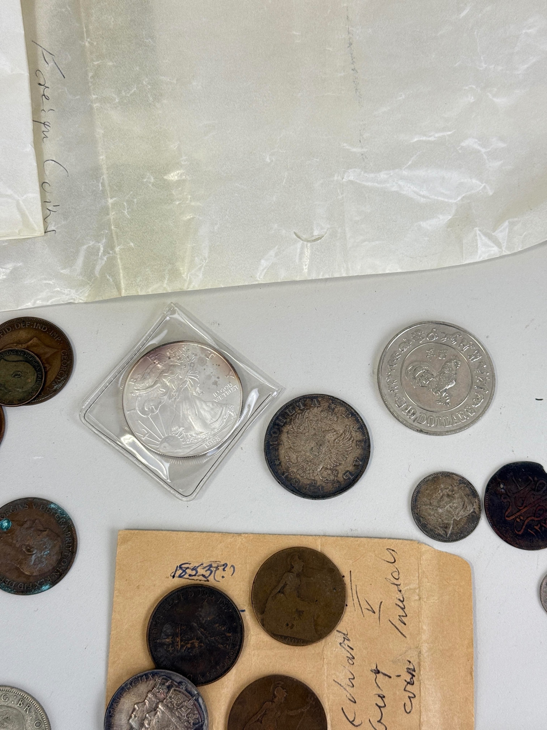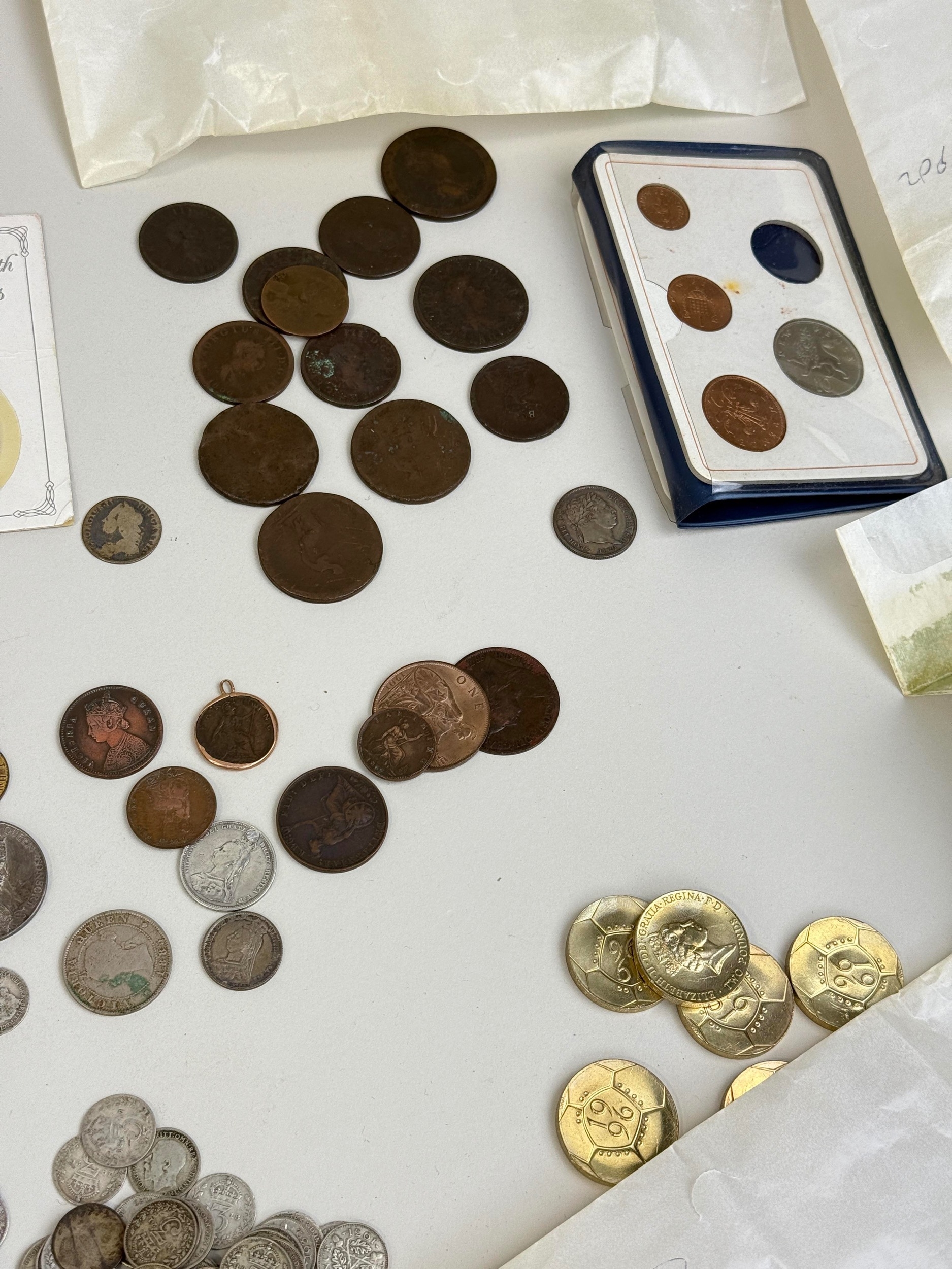A LARGE COLLECTION OF COINS TO INCLUDE SILVER, GEORGIAN, BRONZE, US 1OZ SILVER, COMMEMORATIVE (QTY)