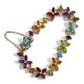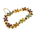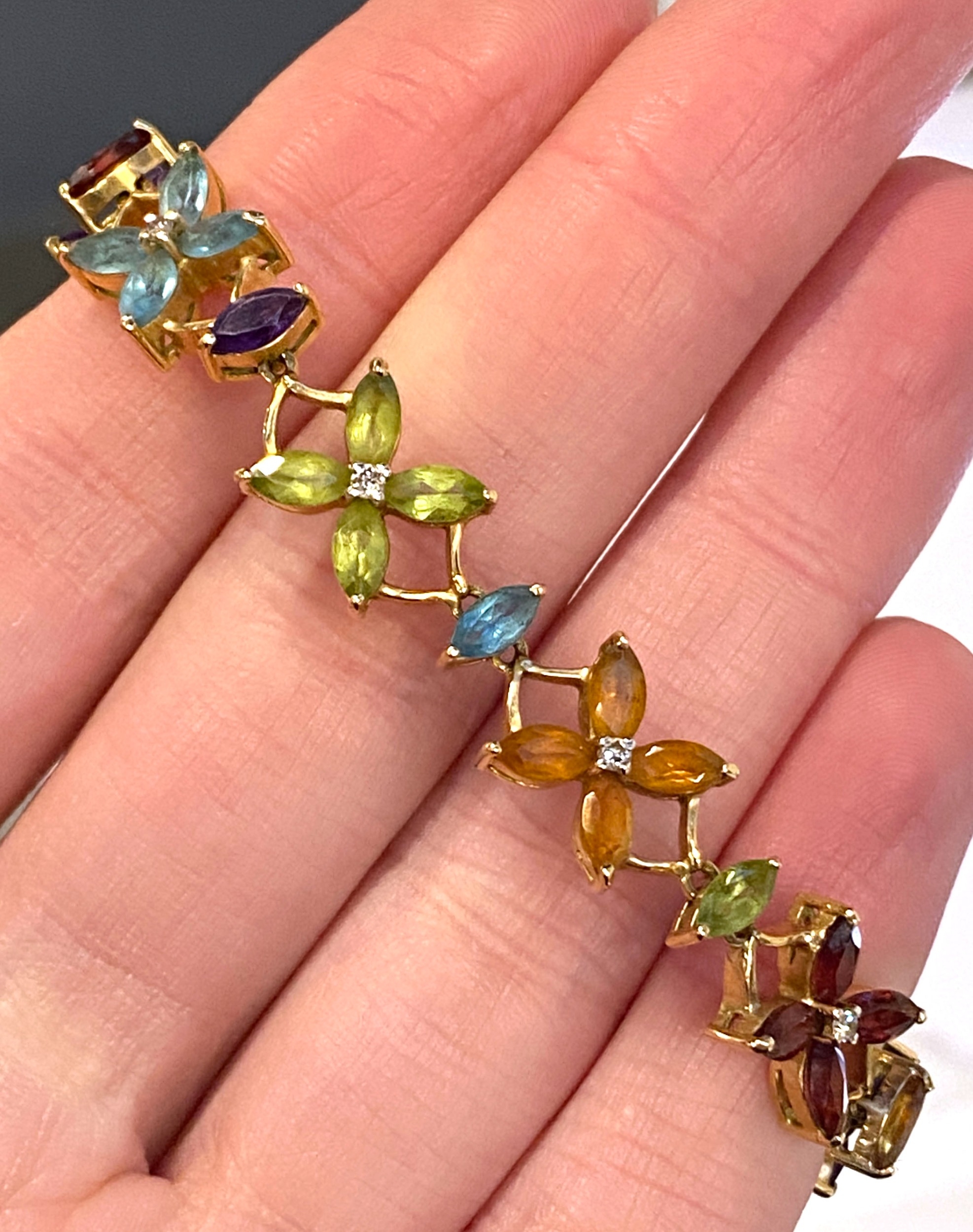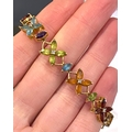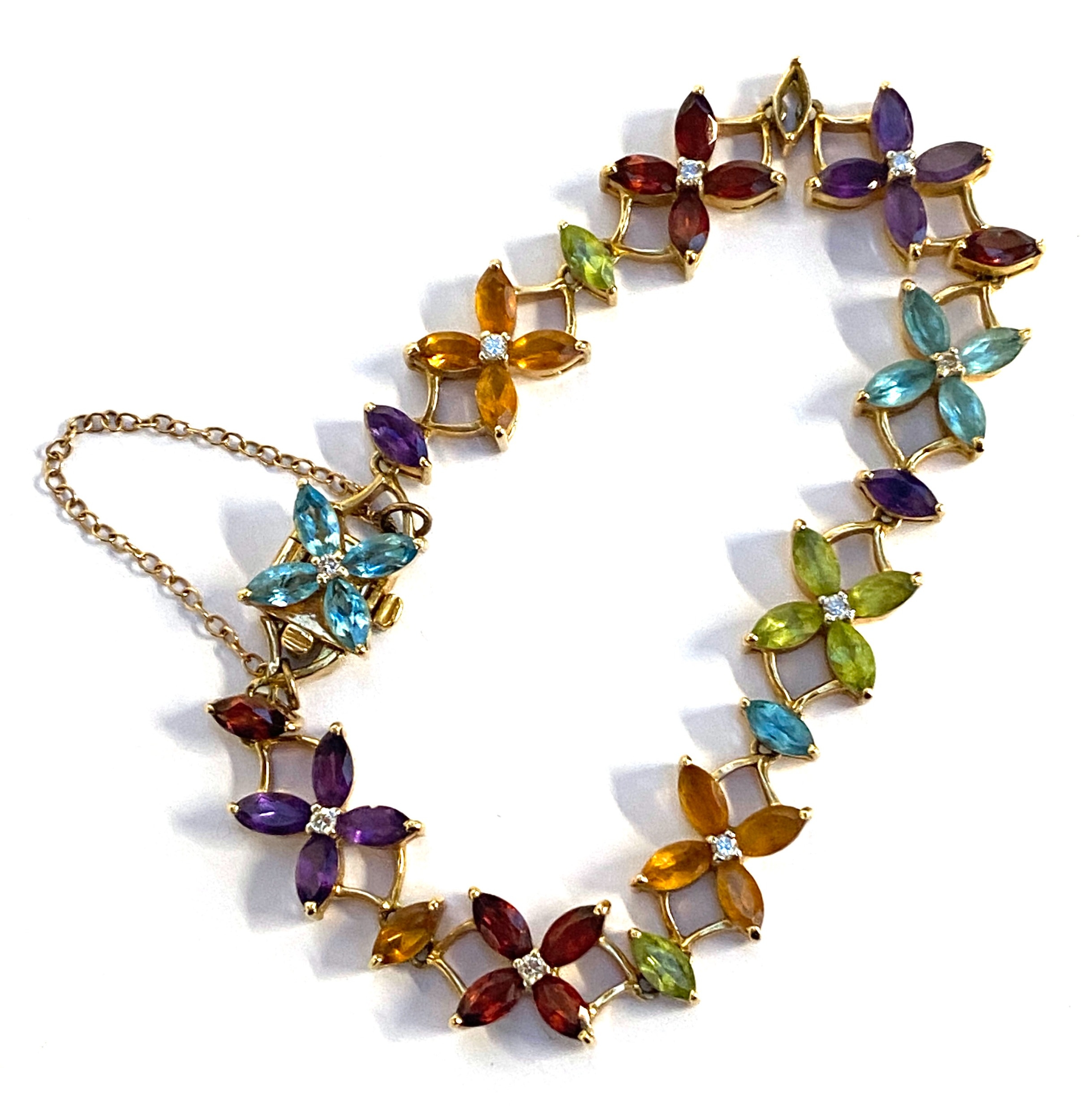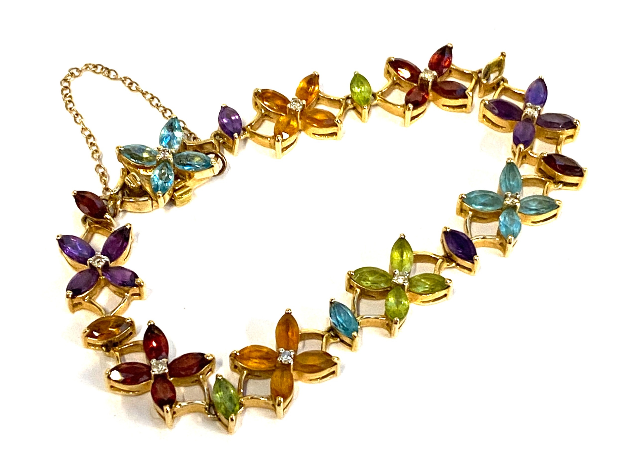 A heavy 18ct gold multigem and diamond floral bracelet, set with marquise cut citrines, peridots, garnets amethysts and blue topaz, stamped 750 to clasp tongue, 21.1g