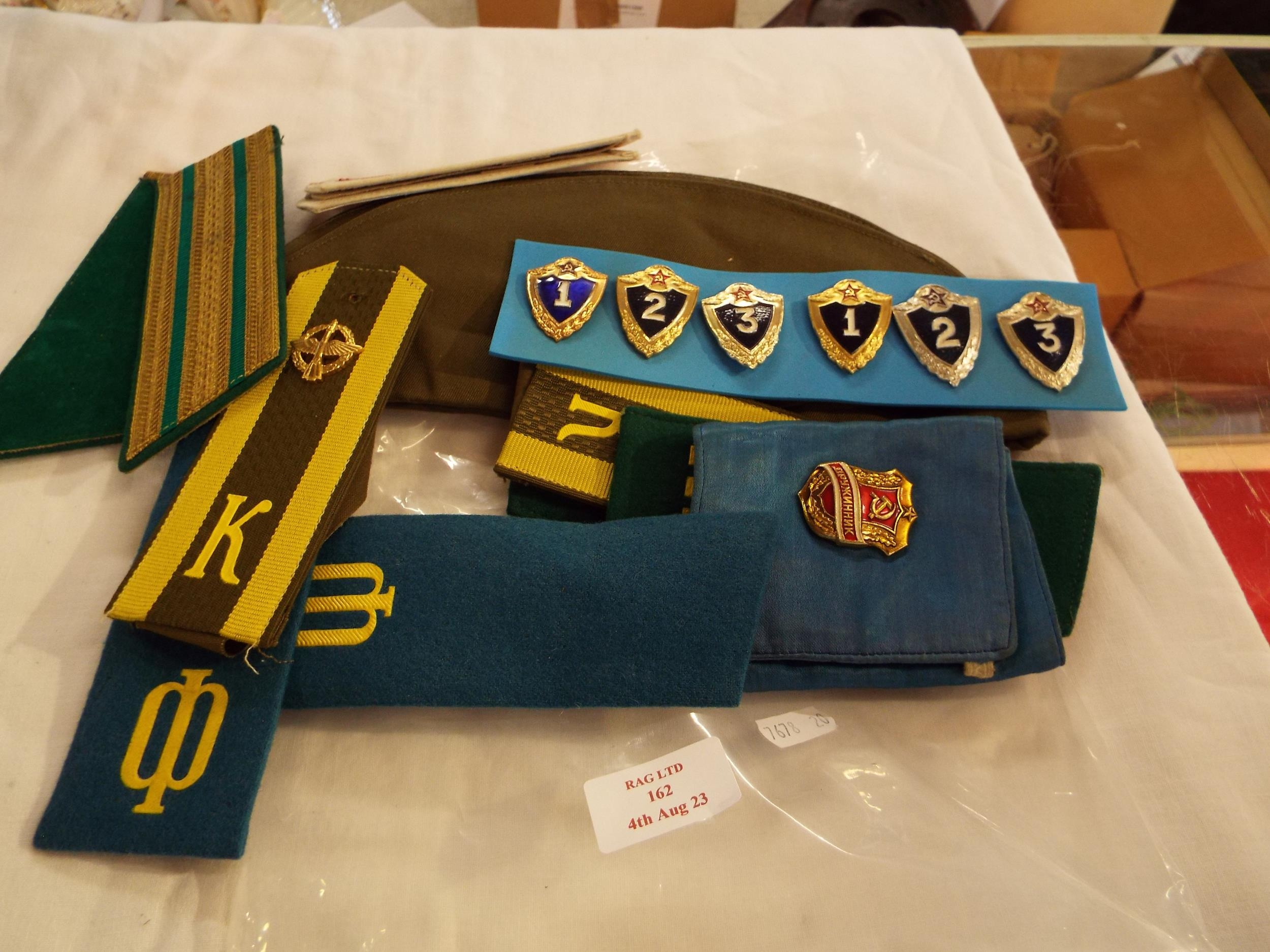 A selection of Russian items to include cap, arm band, shoulder boards etc