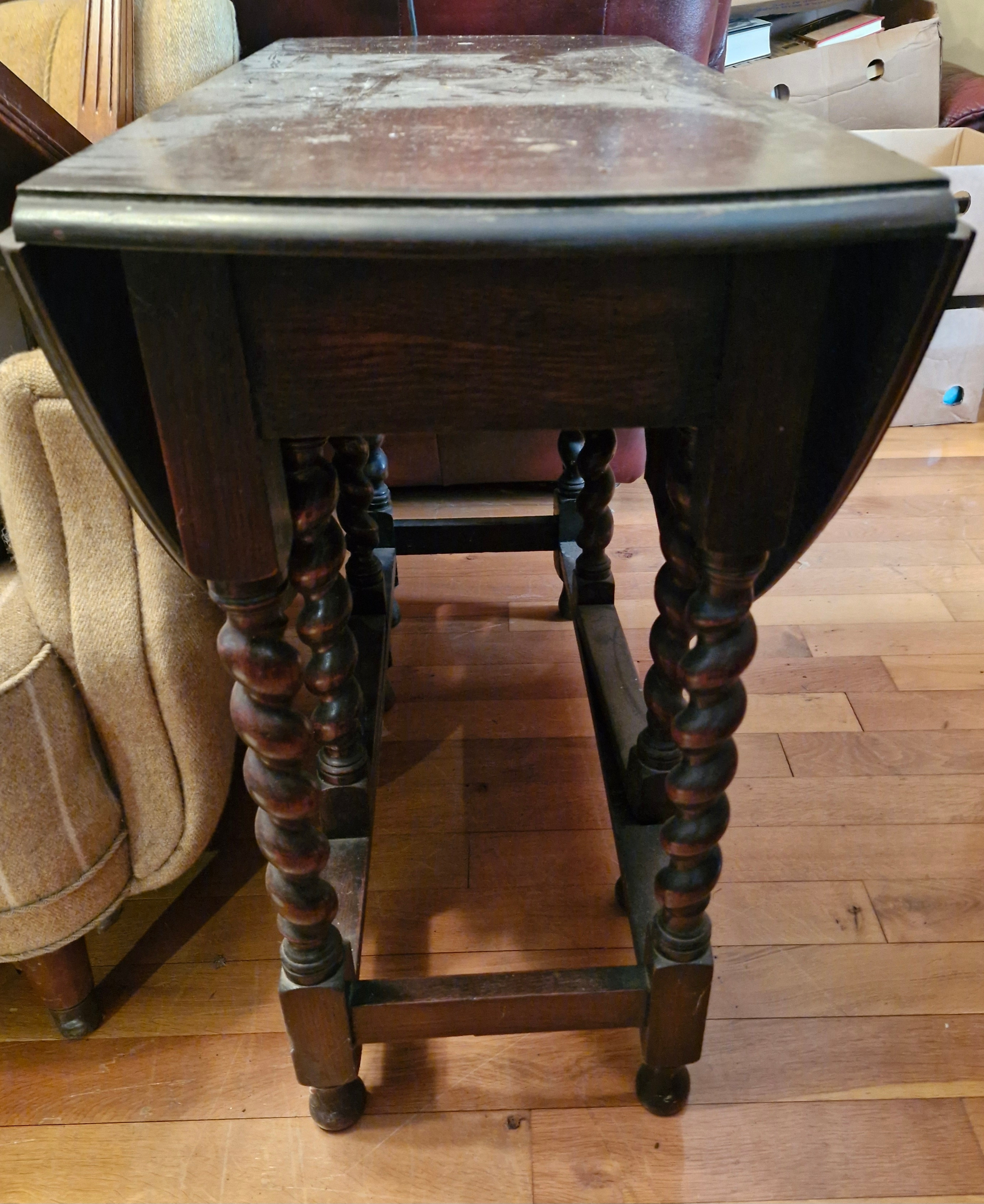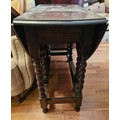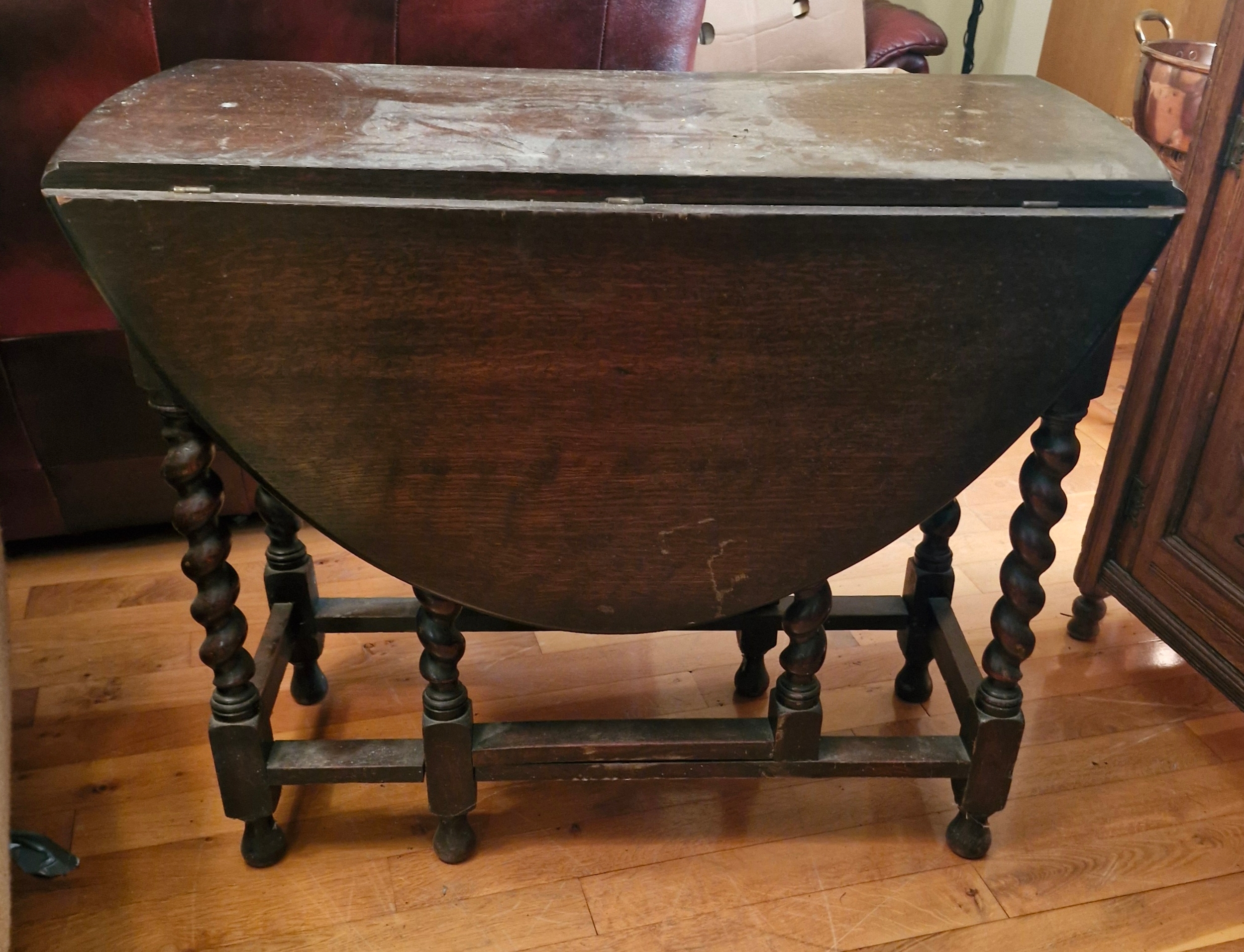 An early 1920s oak drop leaf table with barley twist legs.