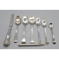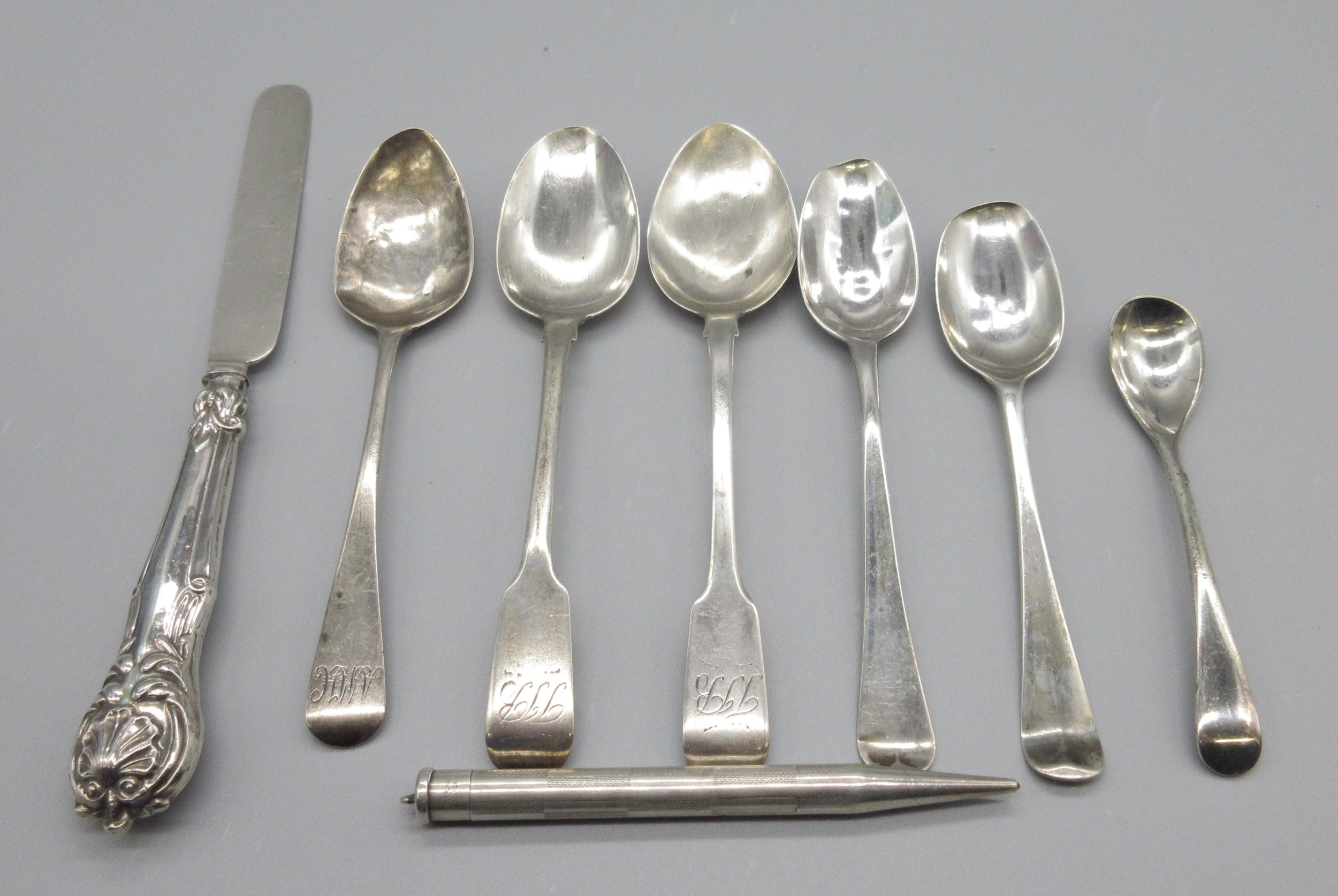 Silver 'Lady Yard O Lette' propelling pencil, two Georgian silver teaspoons, hallmarks illegible, Pair of George IV silver teaspoons by Hyam Hyams, London 1824, and other silver flatware, gross 3.3ozt