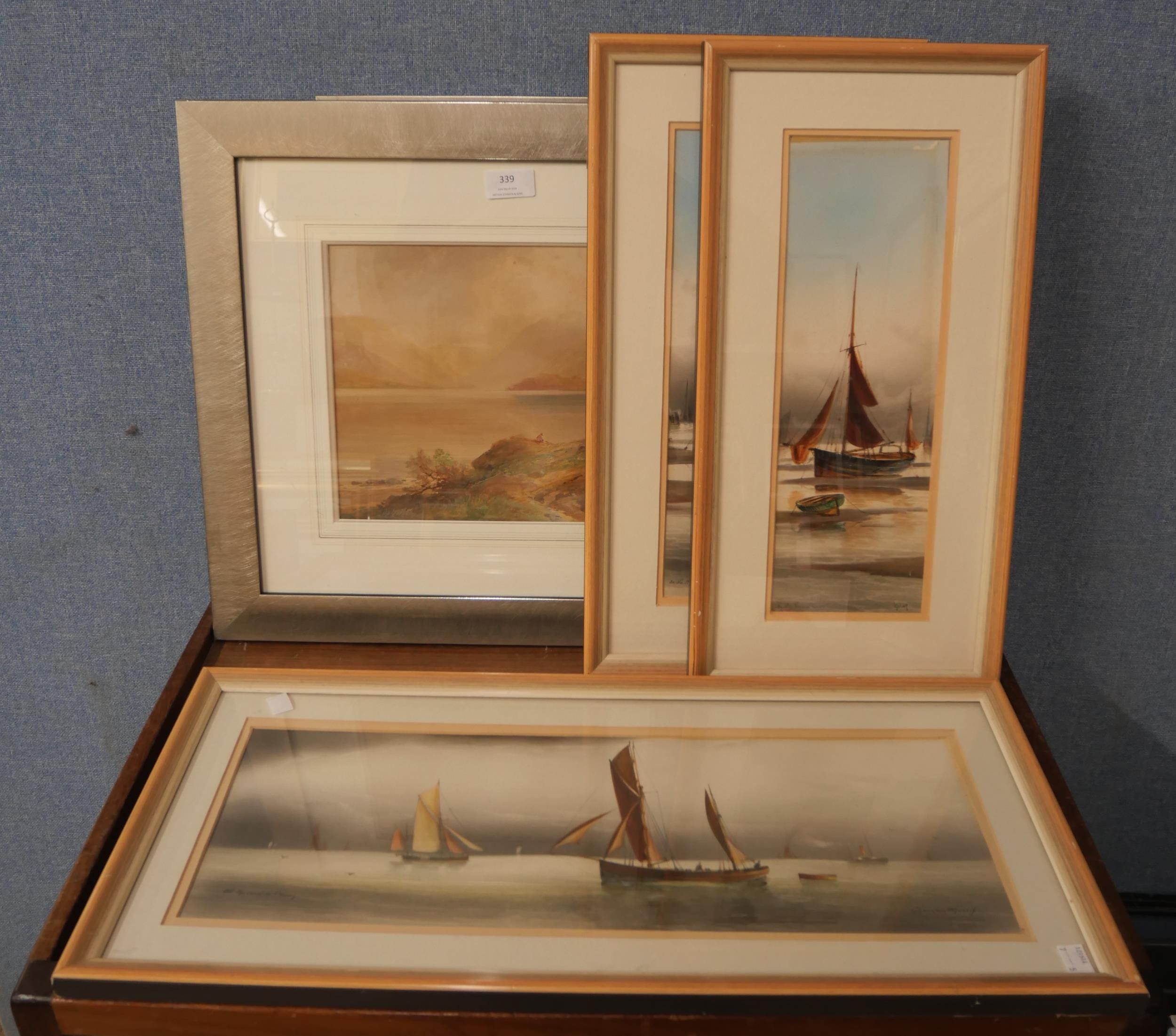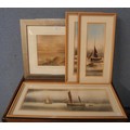 Garman Morris, three marine scenes, watercolour and Edith A. Stock, pair of Lake District landscapes, all framed