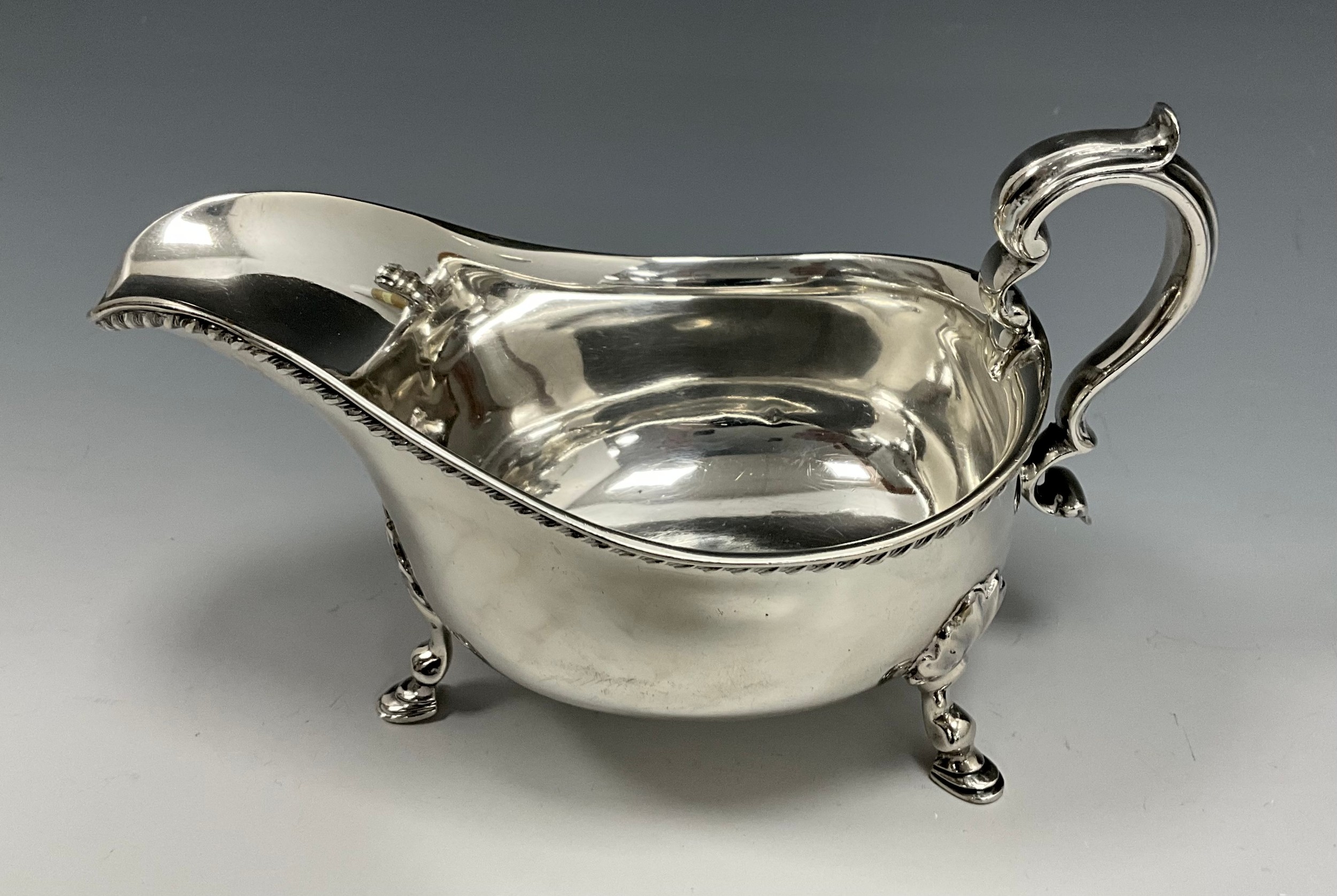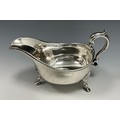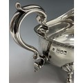 A Victorian silver gravy or sauce jug, scrolled handle, three hoof feet, Thomas Bradbury & Son, London 1897, 347g