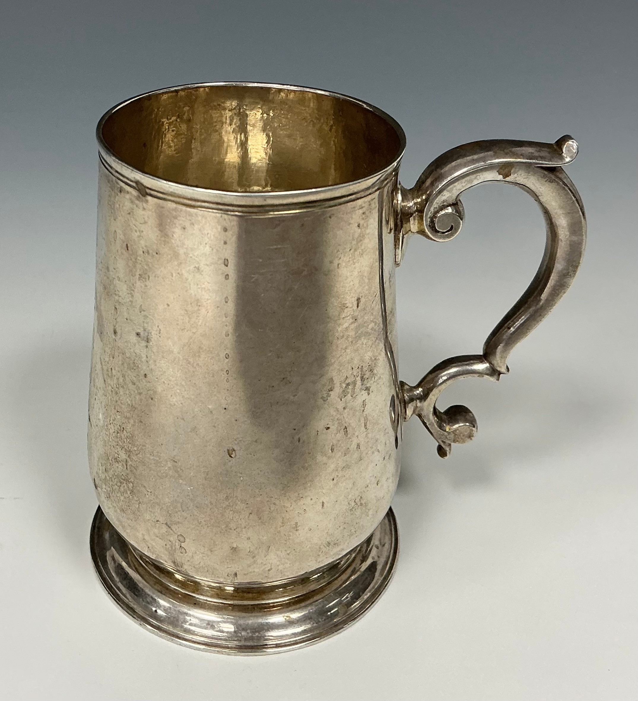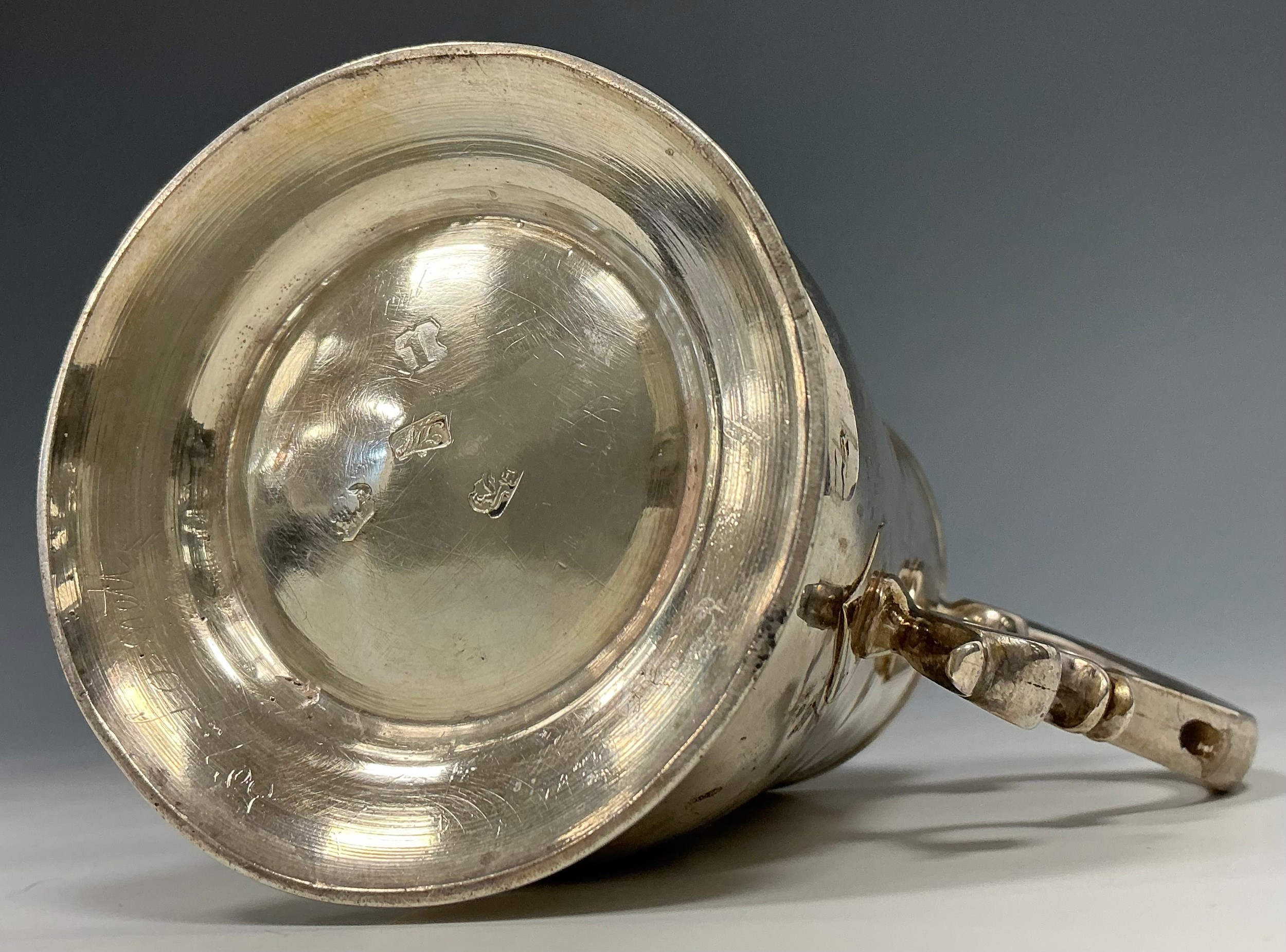 A George II silver bell shaped half pint mug, capped double-scroll handle, skirted base, 10.5cm high, Thomas Whipham, London 1746, 201g