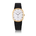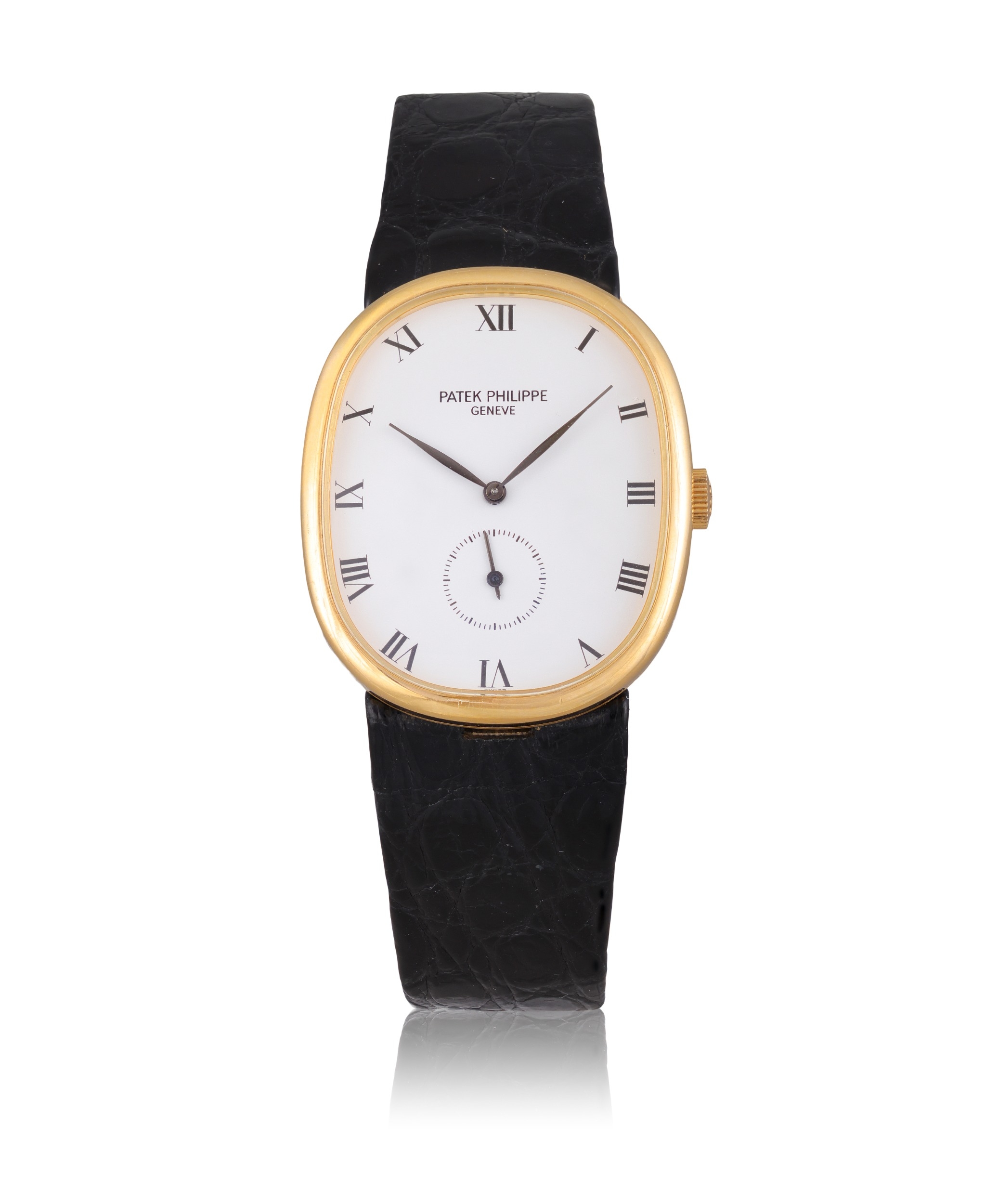 PATEK PHILIPPE ELLIPSE, REF. 3948, YELLOW GOLD A fine and elegant yellow gold manual wind wristwatch with subsidiary seconds. Year: Circa 1990s Dial: White dial with painted black Roman numerals, subsidiary seconds at 6 with chemin de fer minute track, slender baton hands Calibre: Manual wind, cal. 215, numbered 1814912, signed Case: 18K yellow gold, No. 2856085 Dimensions: 27 x 32 mm Gross Weight: 34.07 g approx. Bracelet/Strap: Patek Philippe black leather strap with later plated pin buckle Signature: Dial, case and movement signed