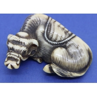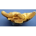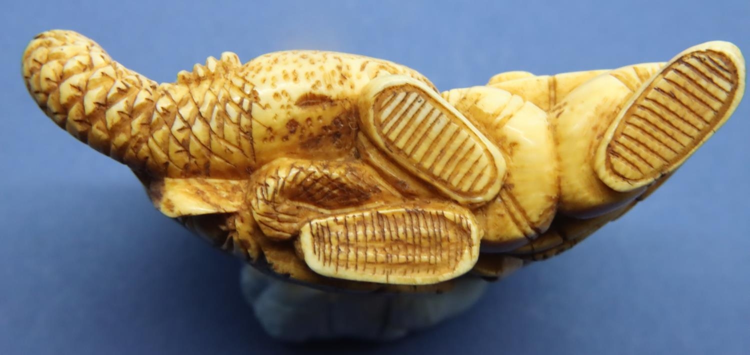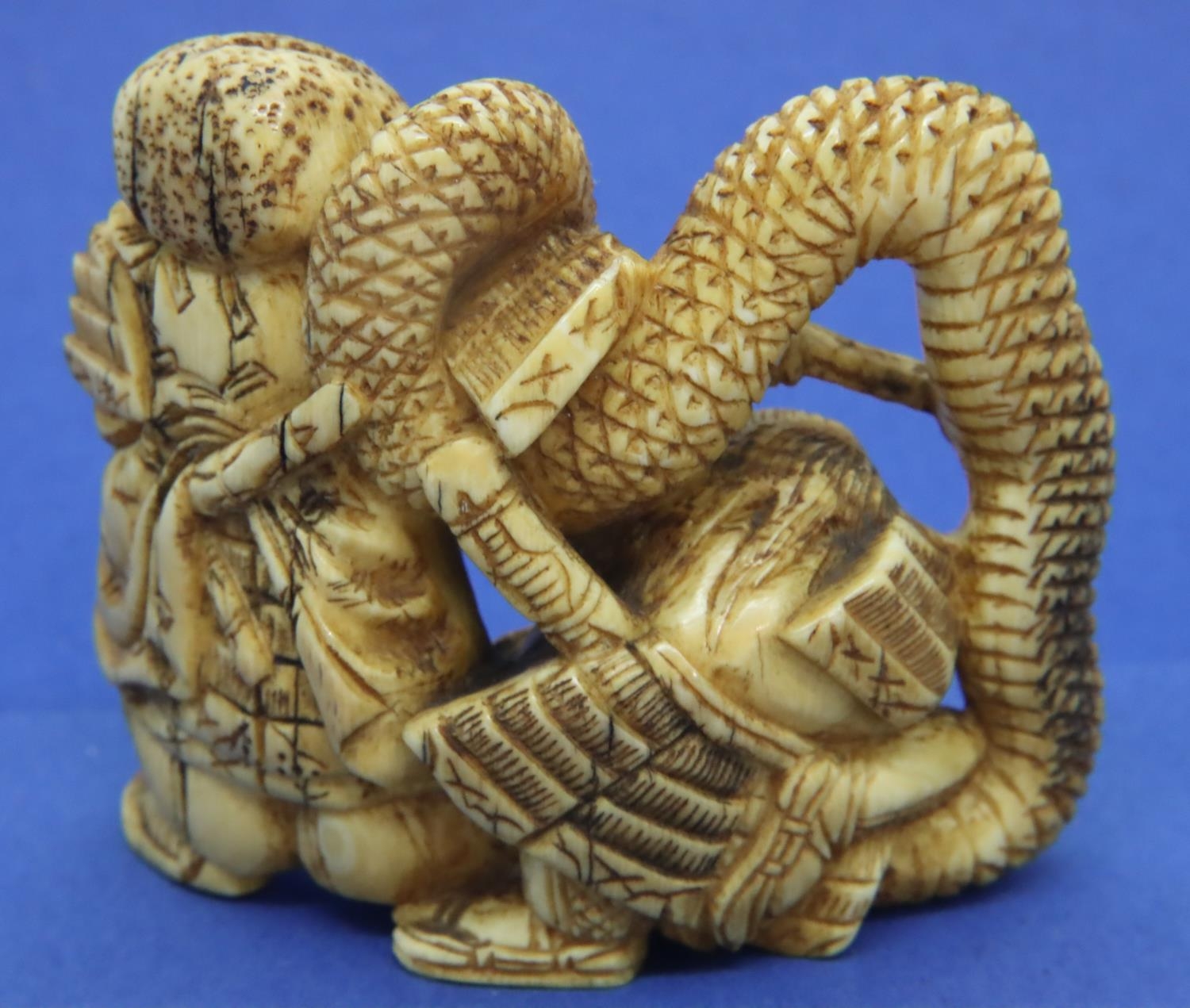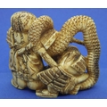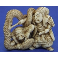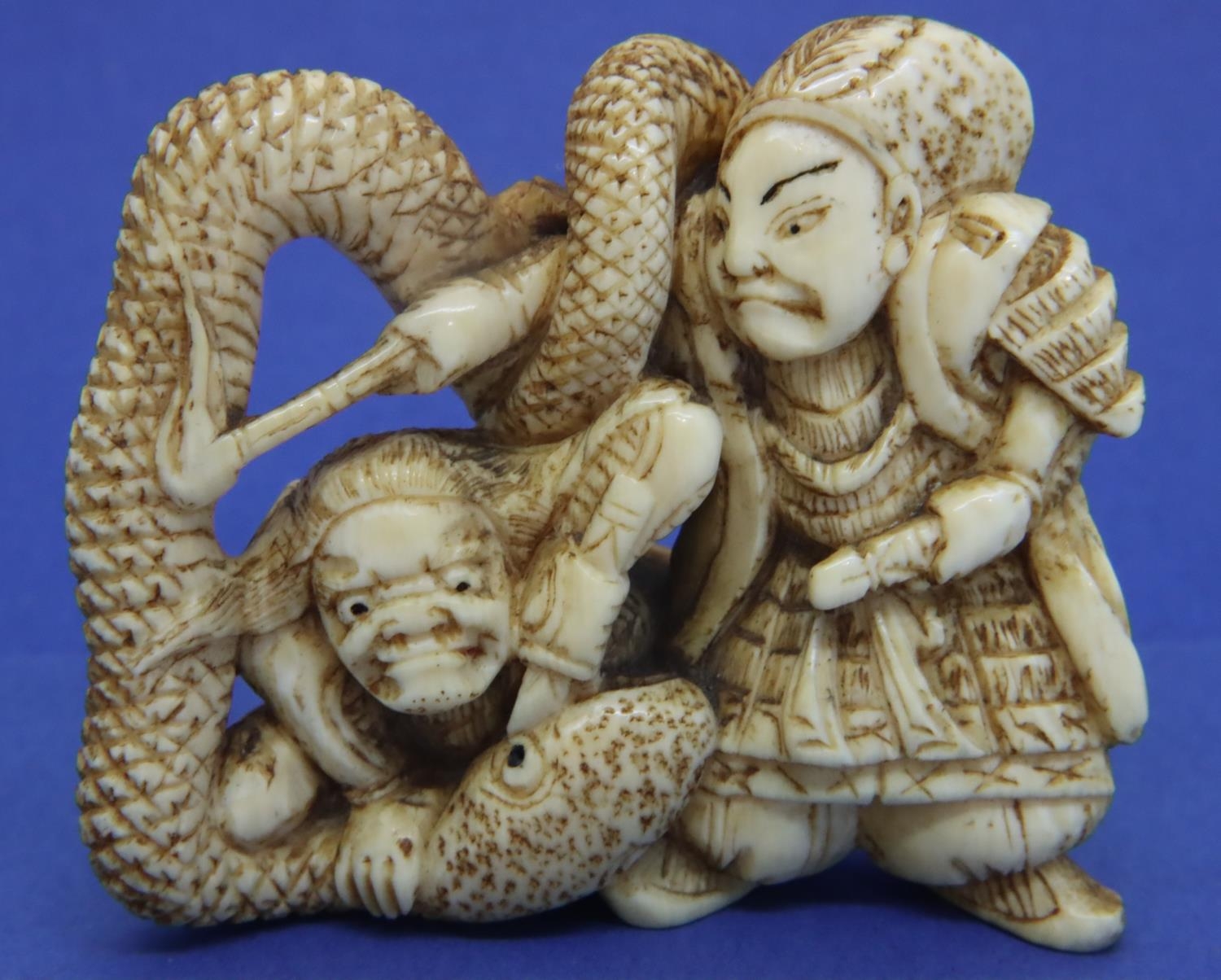A carved ivory figural group with a man holding a flaming torch, a further figure and a snake, H: 52 mm, unsigned. P&P Group 1 (£14+VAT for the first lot and £1+VAT for subsequent lots)