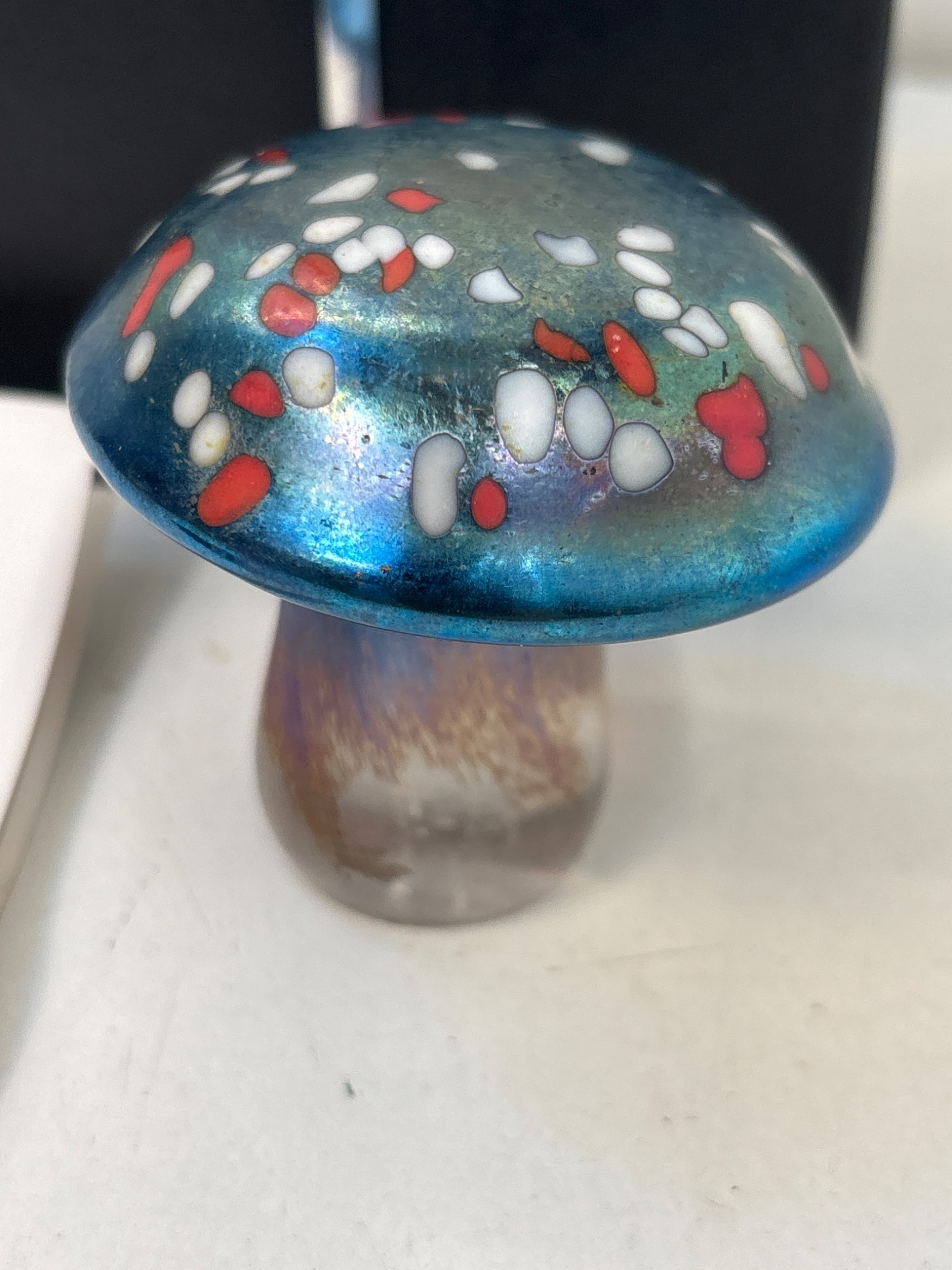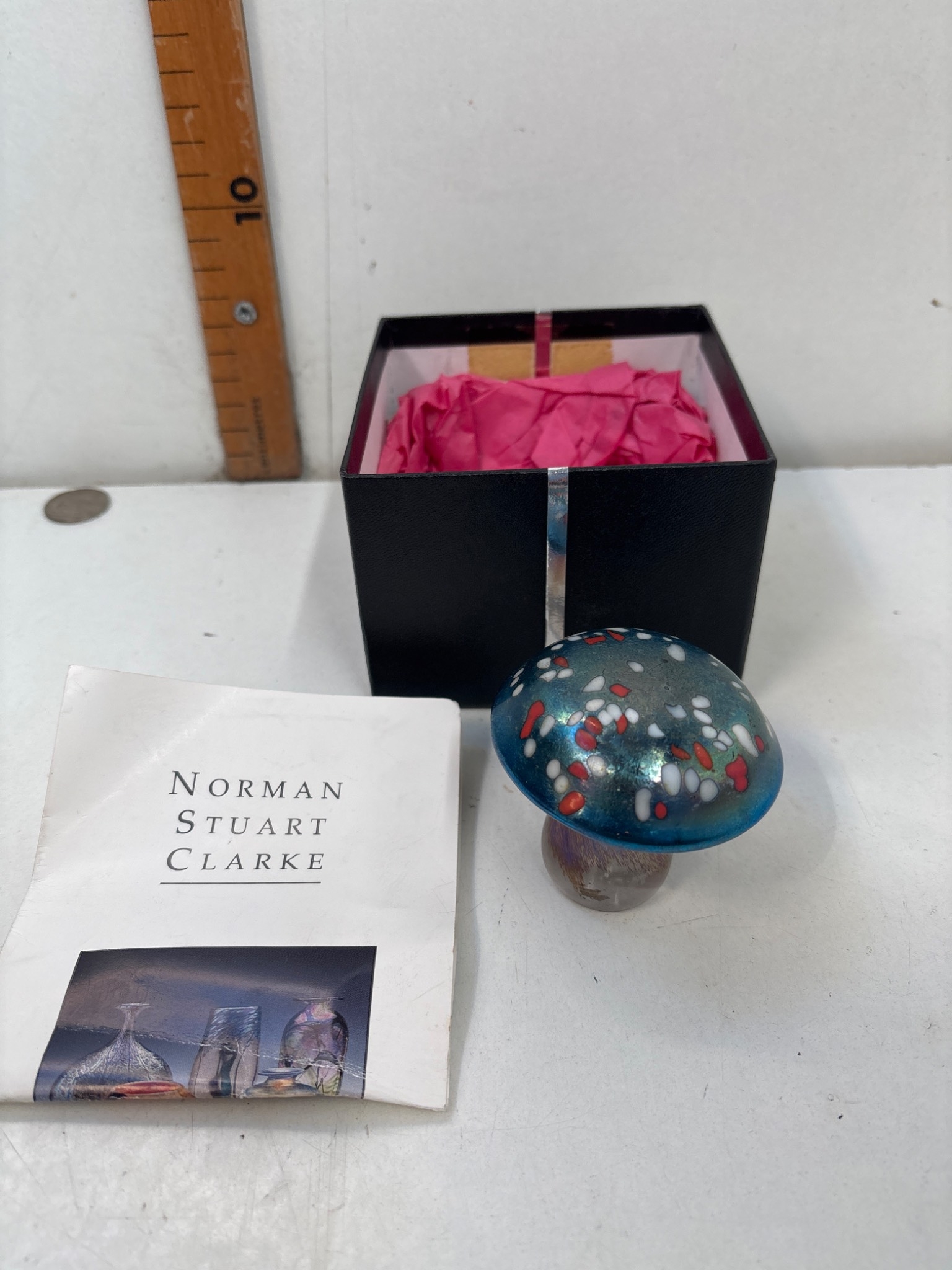 Norman Stuart Clarke glass mushroom ornament with original box.