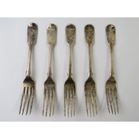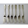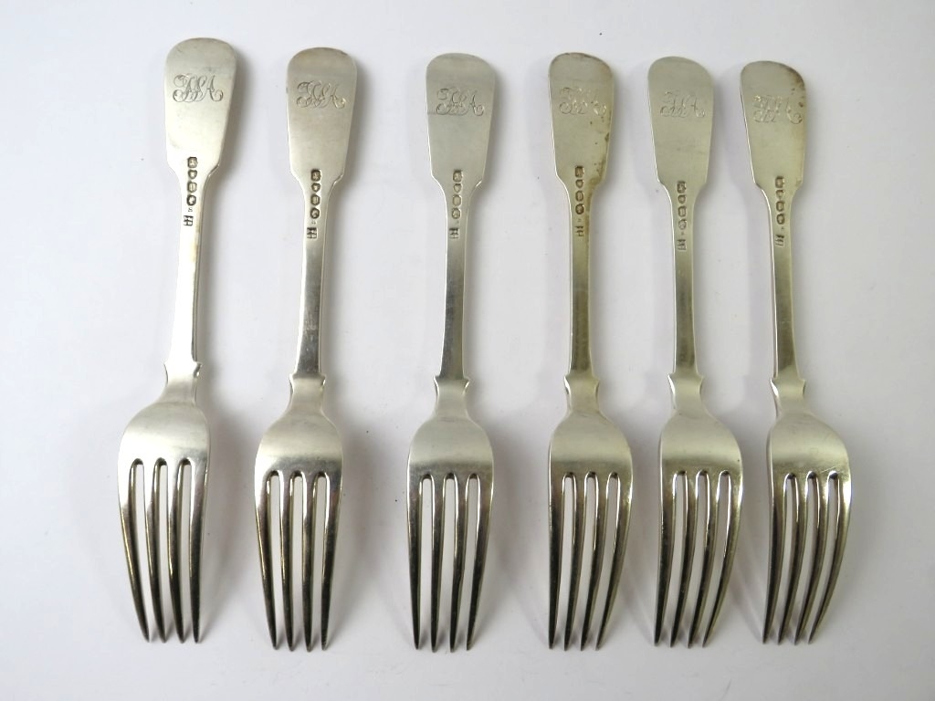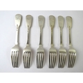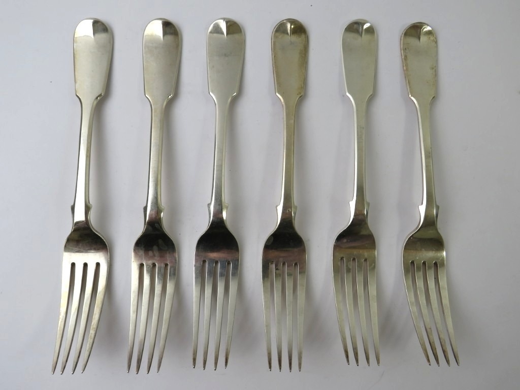 Set of six 19th century fiddle pattern table forks, hallmarked for London 1850, makers Joseph & Albert Savory. Length 20.5cm. Approx gross weight 482 grams. (6)