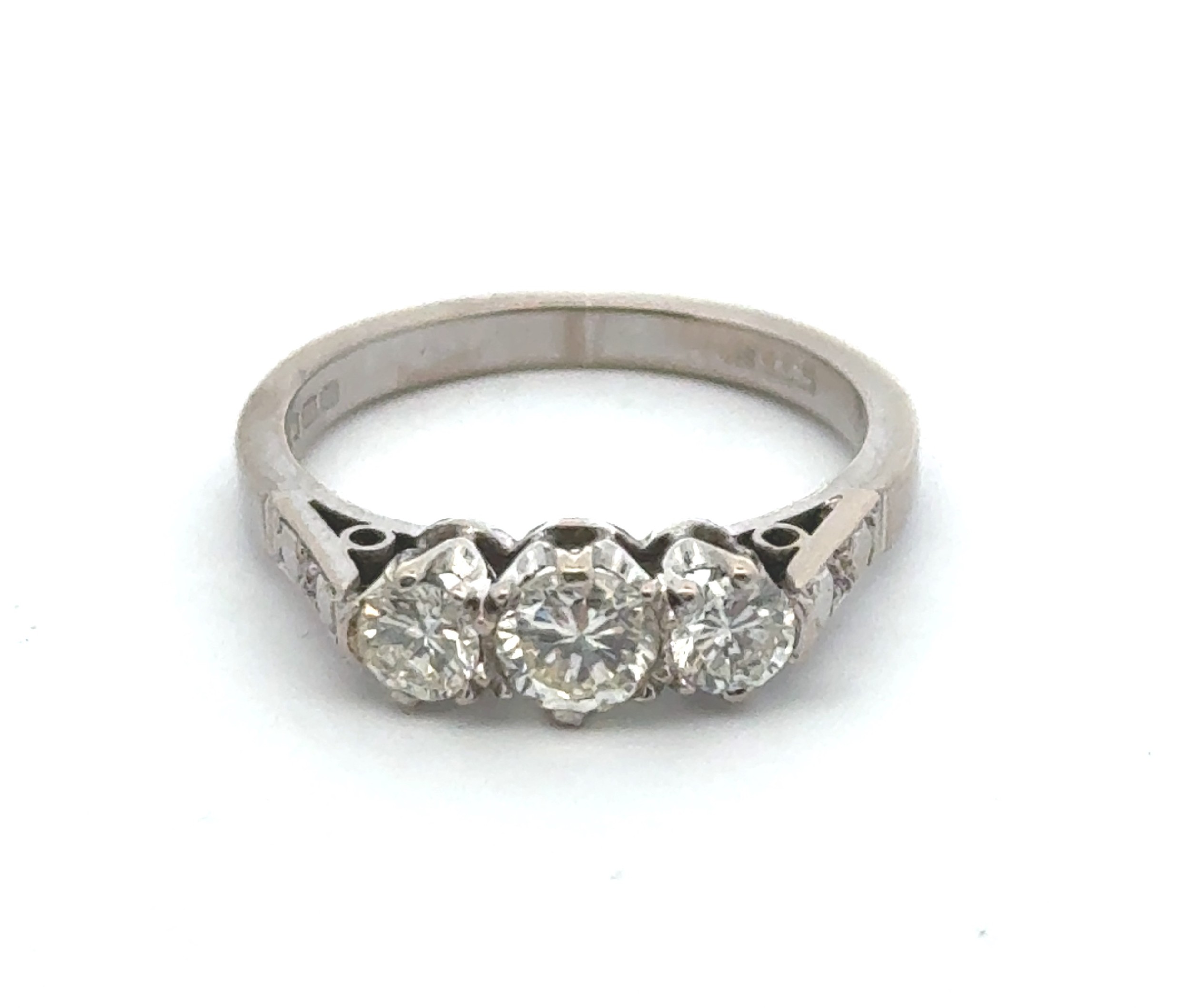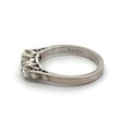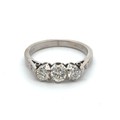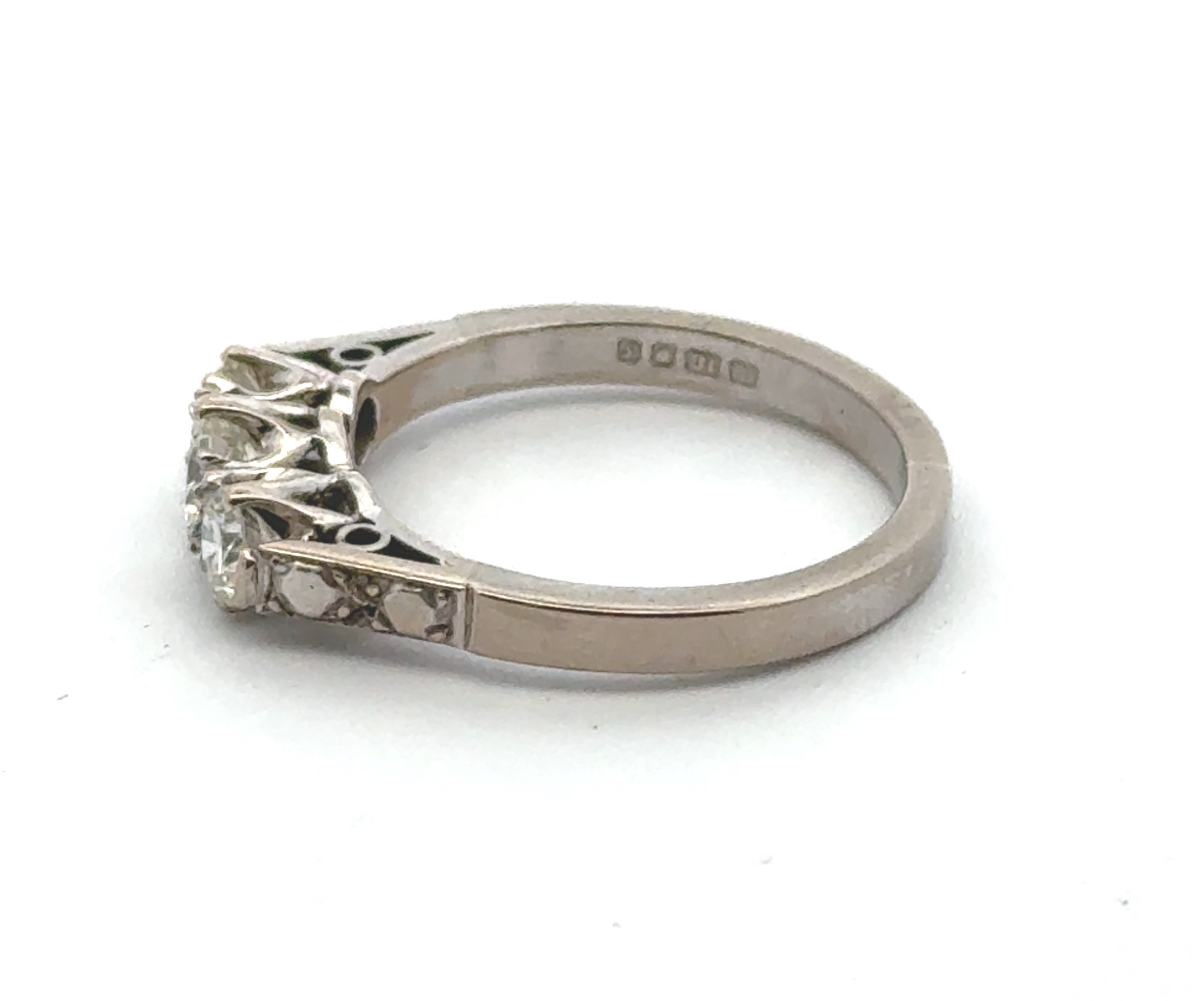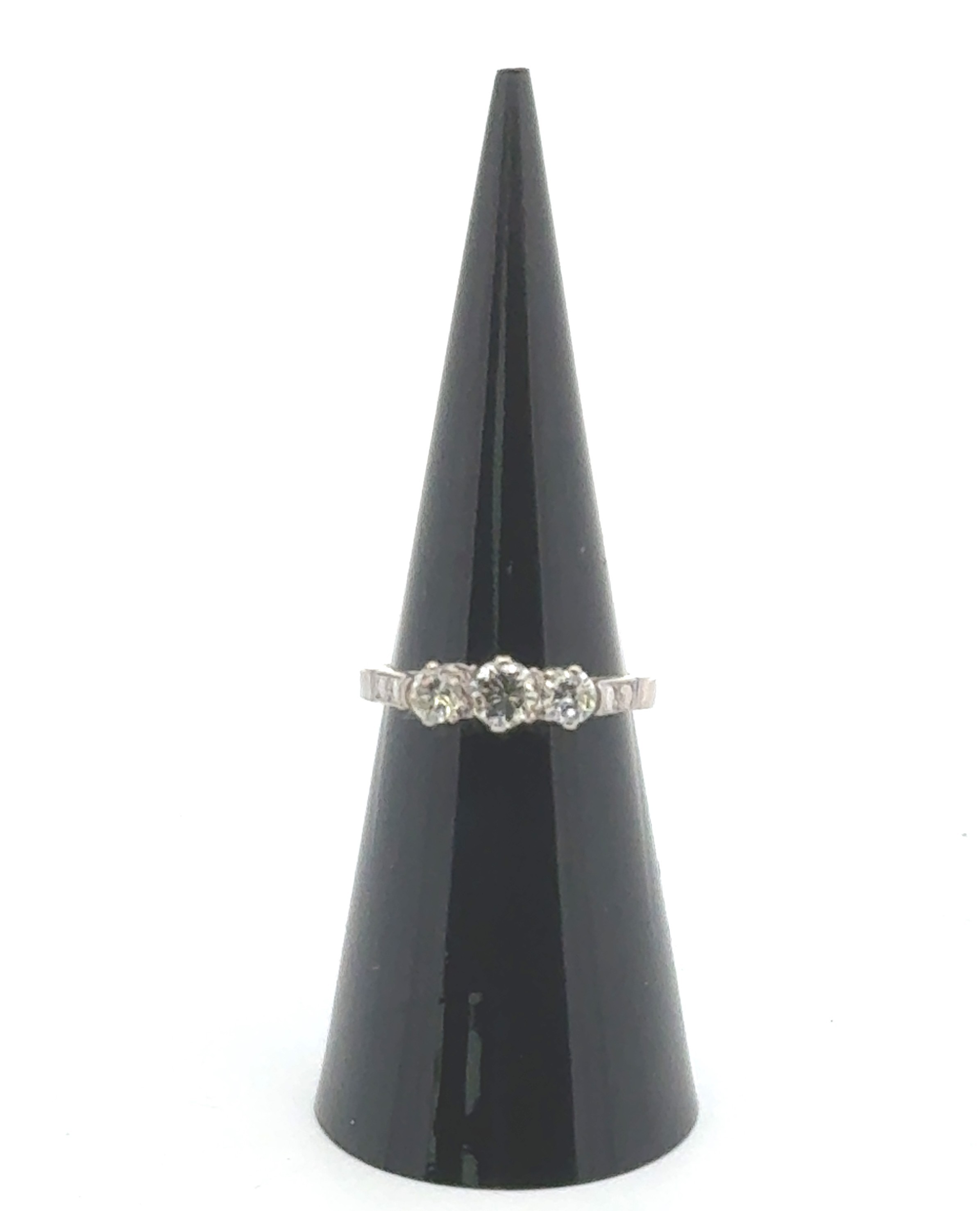 A three stone diamond ring in 18ct white gold, size J. 3.3g, Total diamond weight approx 0.55ct. Central diamond approx 0.25ct.