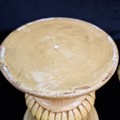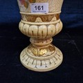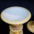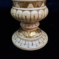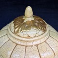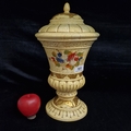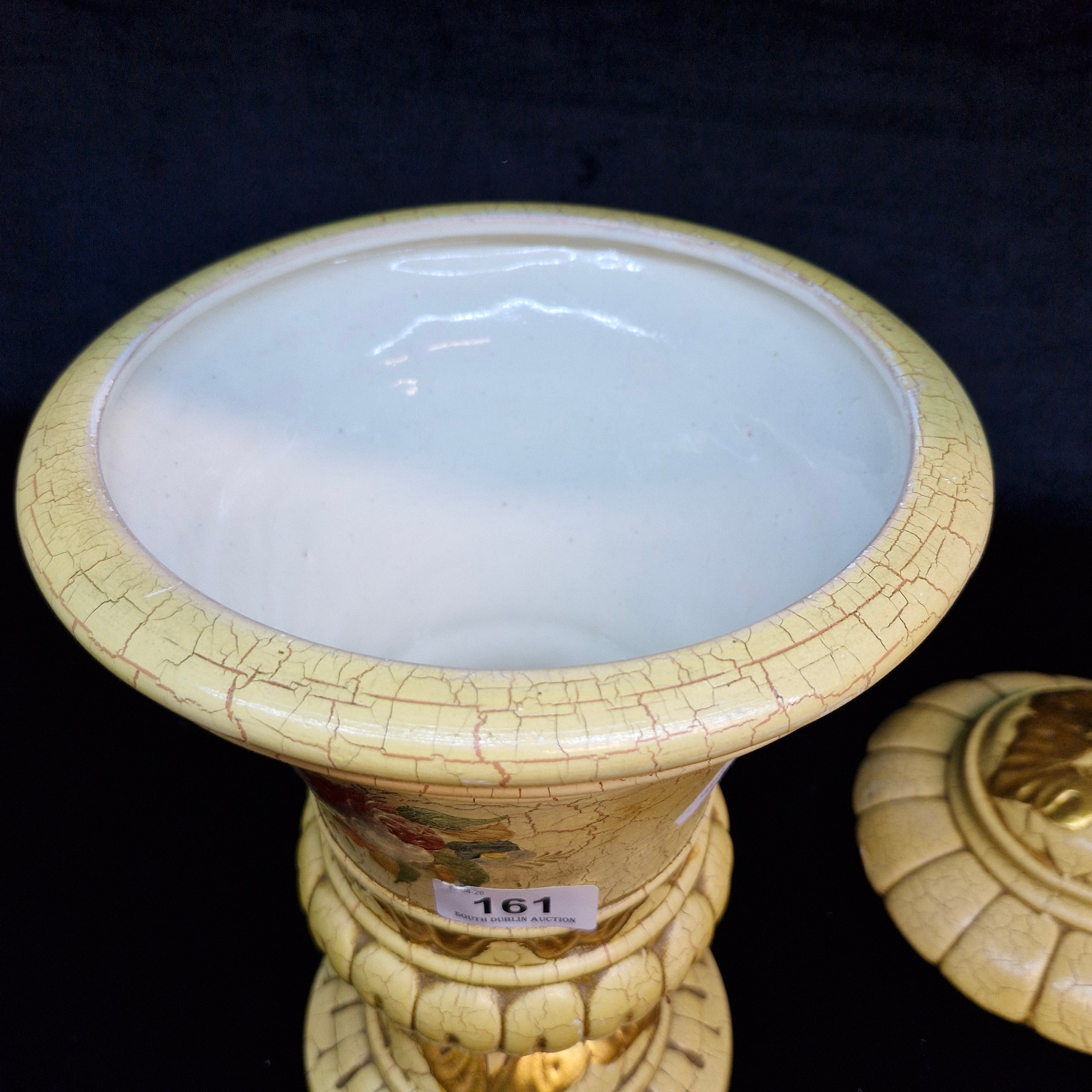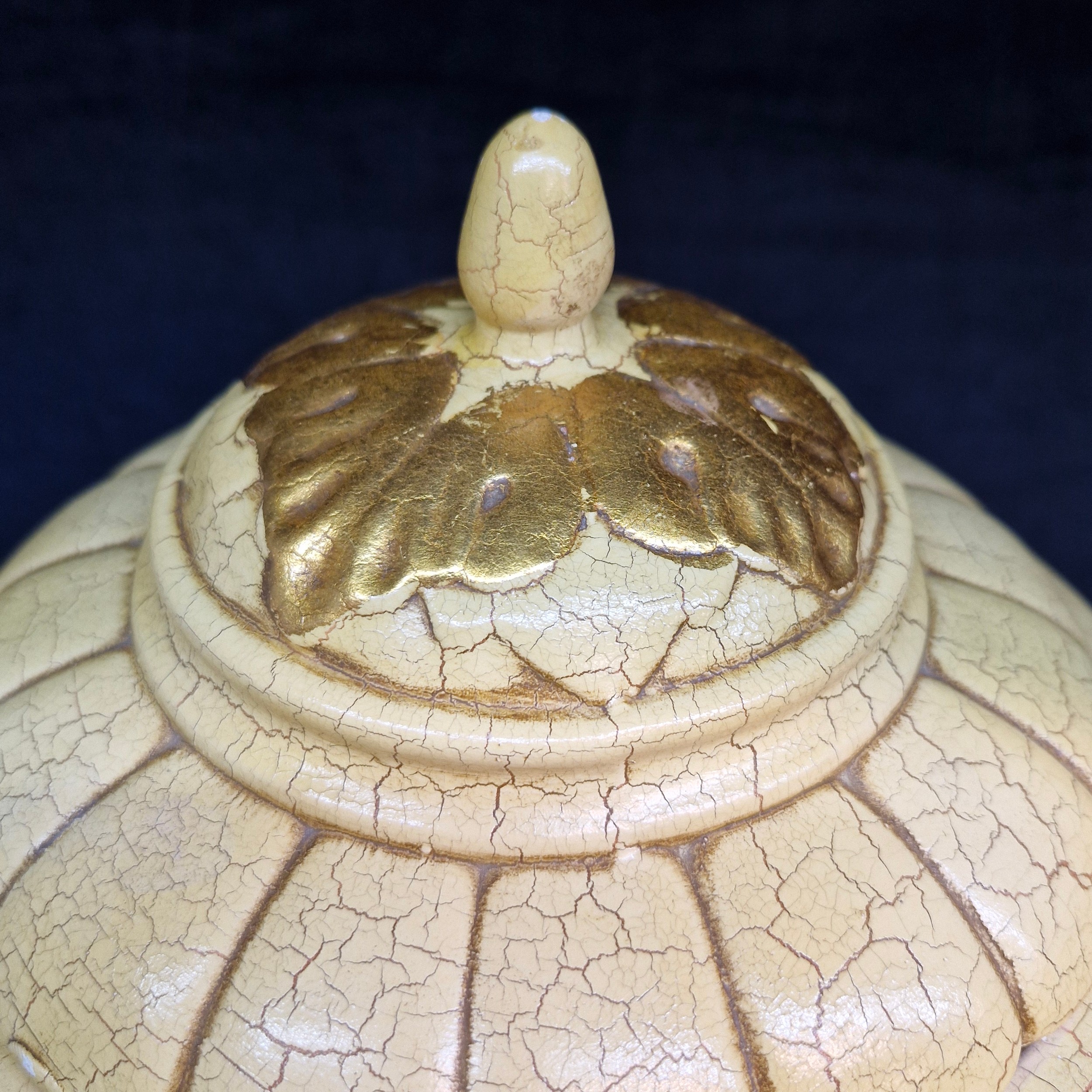 A large decorative ceramic vase with a lid featuring a distinct cream-coloured crackle glaze, gilded details and floral motifs with a footed base, bulbous body, ornamental lid, typical of classical urn-style decor. IN good condition.