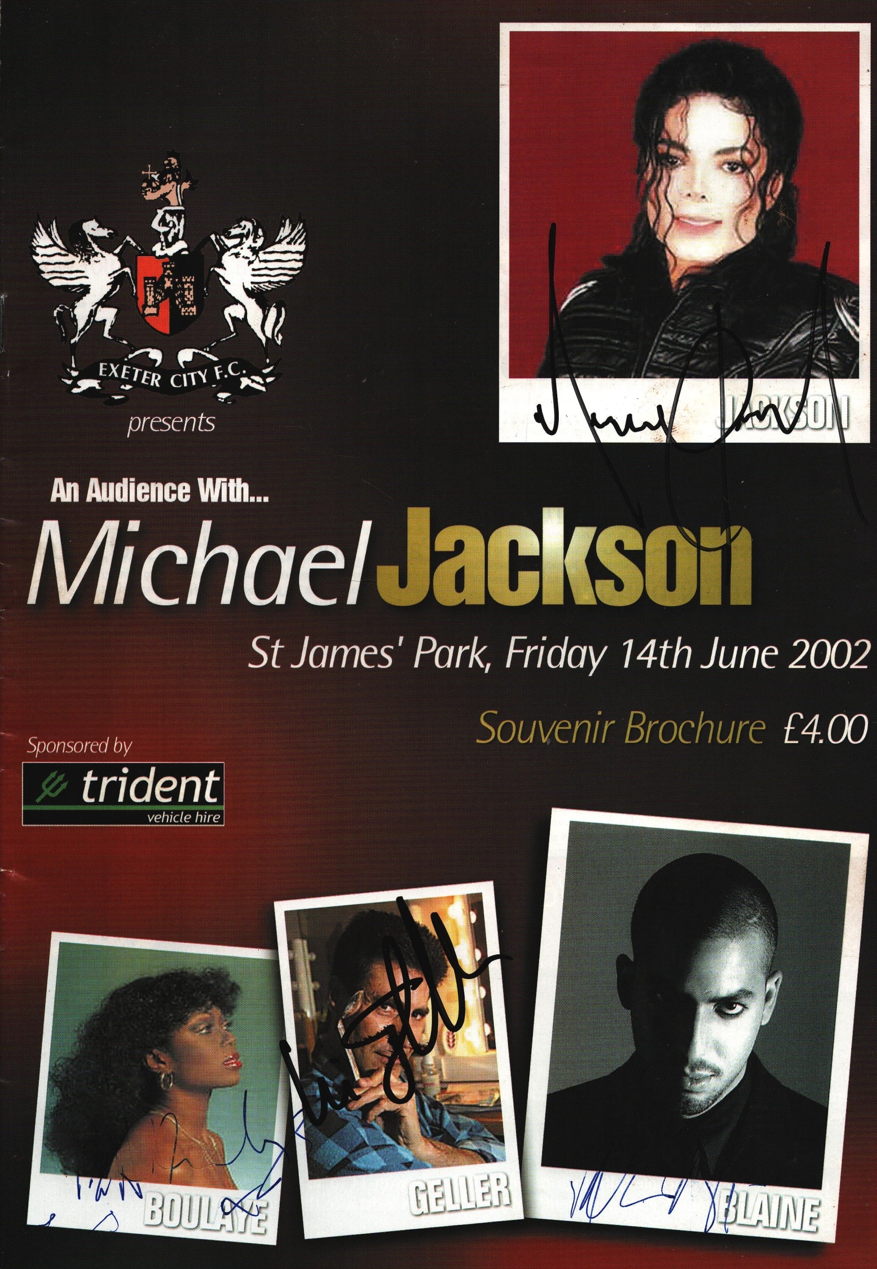 Michael Jackson signed souvenir brochure from June 2002, also includes Patti Boulaye, Uri Geller and David Blaine. All signed on front cover.