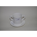 DECORATIVE DOUBLE HANDLED PORCELAIN CUP AND SAUCER