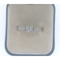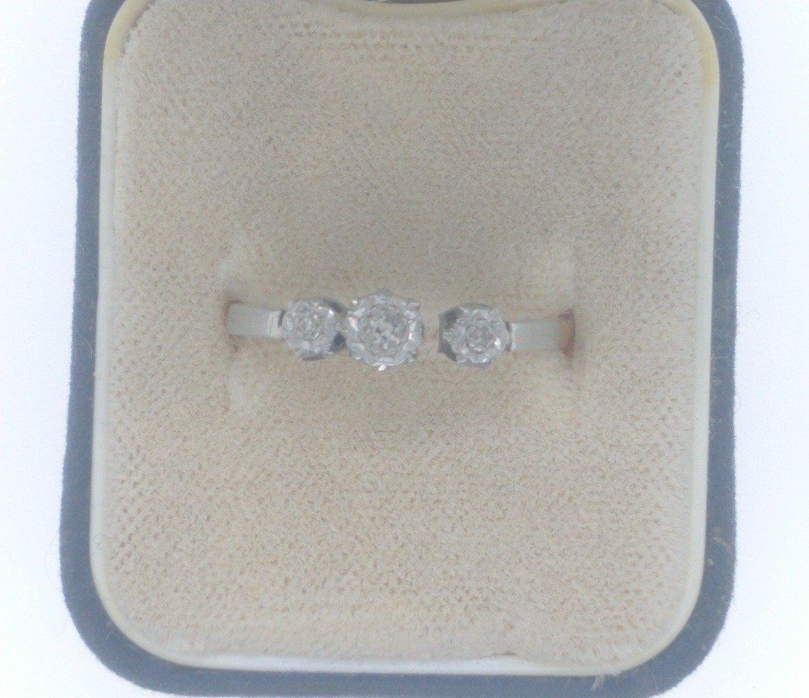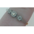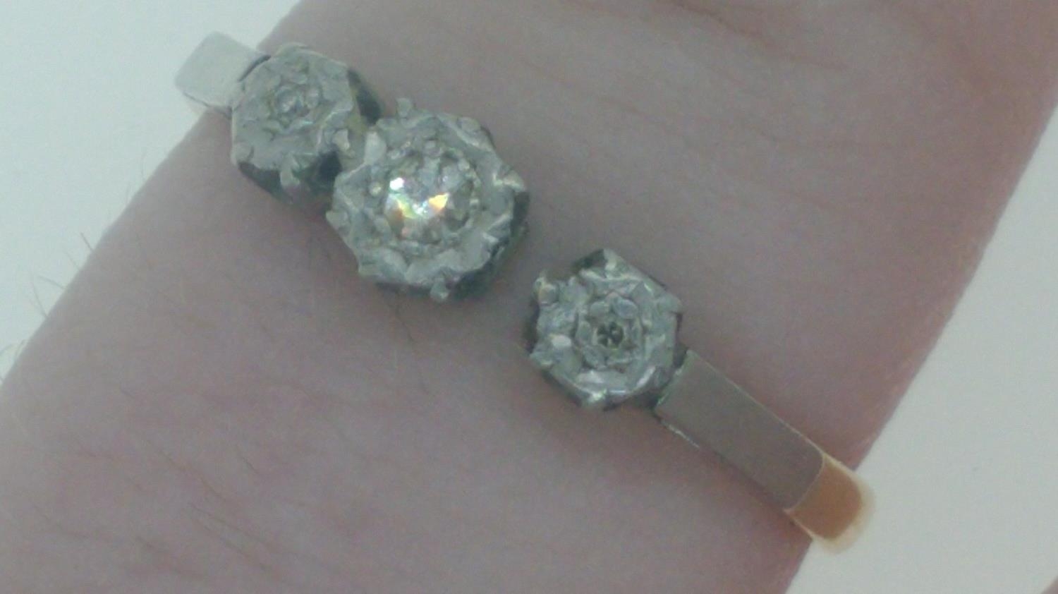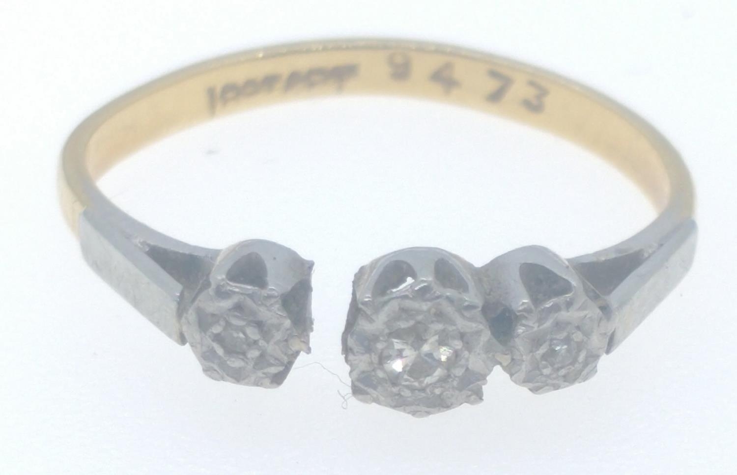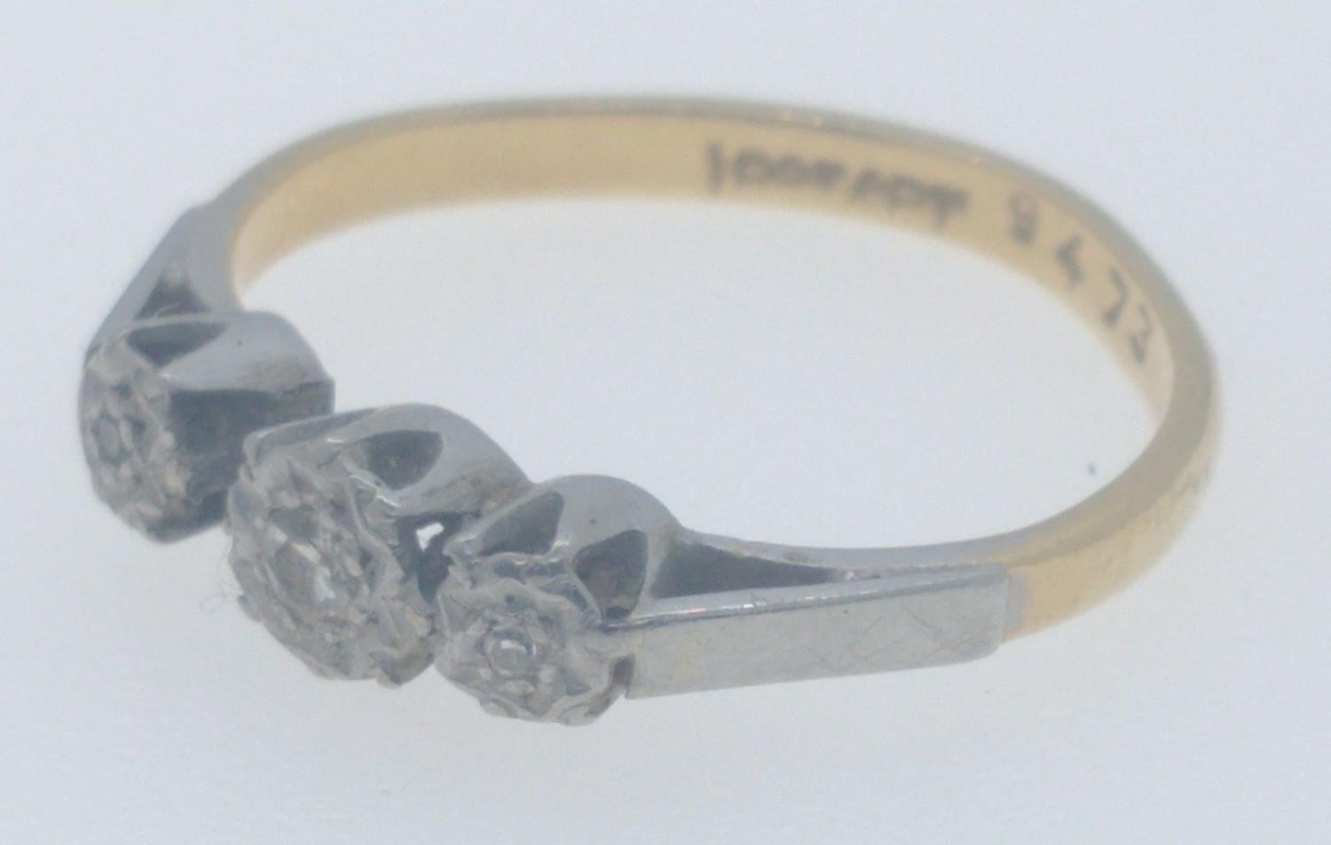 An 18ct stamped yellow gold engagement ring, set in platinum with three diamonds inset, the middle diamond is the larger flanked with two smaller diamonds (Diamonds tested) Ring size L (Point to note the ring requires a small repair to join the setting)