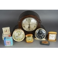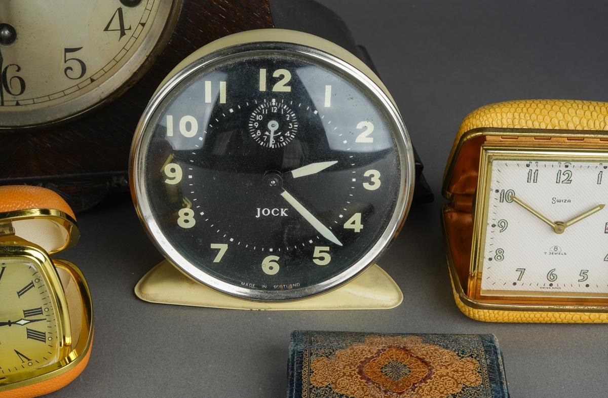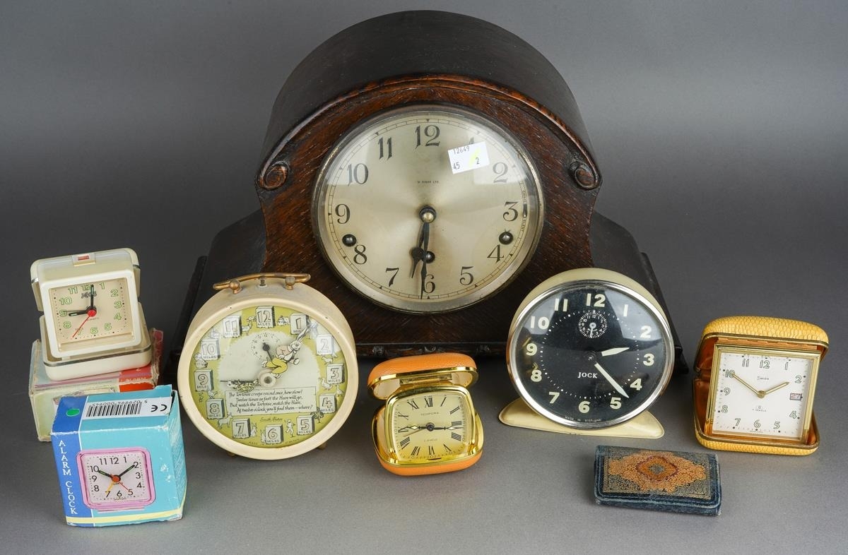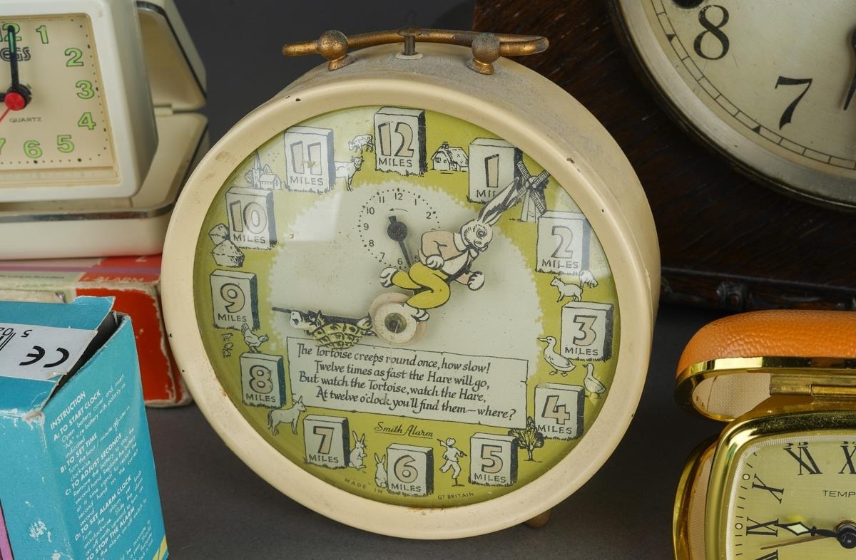 Assorted clocks to include: a 1950s Smith Alarm Hare and Tortoise alarm clock with verse and pictures; an Art Deco oak cased mantle clock, the dial stamped Garrard Clocks Ltd and W Hinds Ltd and two cased travelling clocks [Swiza and Tempora], a Jock Alarm clock etc [7 clocks]