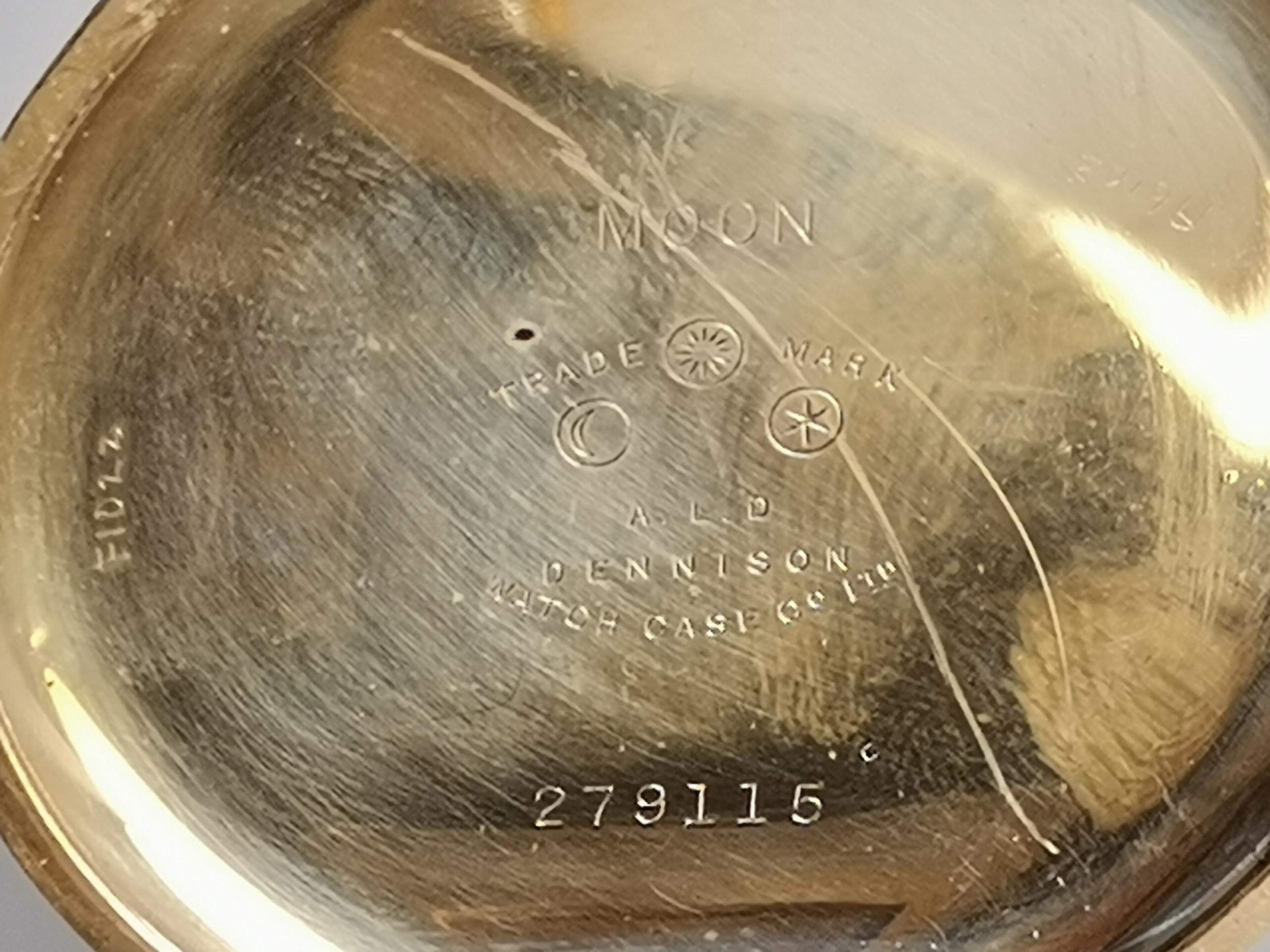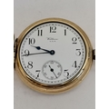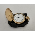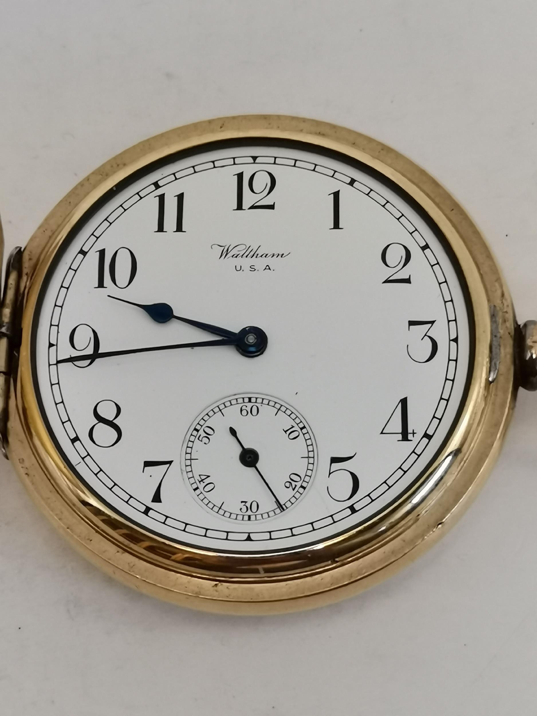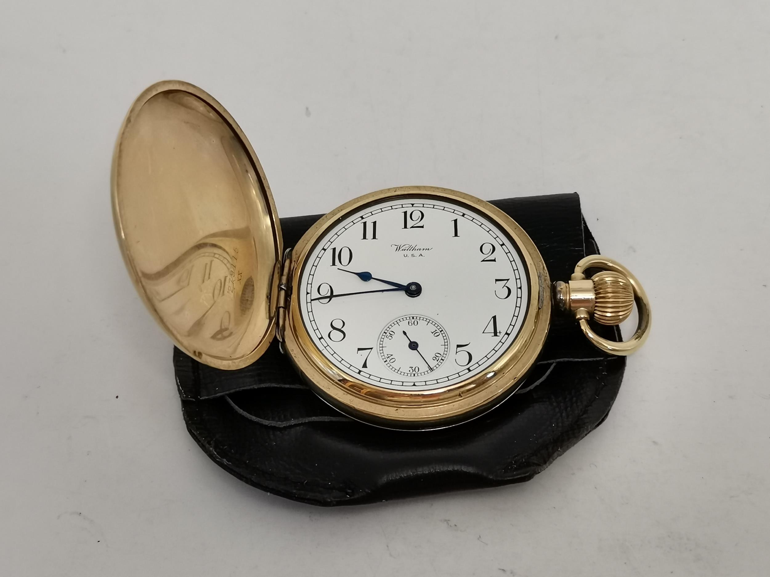 A gold-plated Waltham USA Traveler full hunter pocket watch, the cream enamel dial signed, with black Arabic numerals, blued steel hands, subsidiary seconds dial at 6 o'clock, marked ALD Dennison Watch Case Co. Ltd. to inside of outer case, stamped 10CT gold plate to inside of inner case, all three covers numbered 279115, movement signed A.W.W. Co. Waltham USA Traveler and numbered 27132585