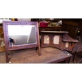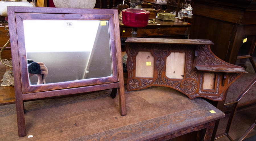 NEAT EDWARDIAN INLAID TOILET MIRROR 37 X 41 CM + UNUSUAL CARVED WALL HANGING PHOTO FRAME WITH SHELF 50 X 25CM
