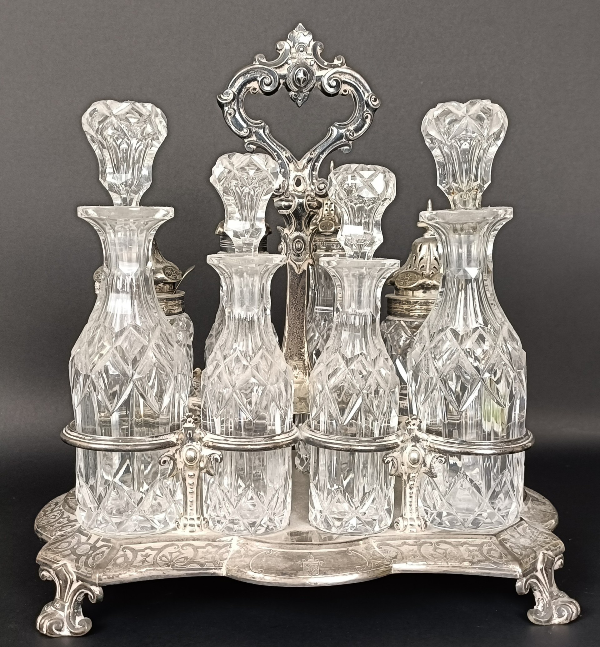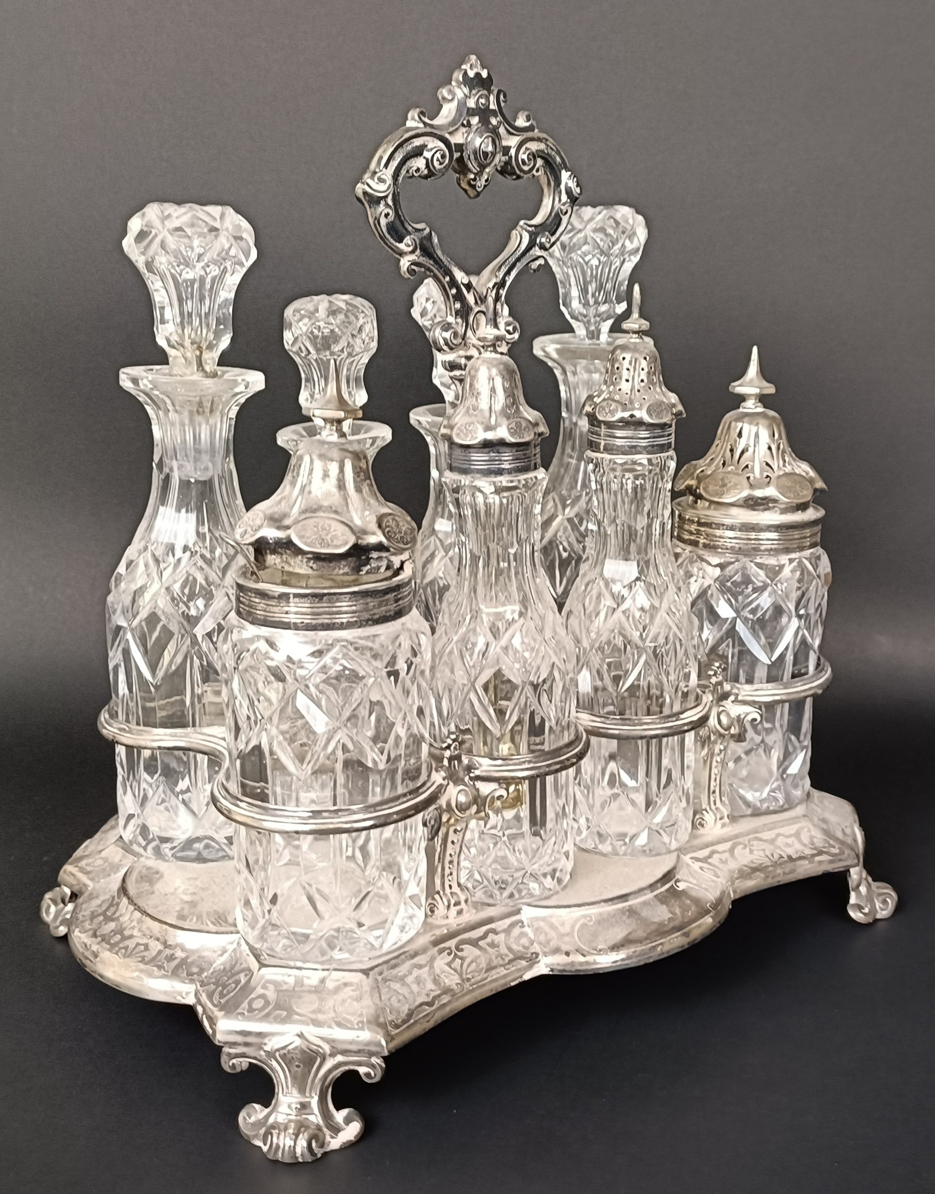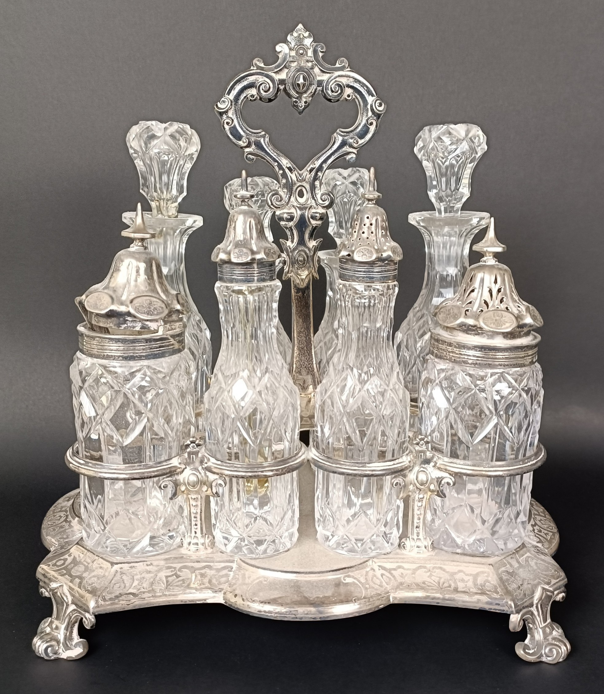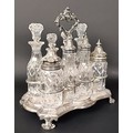 A Victorian silver and cut glass eight piece cruet stand, London 1860, stand 28.5 ozt