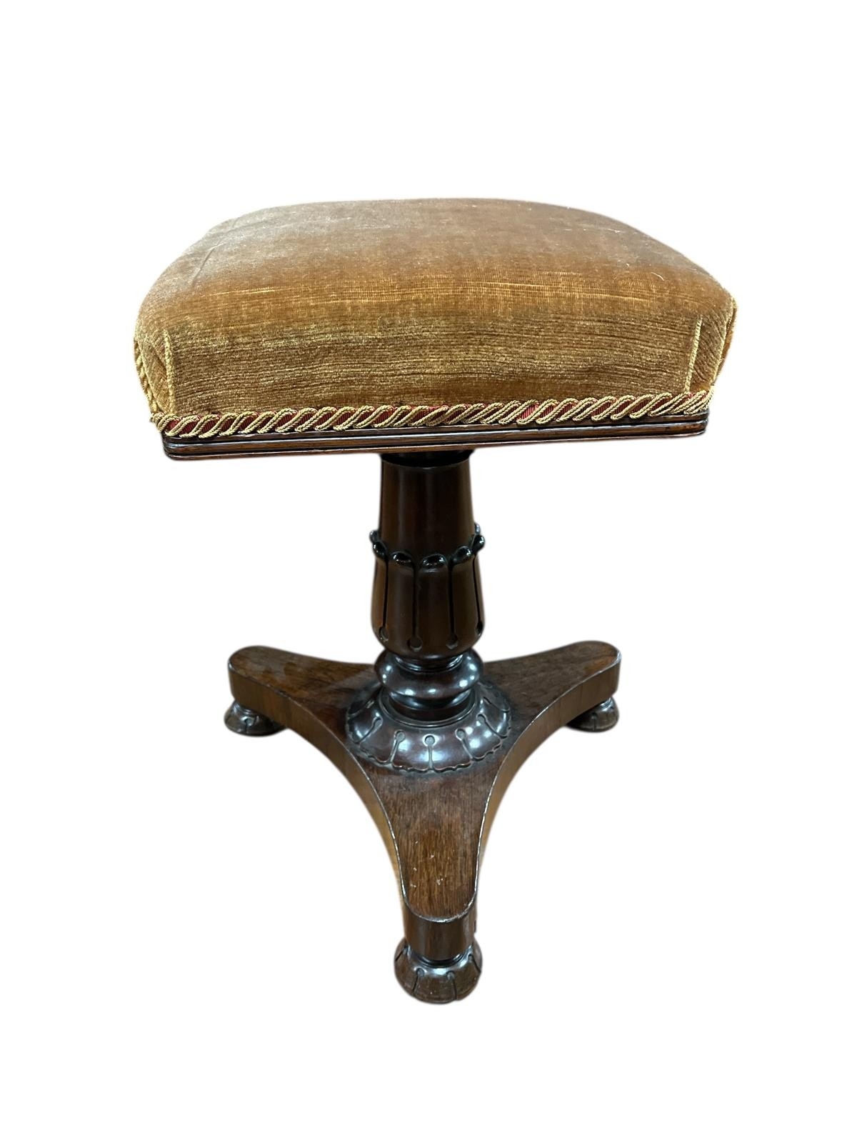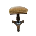 A 19TH CENTURY ROSEWOOD REVOLVING STOOL the square upholstered seat above a leaf capped column on shaped platform base with bun feet and castors 51cm (h) x 34cm (w) x 34cm (d)