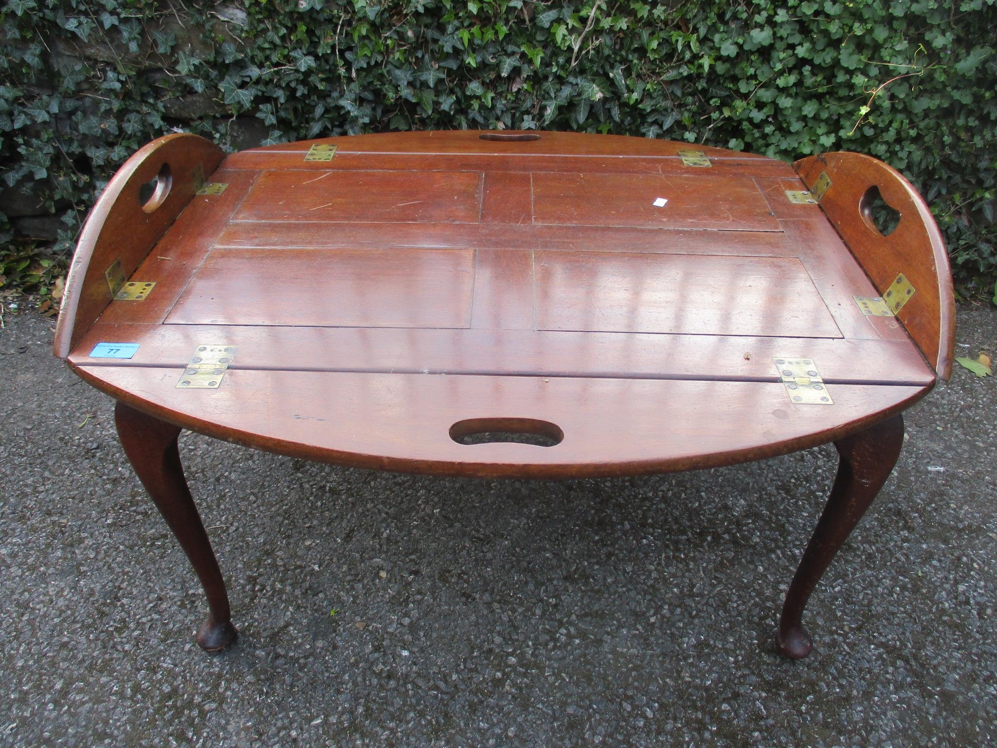 A 19th century mahogany butler's tray on a later oak base 51cm h x 78cm w