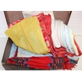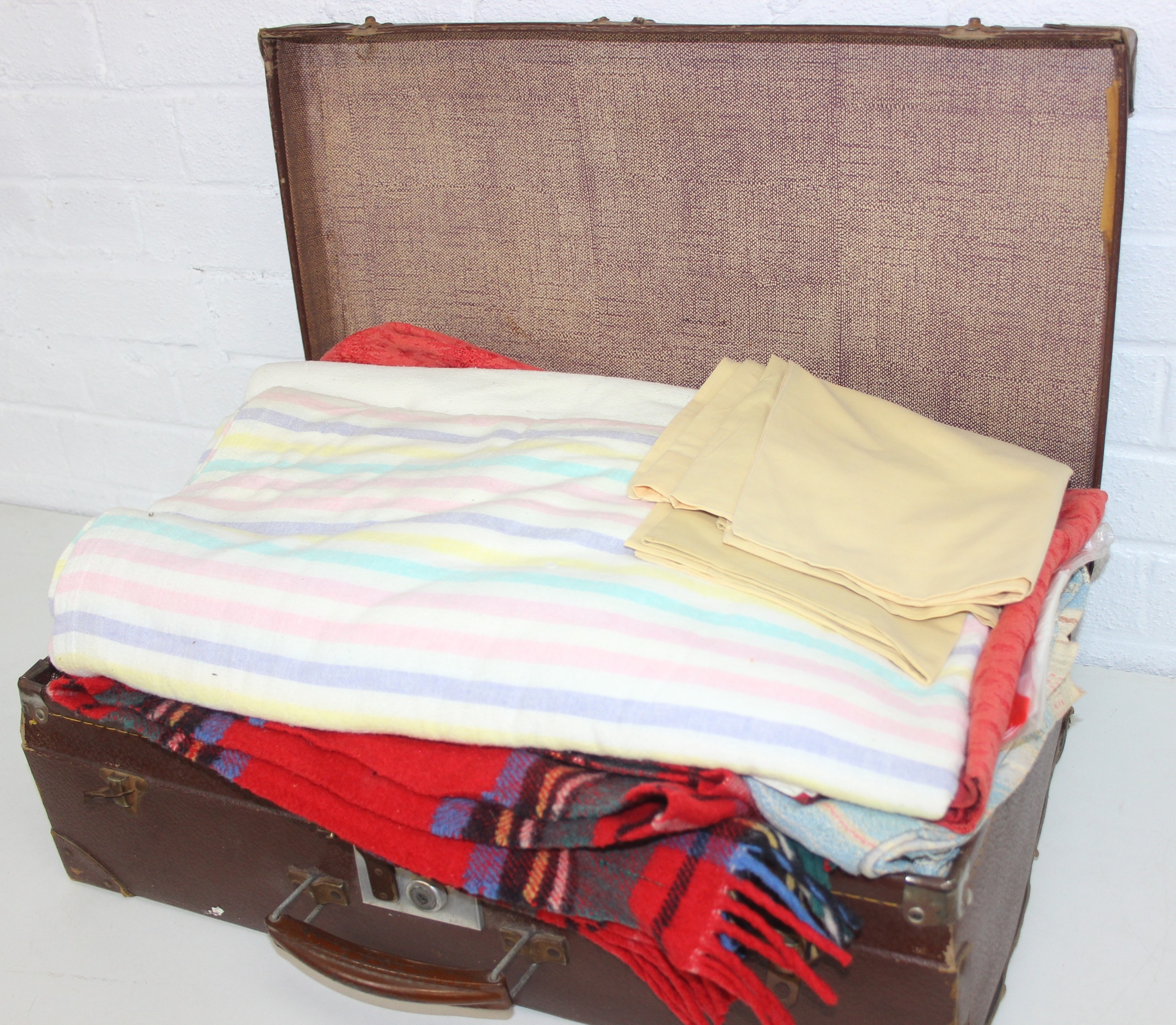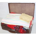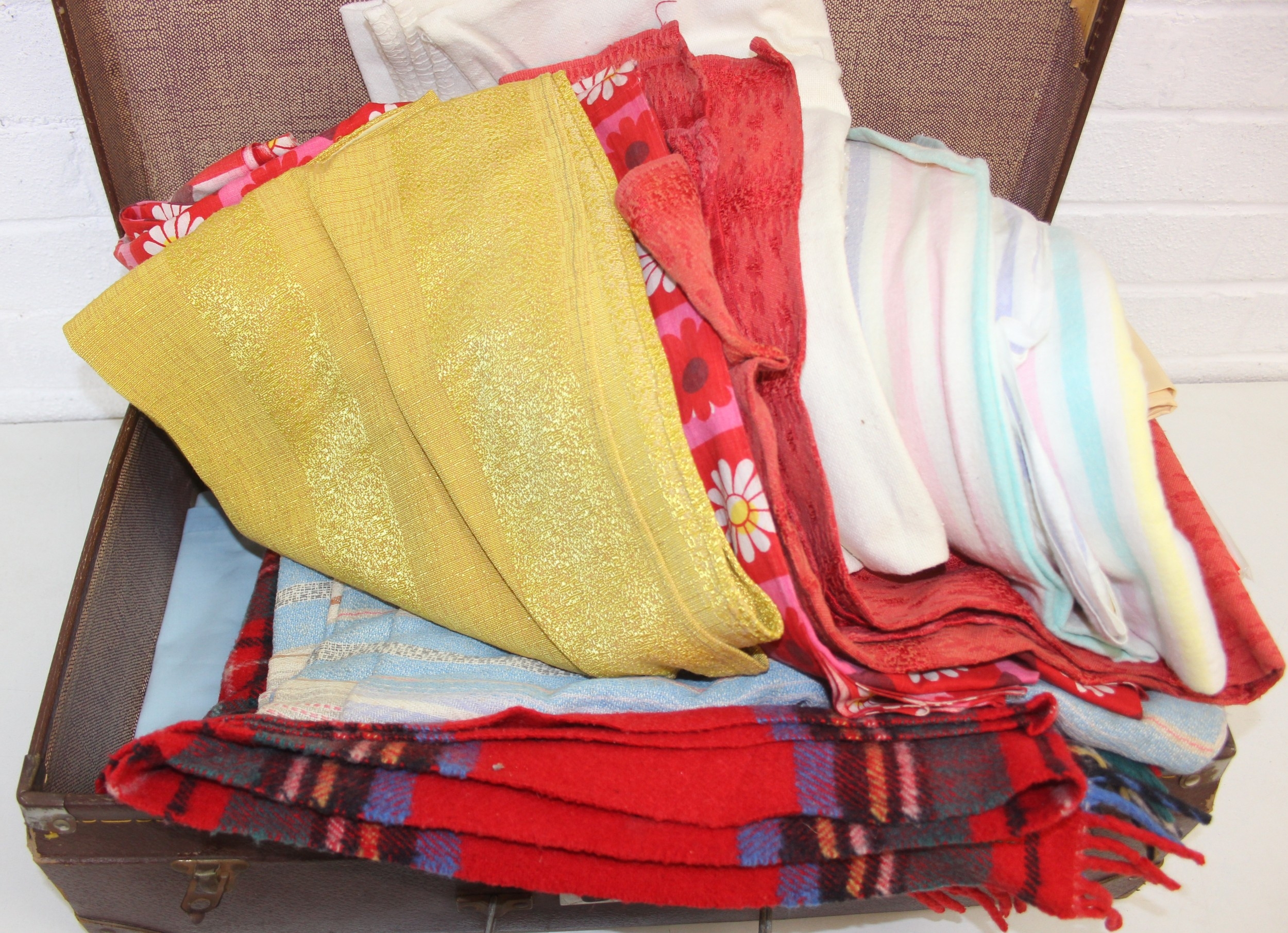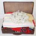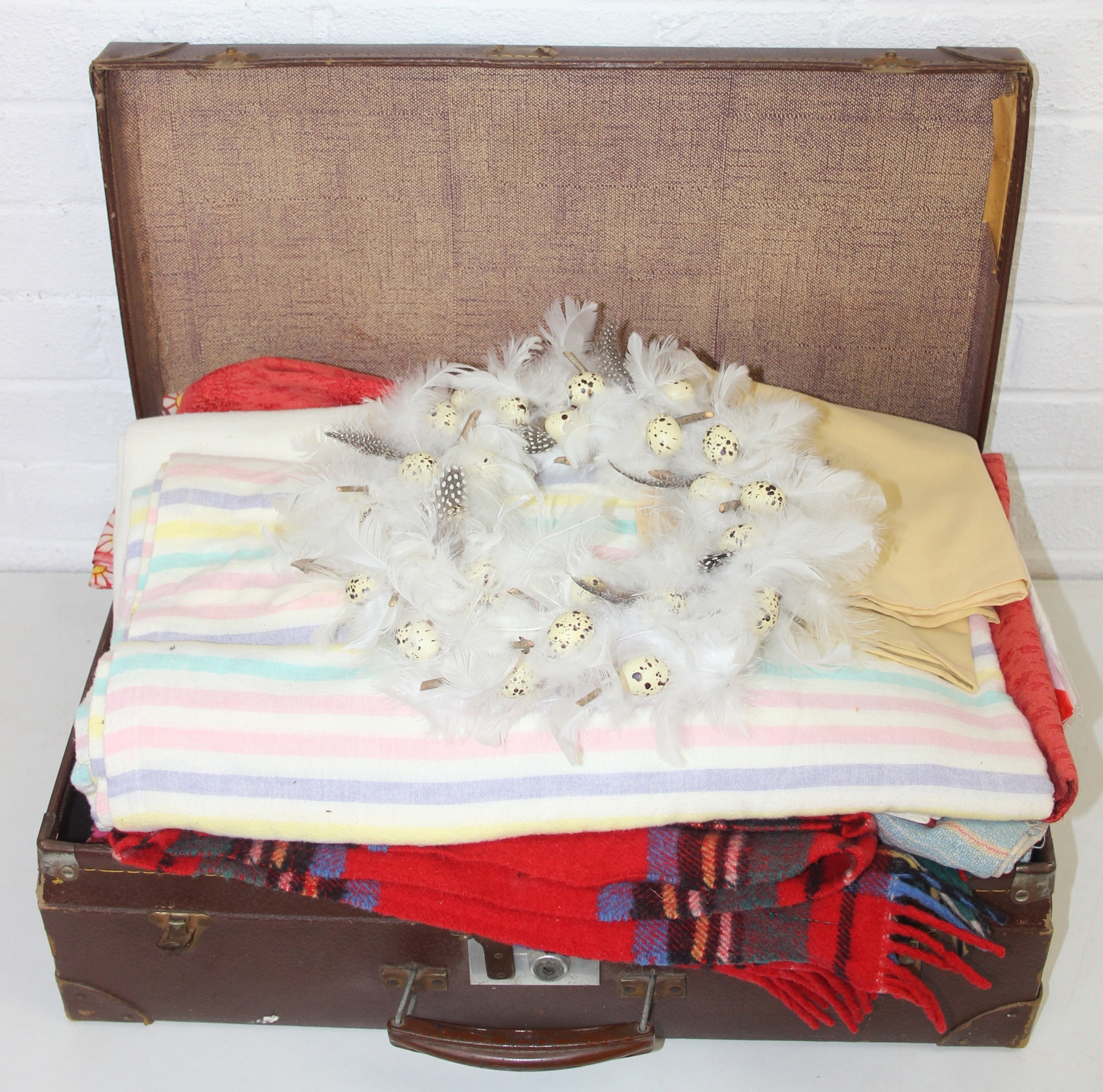 A vintage suitcase containing retro fabrics, tartan blanket, and a faux bird egg and feather wreath [2 boxes]
