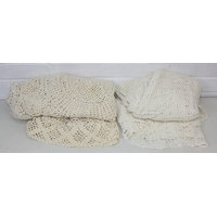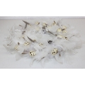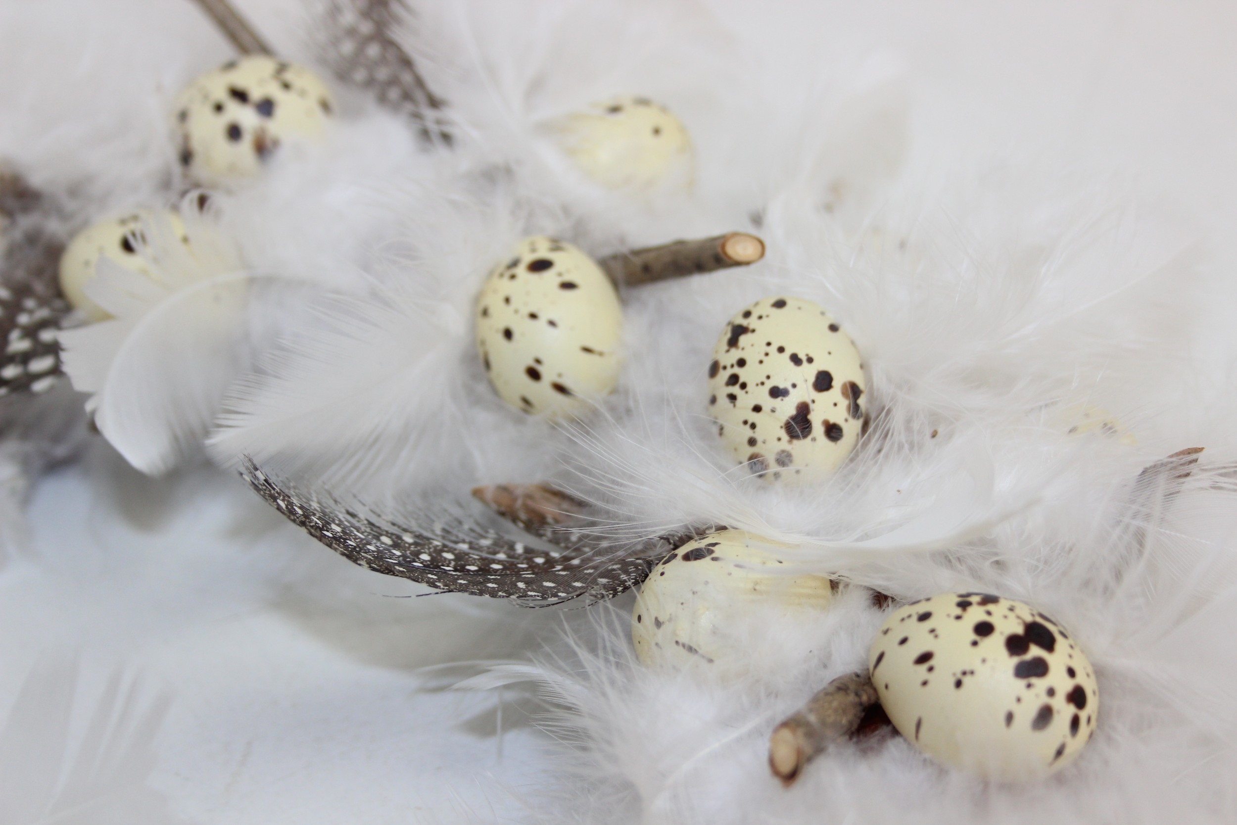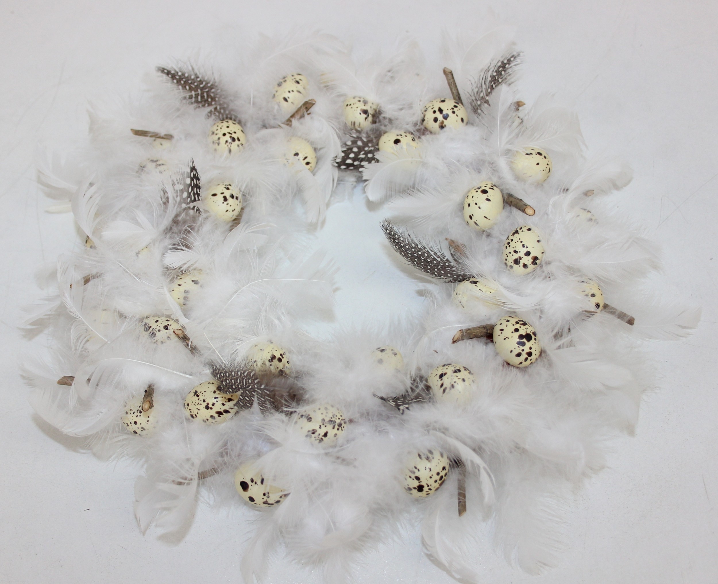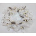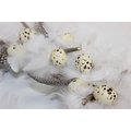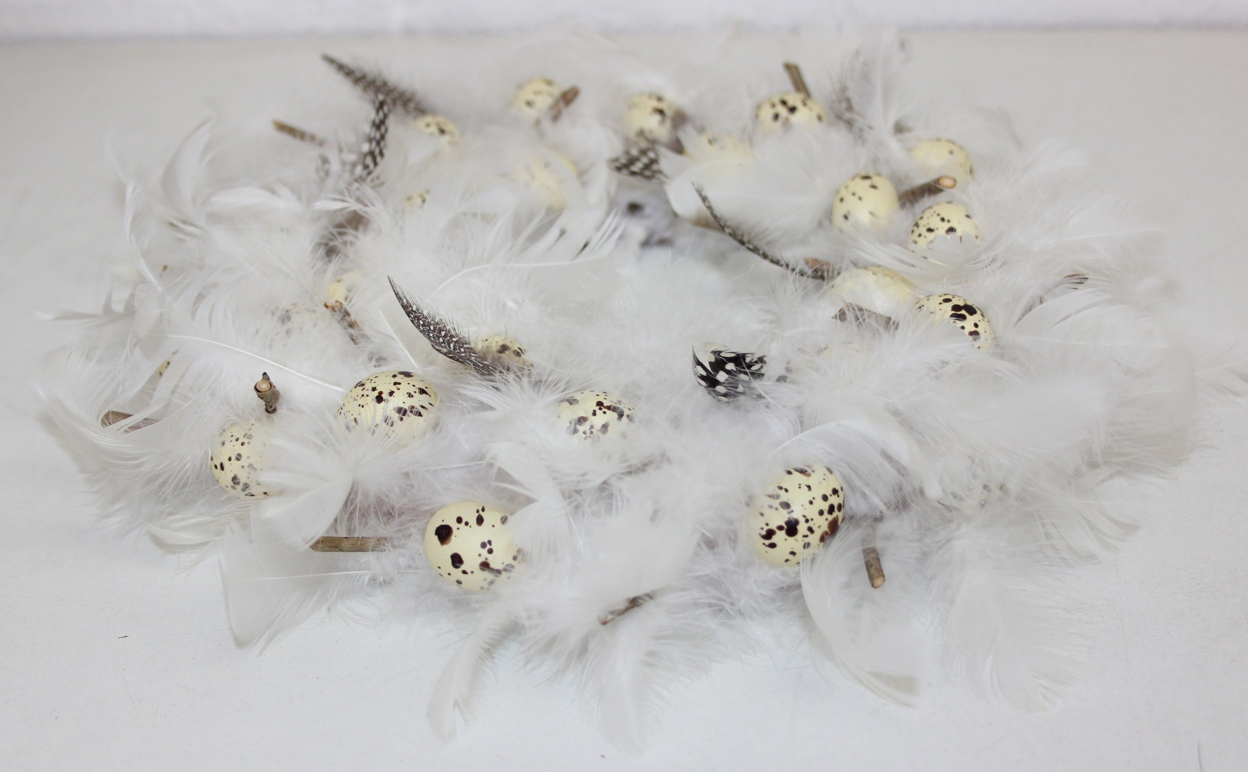 A vintage suitcase containing retro fabrics, tartan blanket, and a faux bird egg and feather wreath [2 boxes]