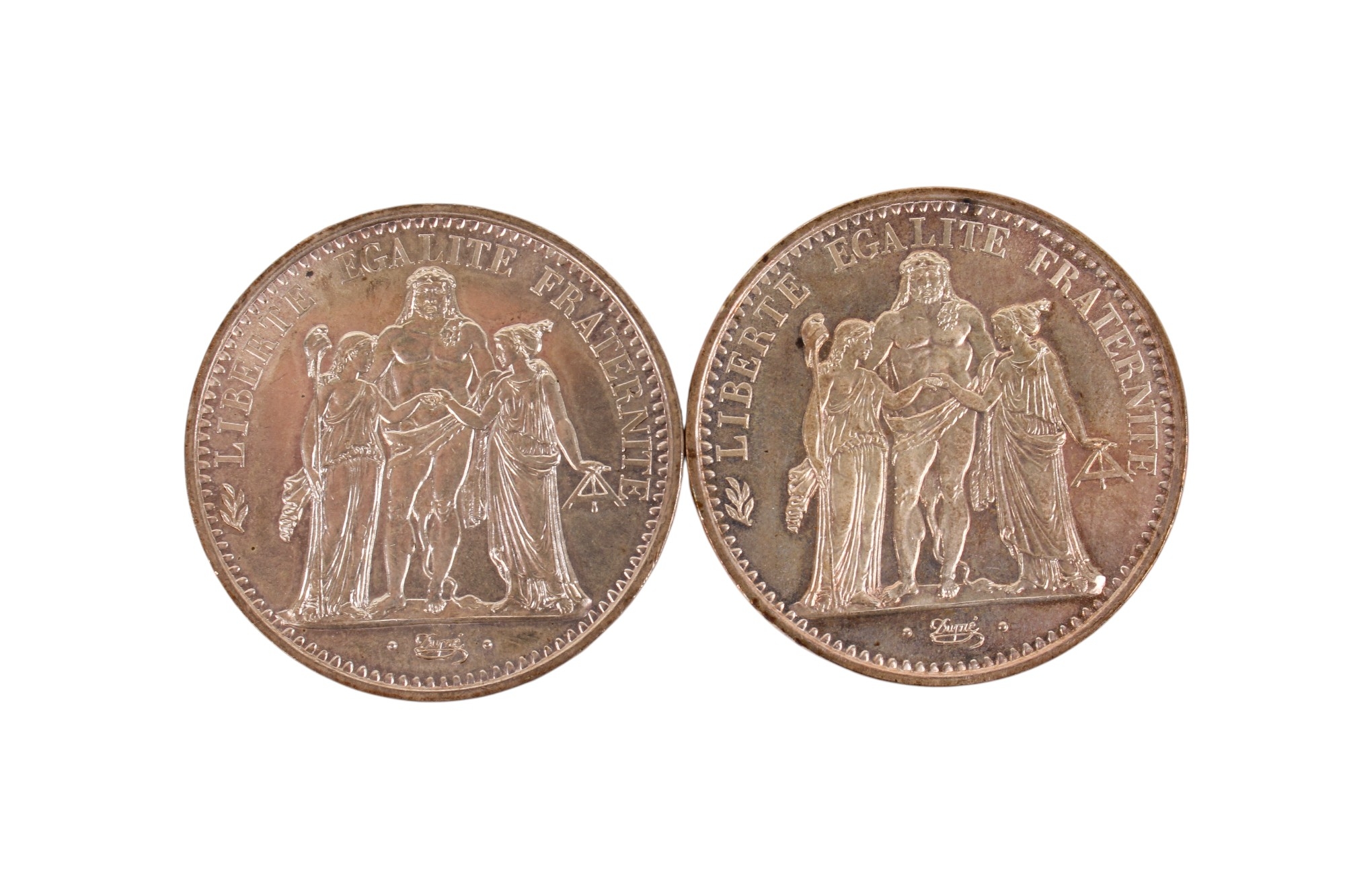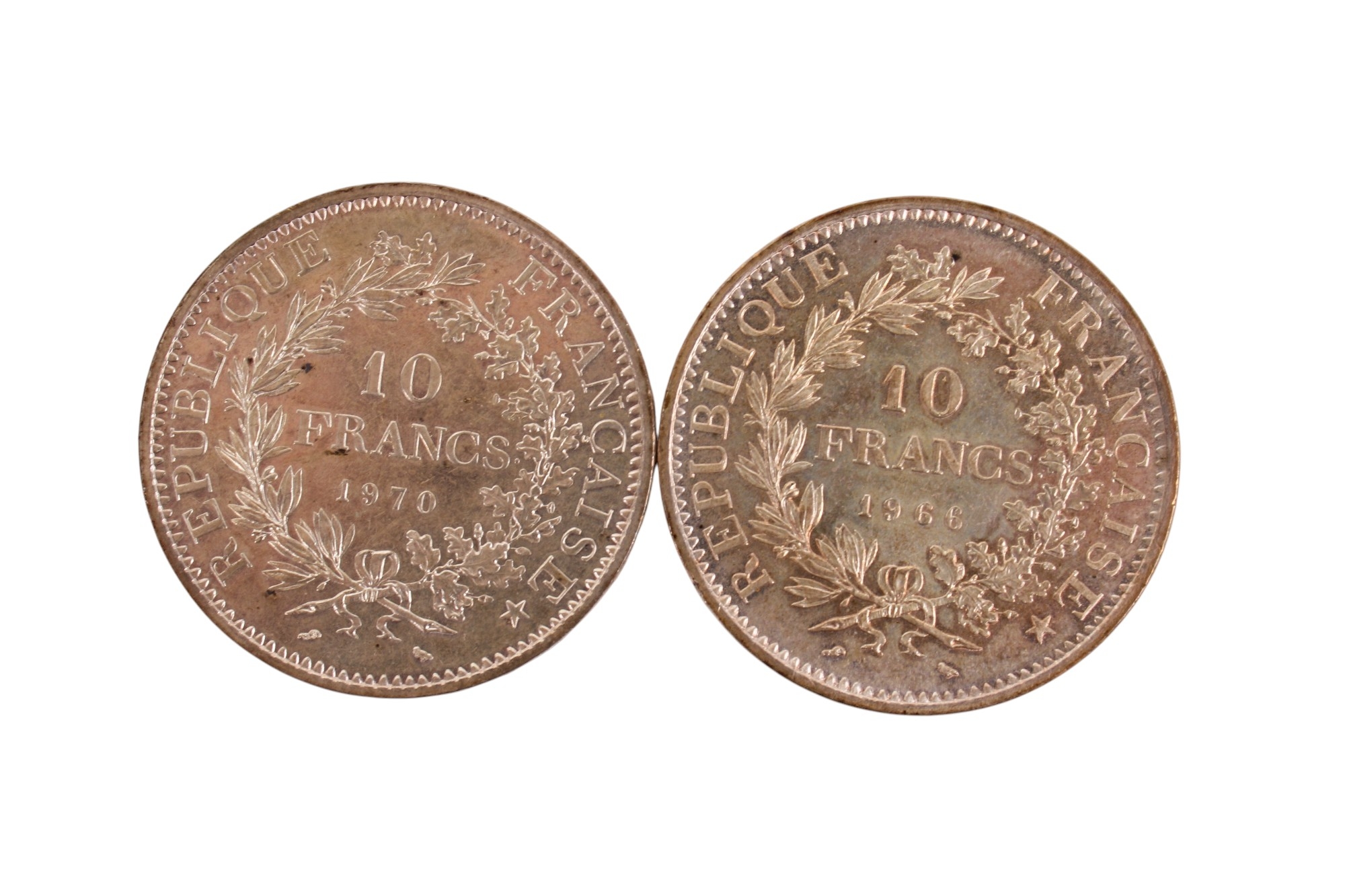 Two silver 10 franc coins, dated 1966 and 1970.