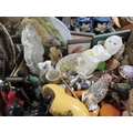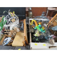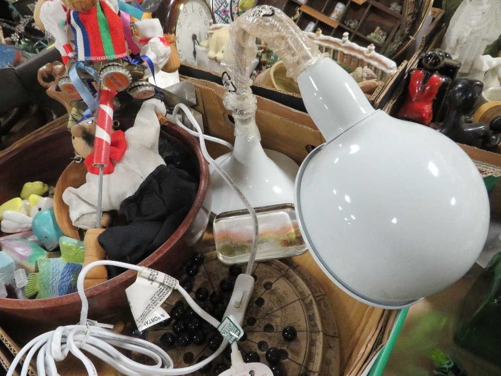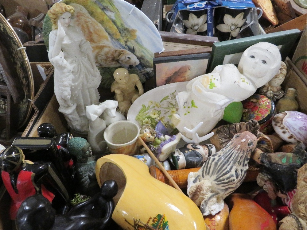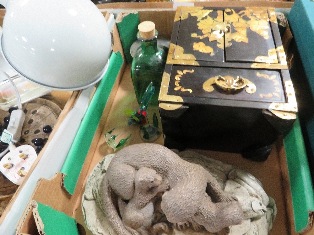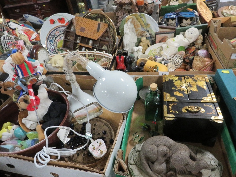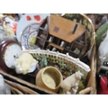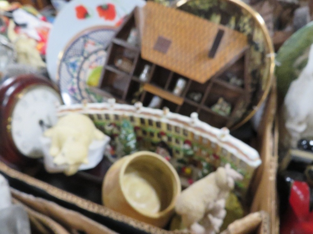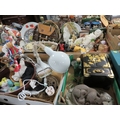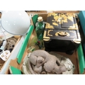 Four trays of assorted ceramics and collectables to include jewellery box, thimbles etc