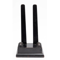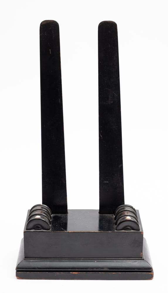A Regency period ebonised wood charger stand: the pair of supporting struts inserted in a rectangular base, with bobbin turned stops on a rectangular plinth base, 45.5cm high.