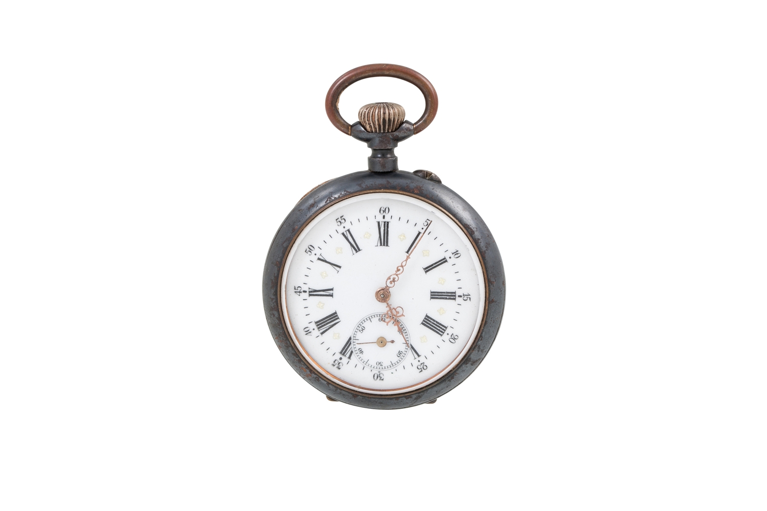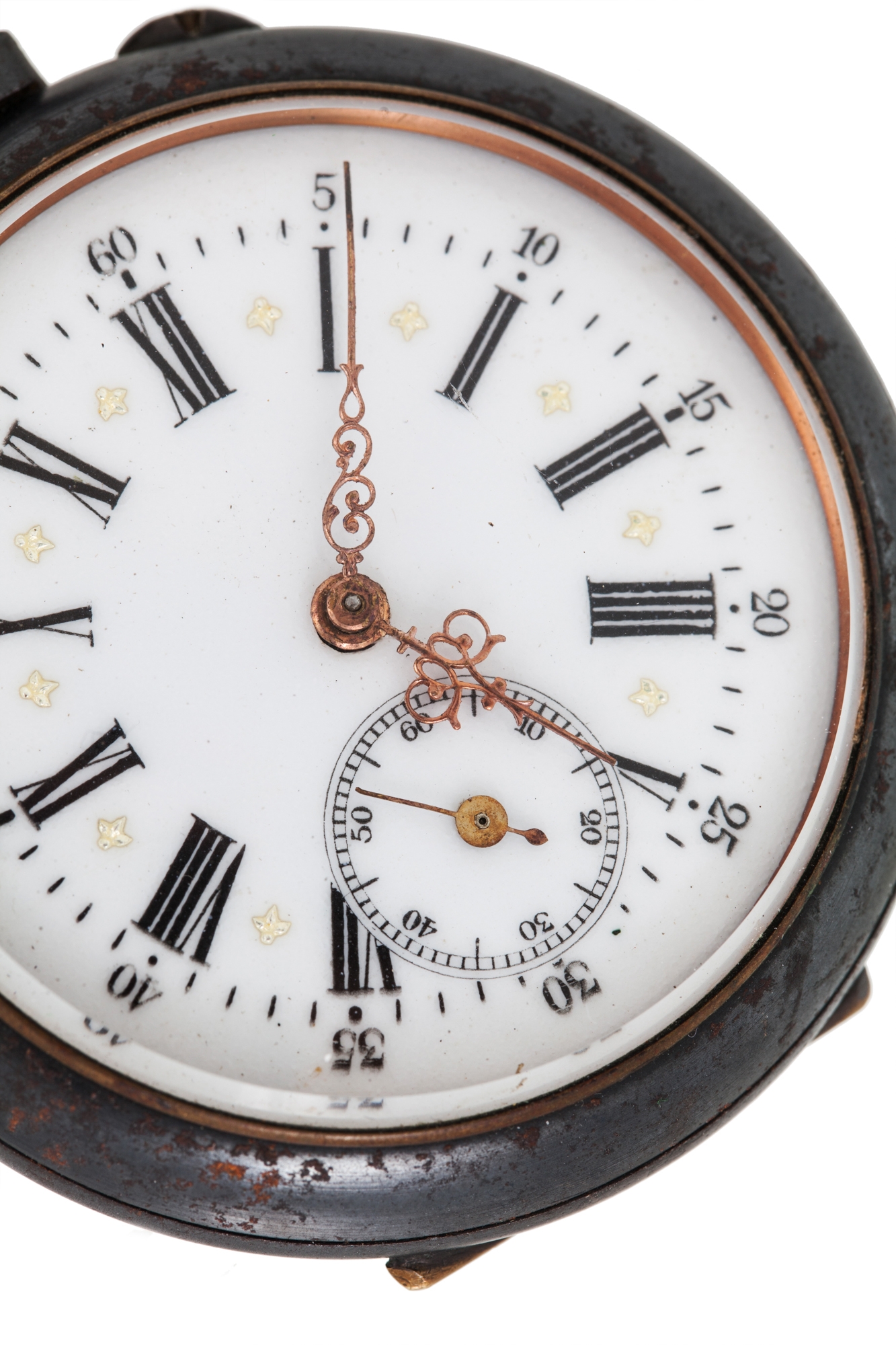 AN ANTIQUE IRON CLAD POCKET WATCH, Roman numerals