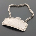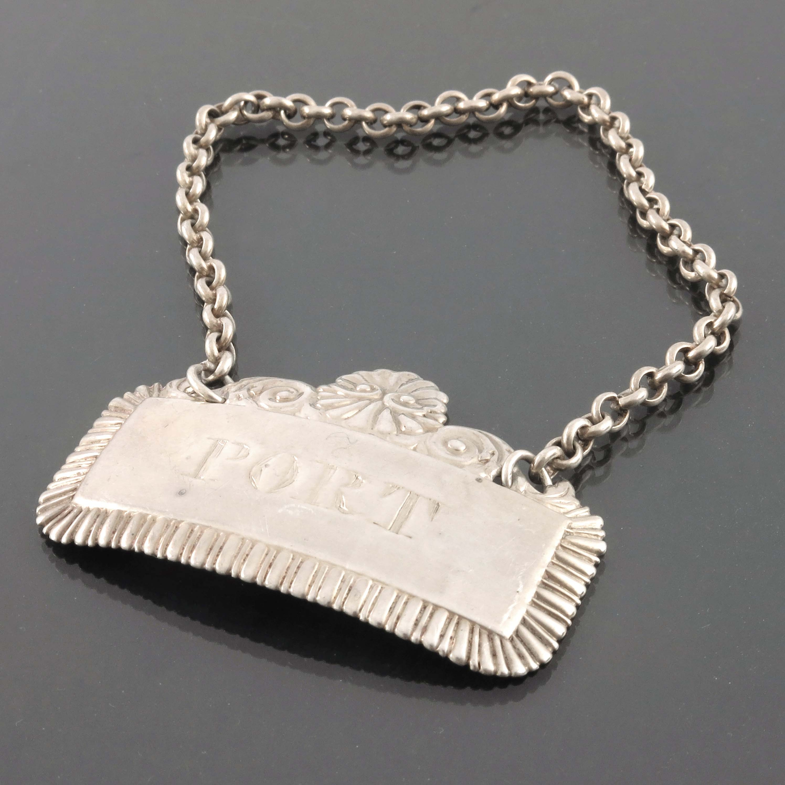 A George III silver wine label for Port, Matthew Linwood, Birmingham 1816, gadrooned rectangular form with embossed scroll and shell surmount, suspended on a rolo chain, 5.3cm wide, 0.43ozt