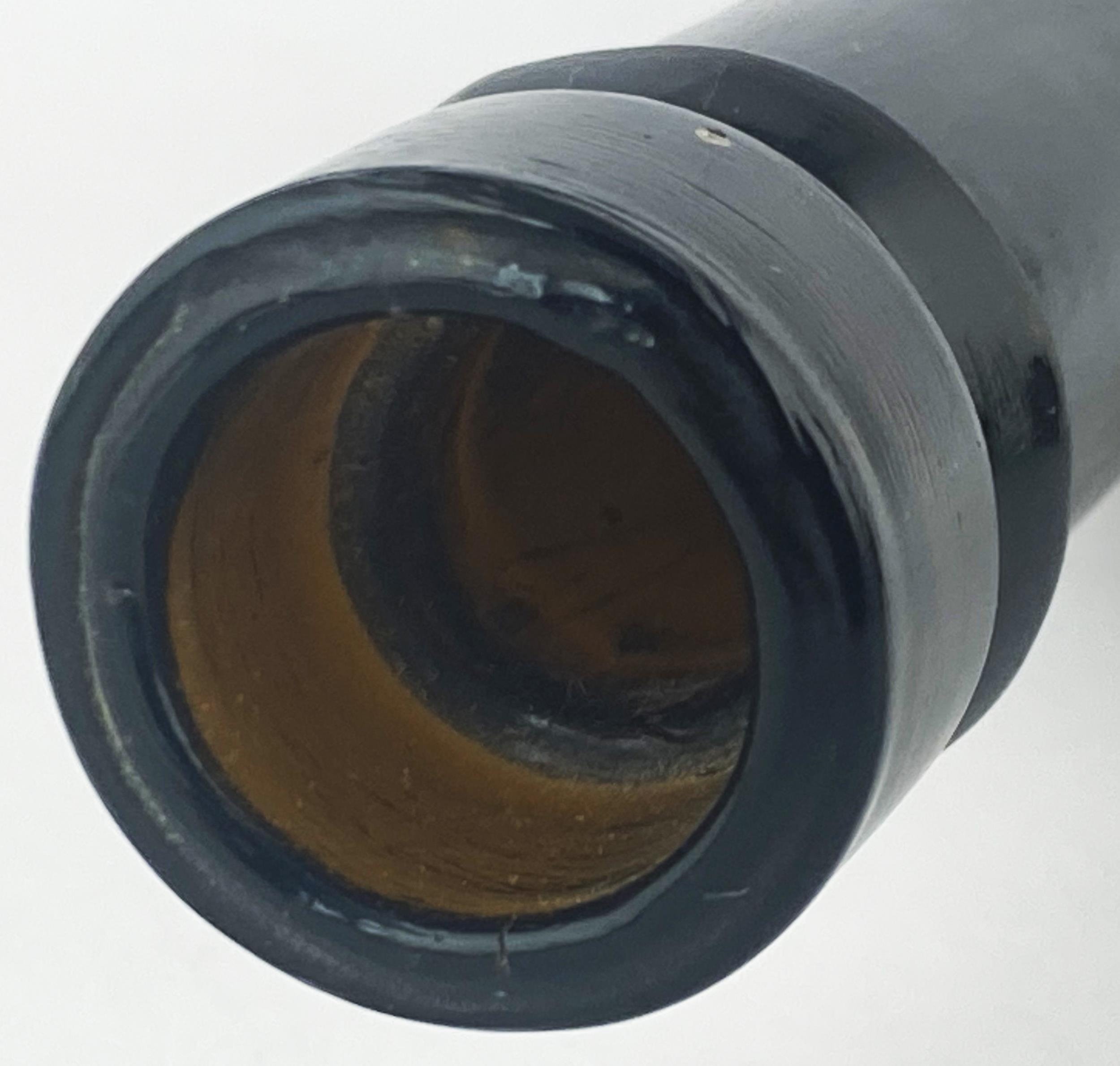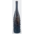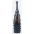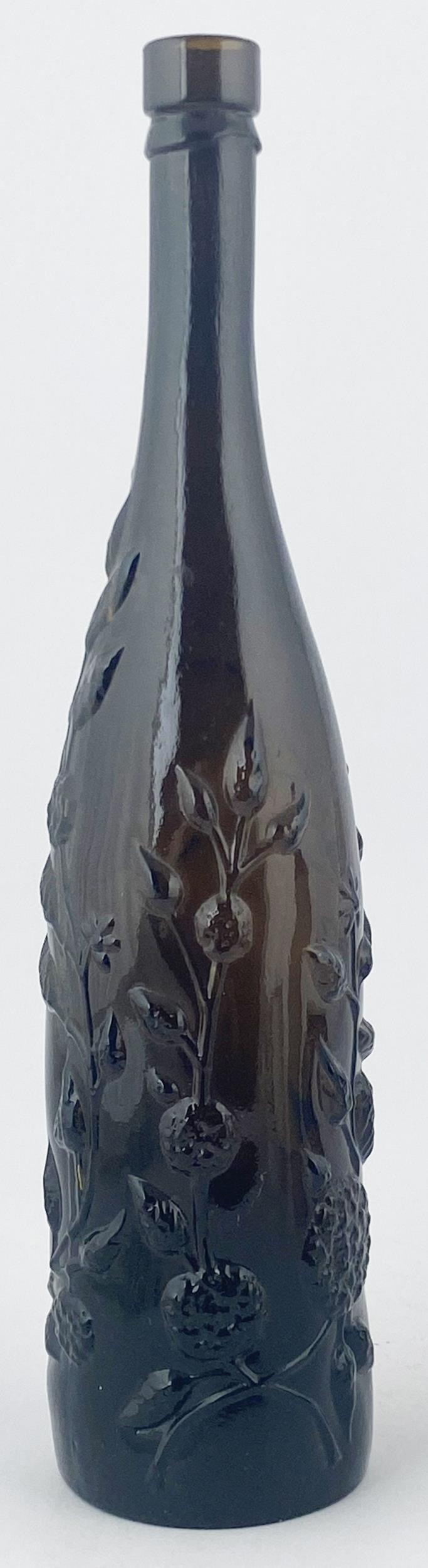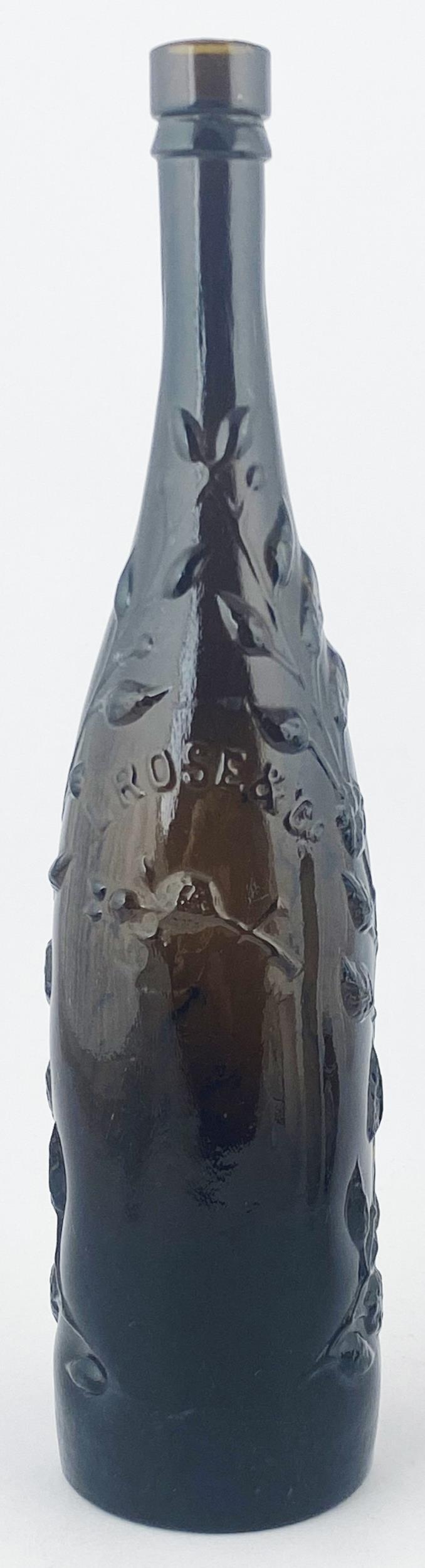 ROSES LIME JUICE CORDIAL BOTTLE. 12ins tall, extremely elegant black/ dark brown glass, long neck, square lip. Boldly & heavily embossed in vines to front & rear. Front carries L ROSE & Co. One of the very best examples weve seen over the years.