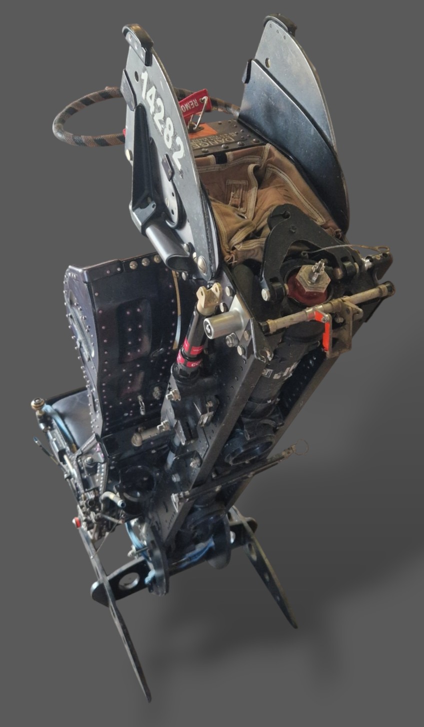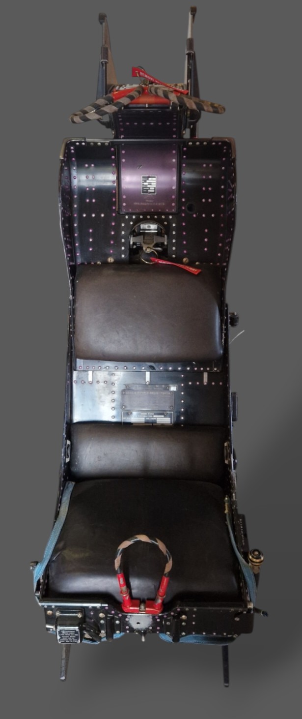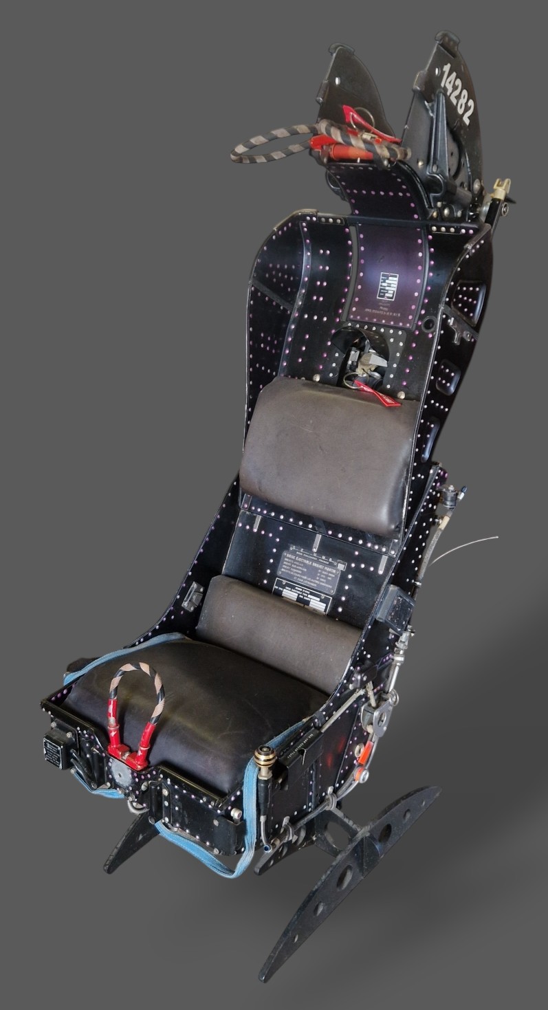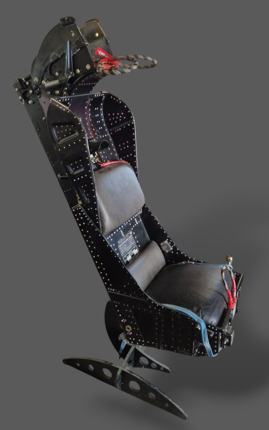 French black painted Martin Baker BAKER MK4 ejector seat with various labels 'SIEGE EJECTABLE BREVET MARTIN', marked 'A.J', numbered 14282 to headrest, Believe to be from Dassaut/Dornier Alpha jet, or possibly from a Swiss produced version of a de Havilland Venom, mounted on a base and re-upholstered in black vinyl