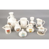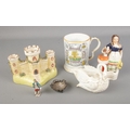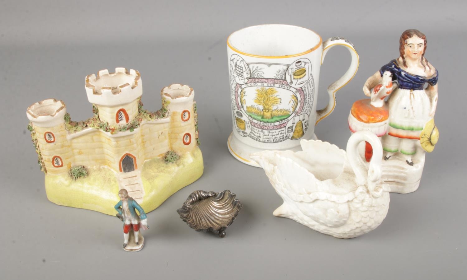 A collection of antique ceramics including a Staffordshire figure of a girl with bird, a Staffordshire figure of a castle, swan dish, Adams motto ware tankard, and a small silver trinket dish