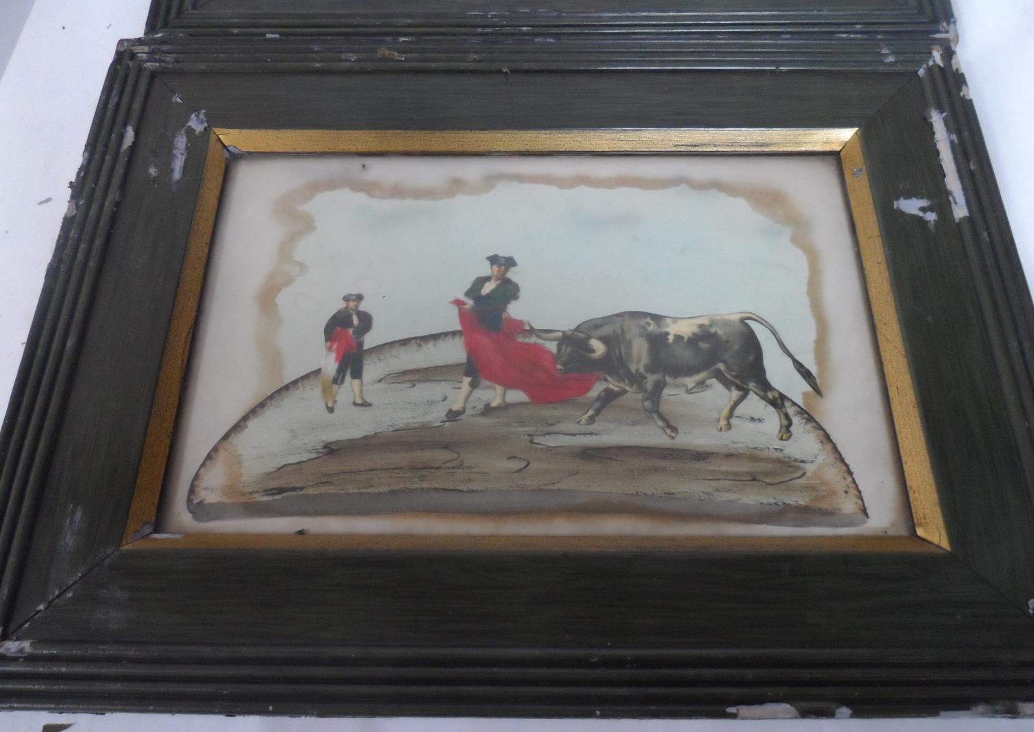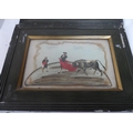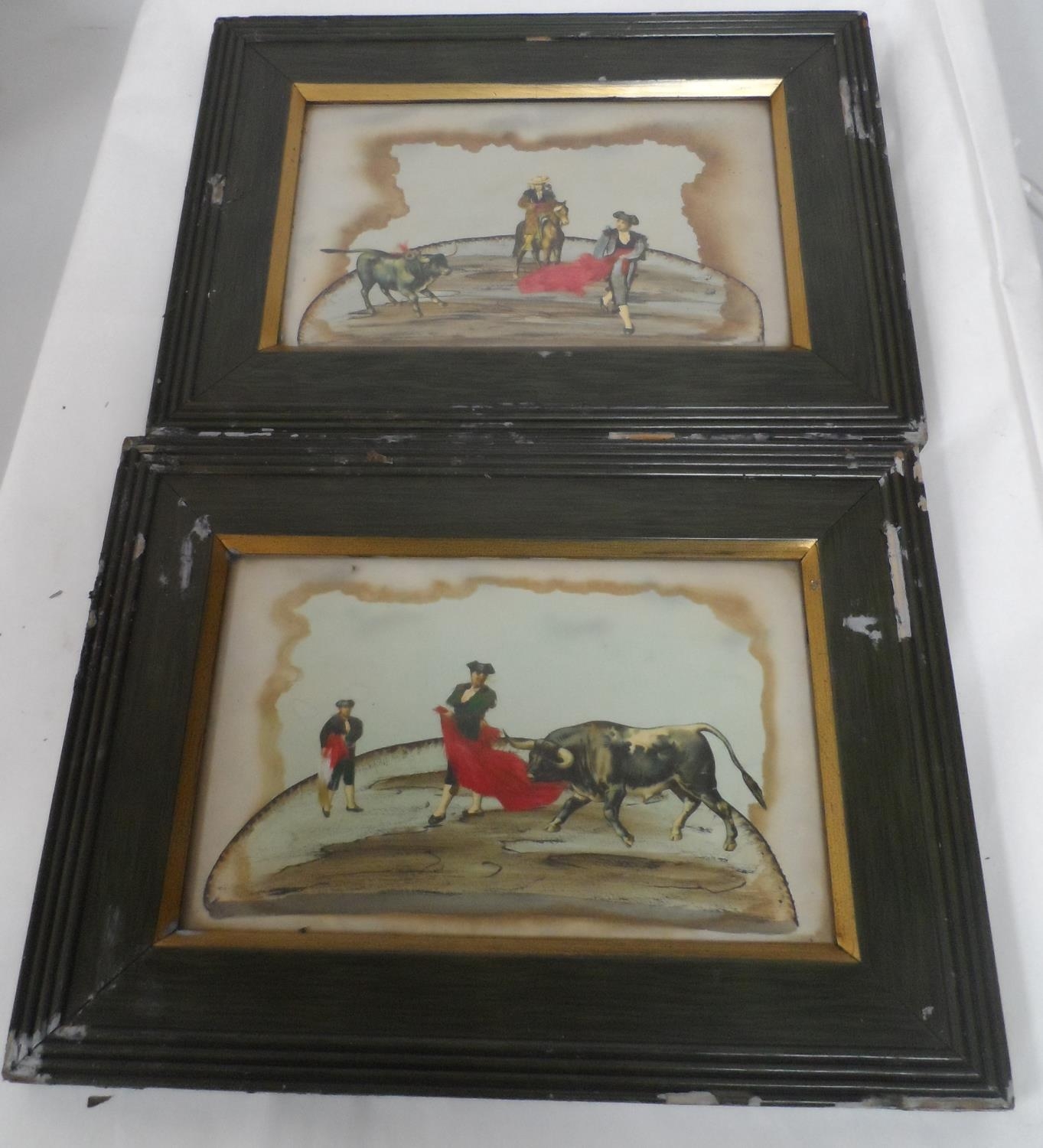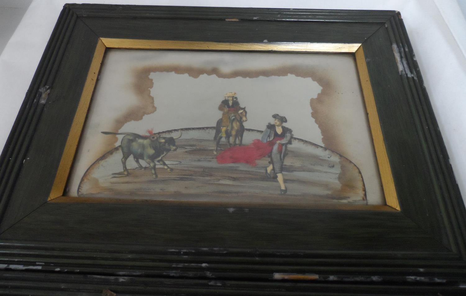 Pair of 20thC Spanish Bull fighting watercolour and collage pictures, both in matching frames (2)