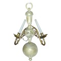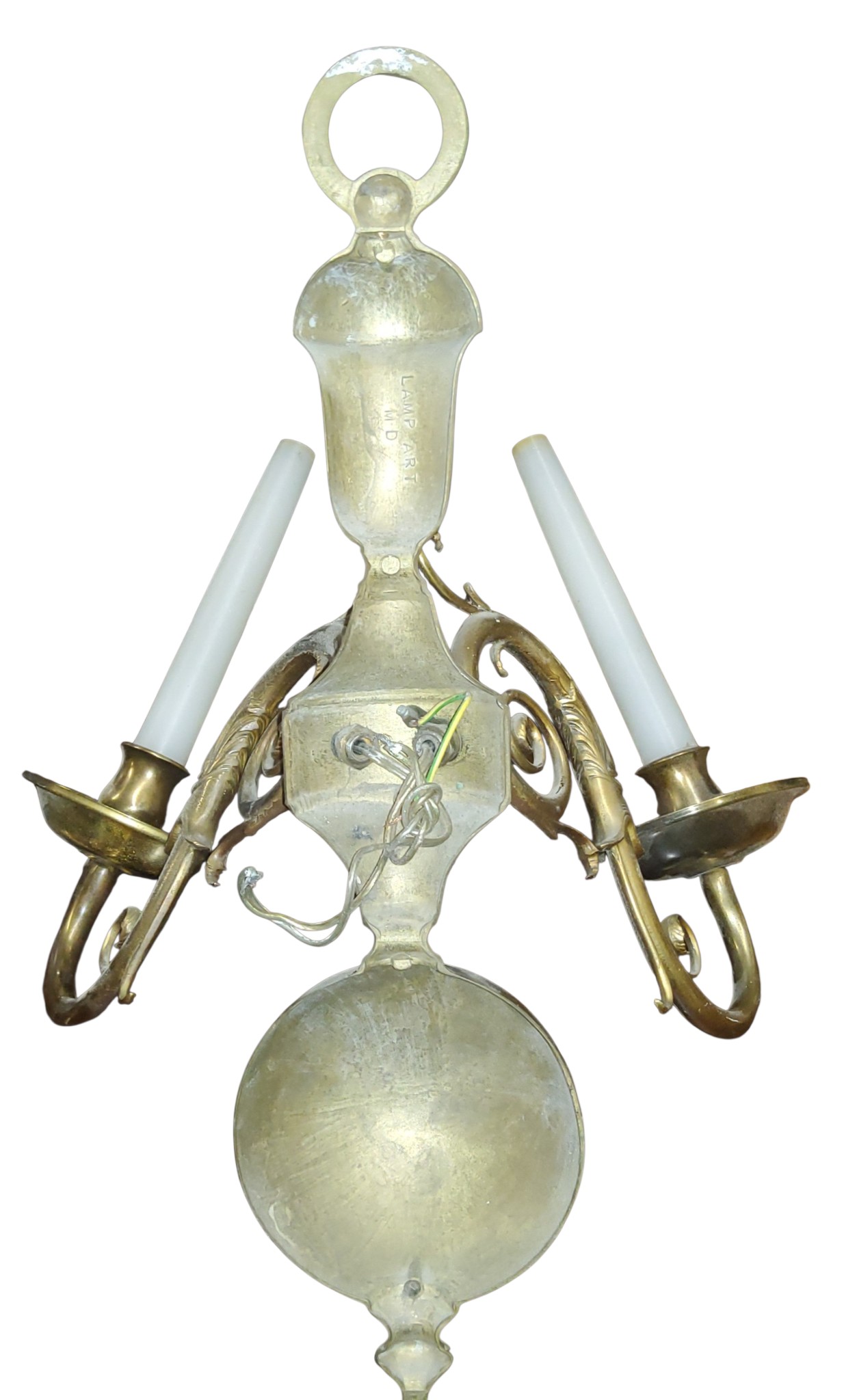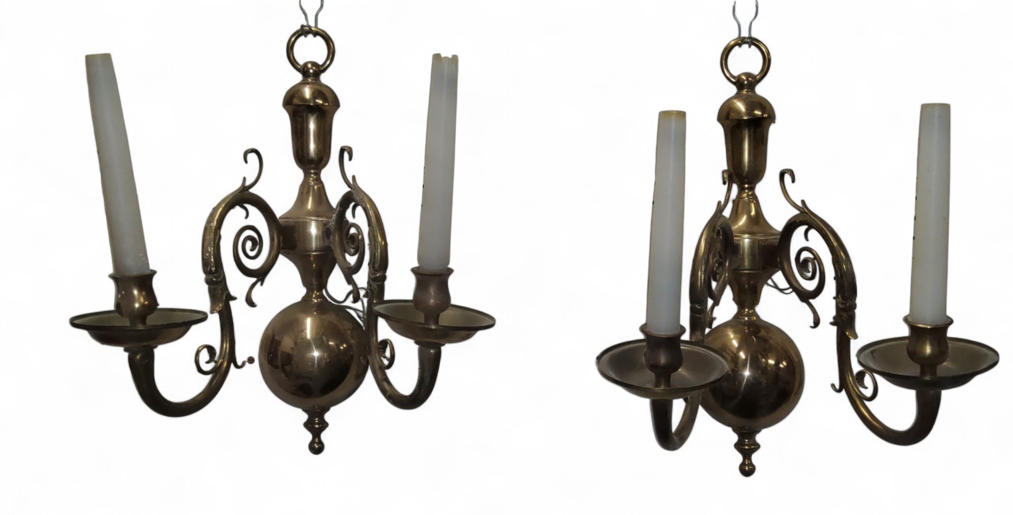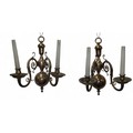 A pair of brass two-light wall sconces, leafy scroll arms, globular back plates, 44.5cm high, cast Lamp Art