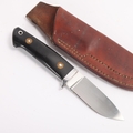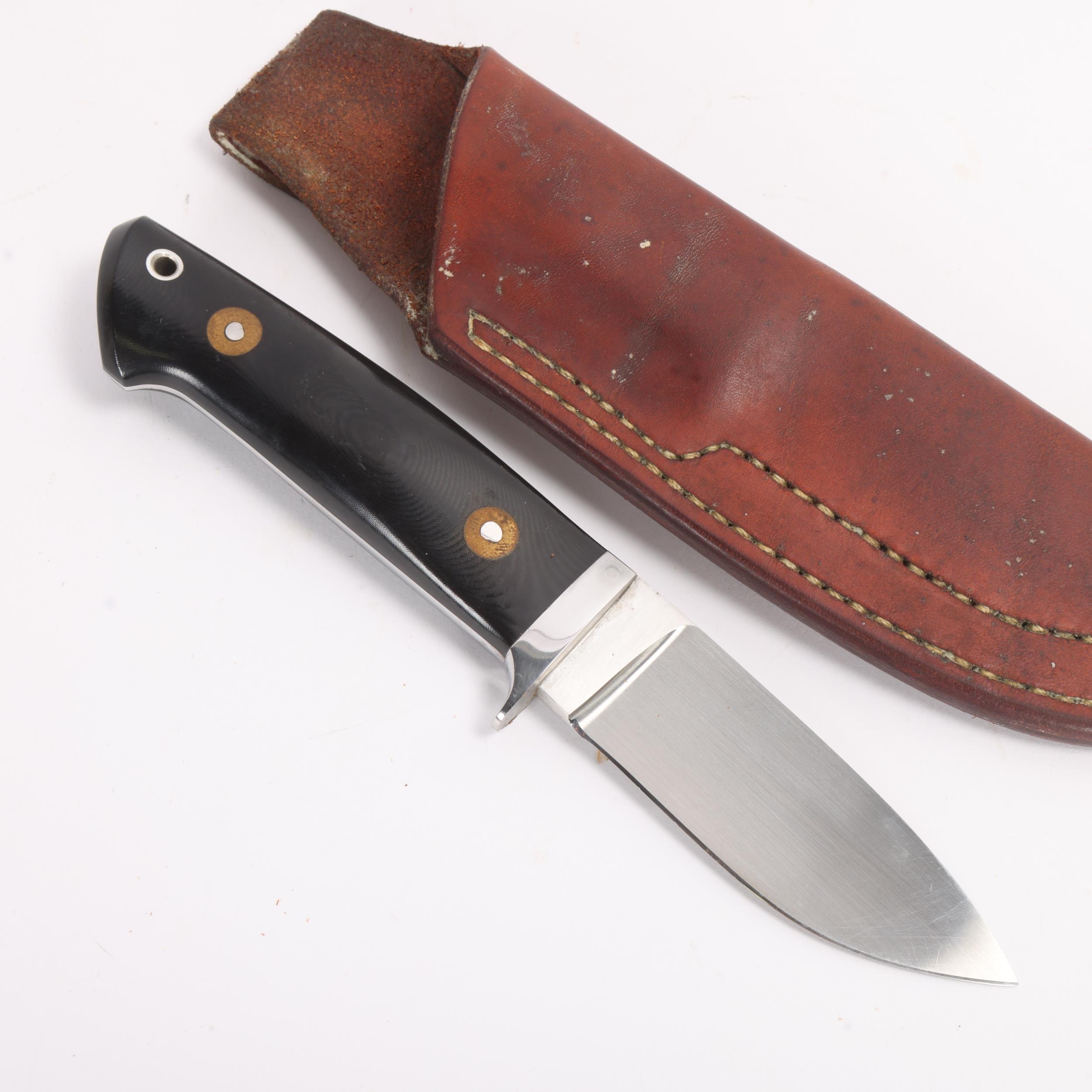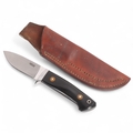 A fixed blade knife by Alan Wood, England, with ebonised handle and leather sheath, makers name to blade, blade length 9cm, overall 20cm