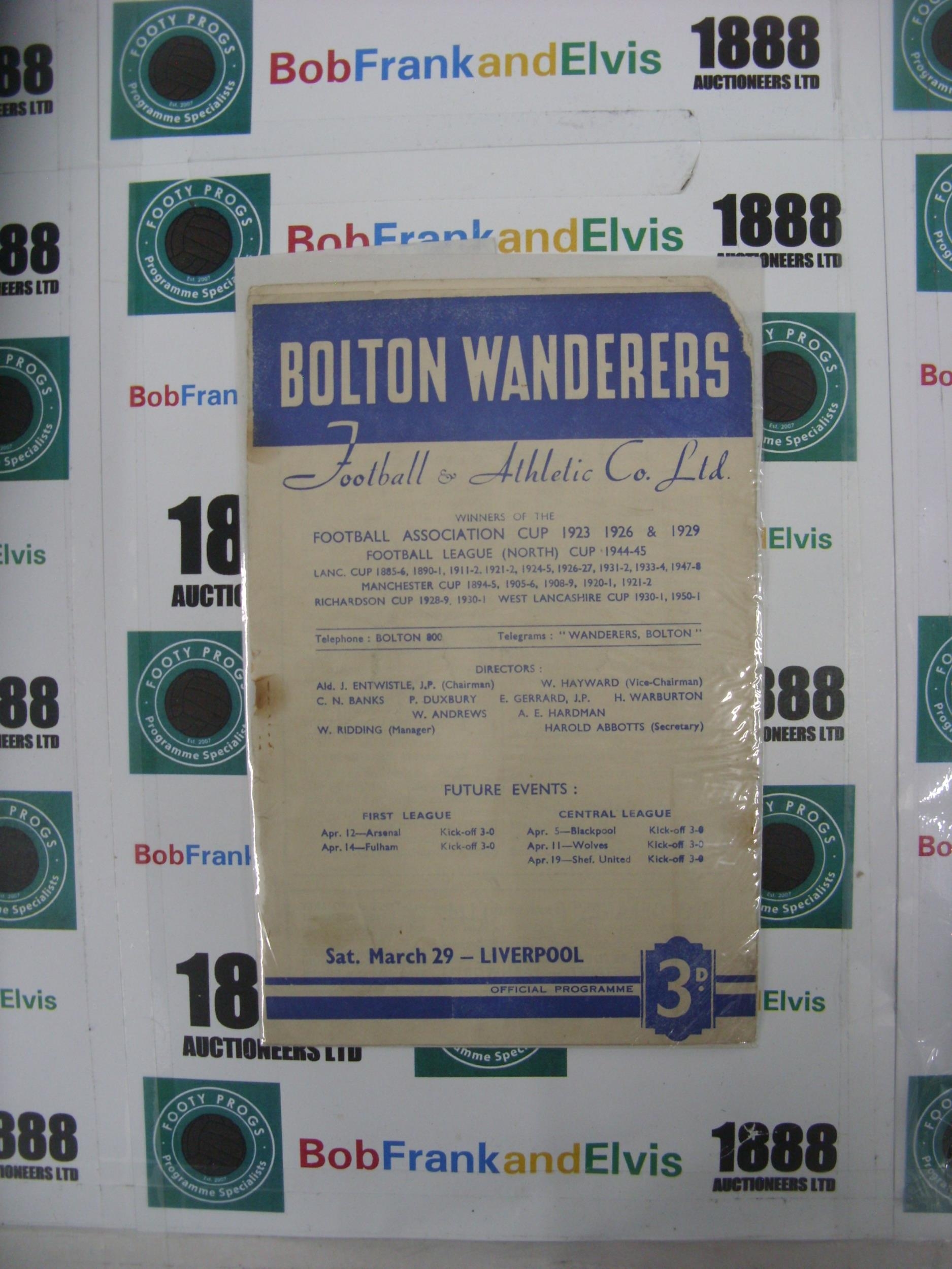 BOLTON WANDERERS, 1951/1952, a football programme from the game versus Liverpool, played on 29/03/1952 (rusty staples removed, worn corner, scores on back, folded).