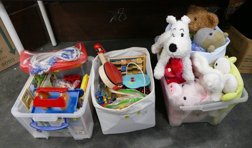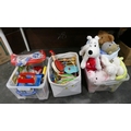 Three boxes of children's toys, soft toys, pre school toys etc