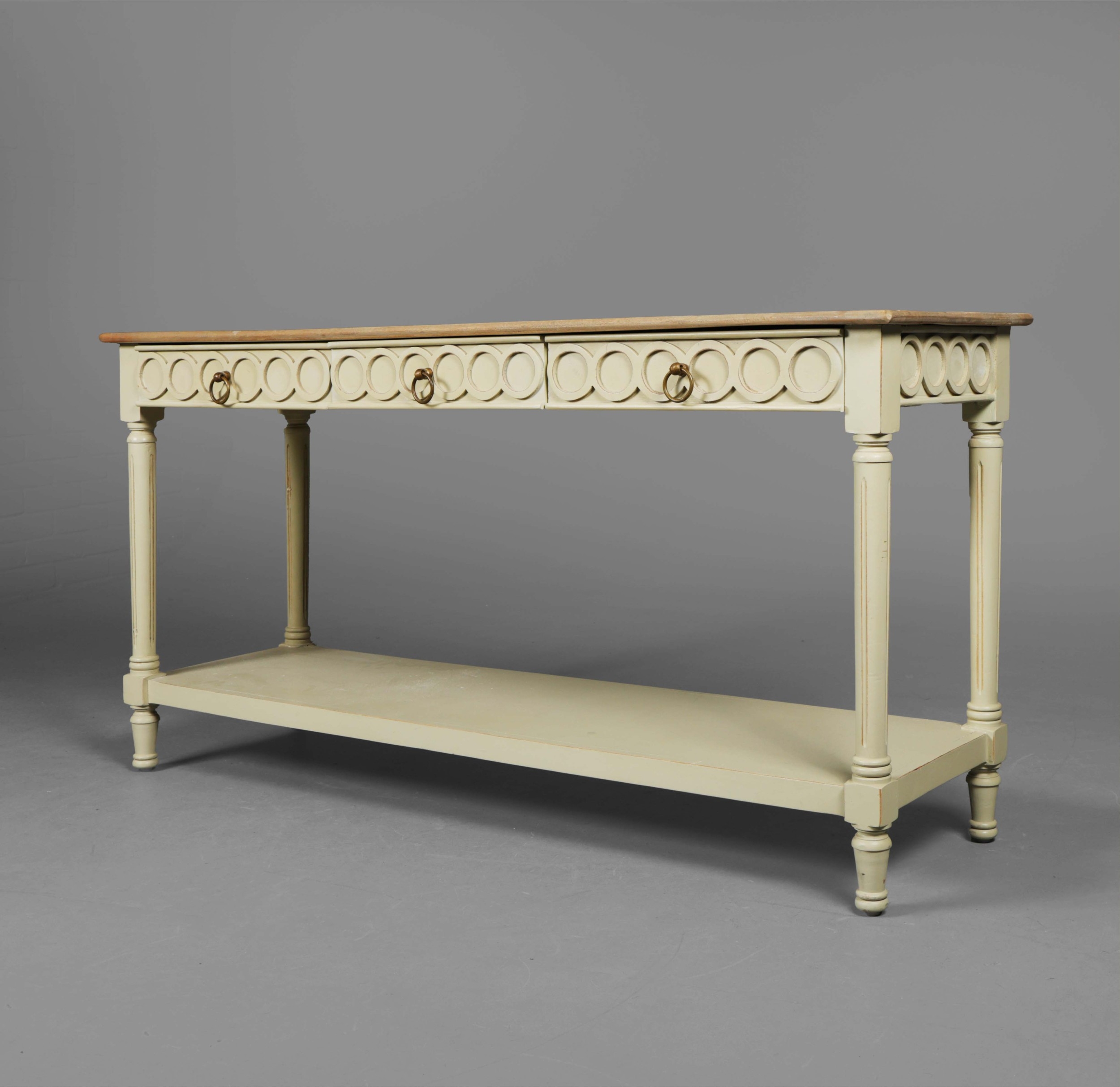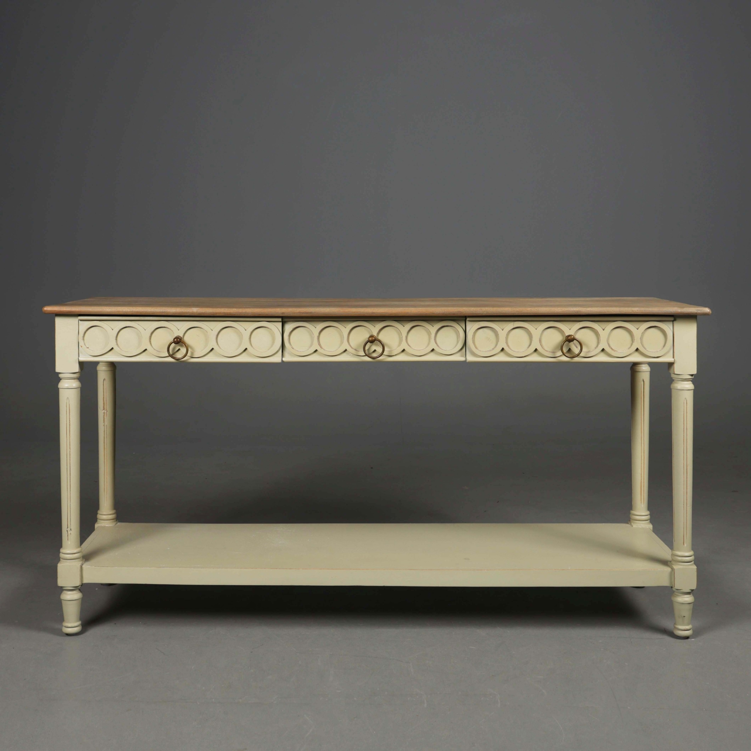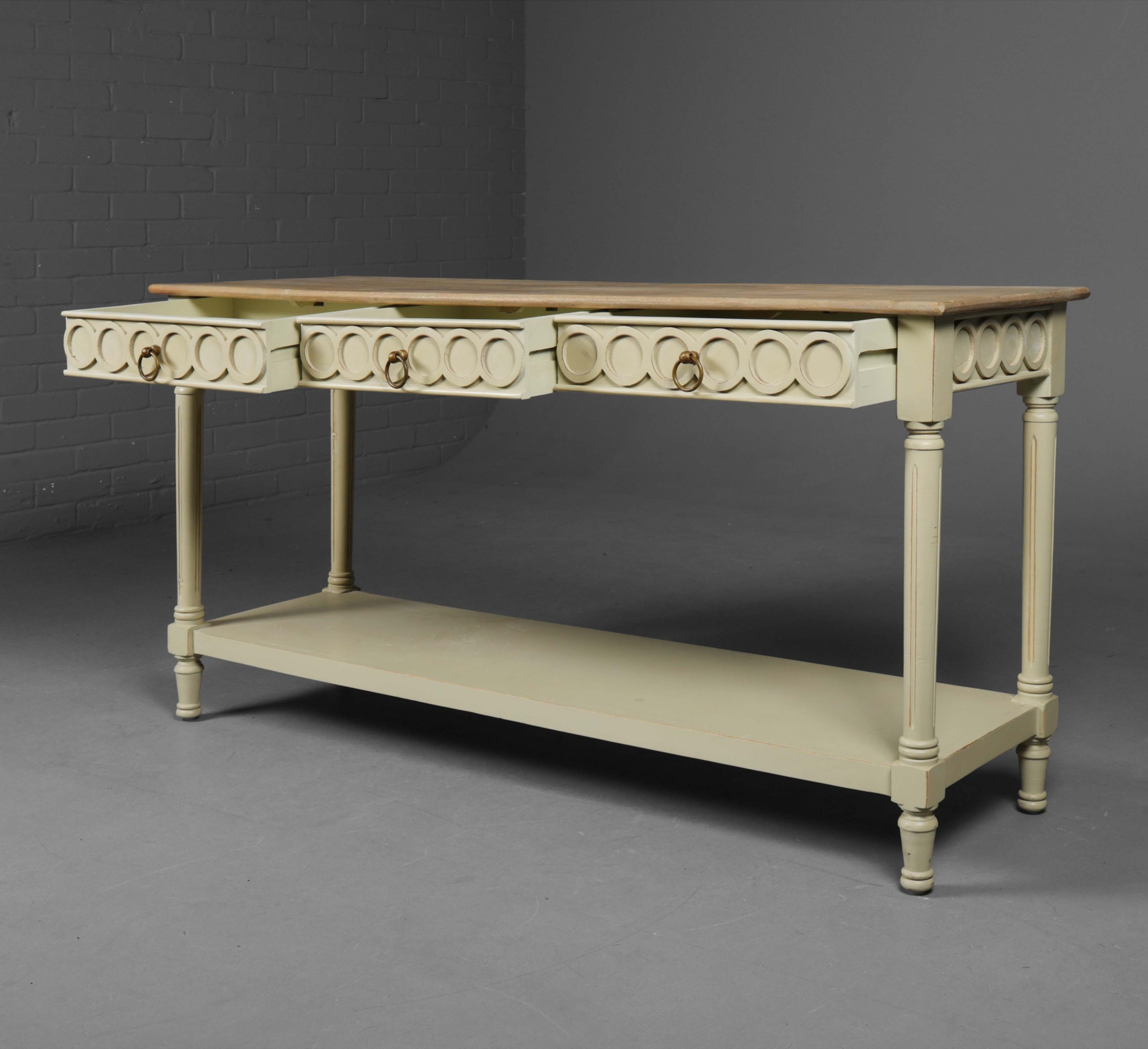 OKA CERCLE CONSOLE TABLE. With painted base and three drawers 76cm H x 145cm W x 46cm D.