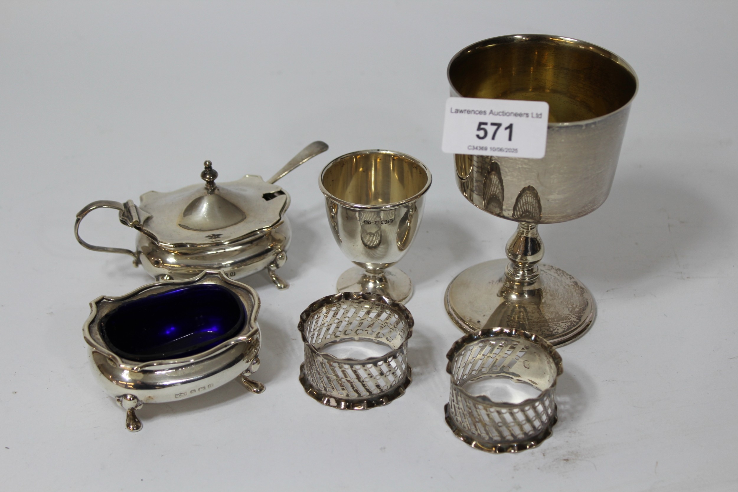 Modern silver goblet, two silver napkin rings, silver egg cup and two silver condiments, 10.5oz t