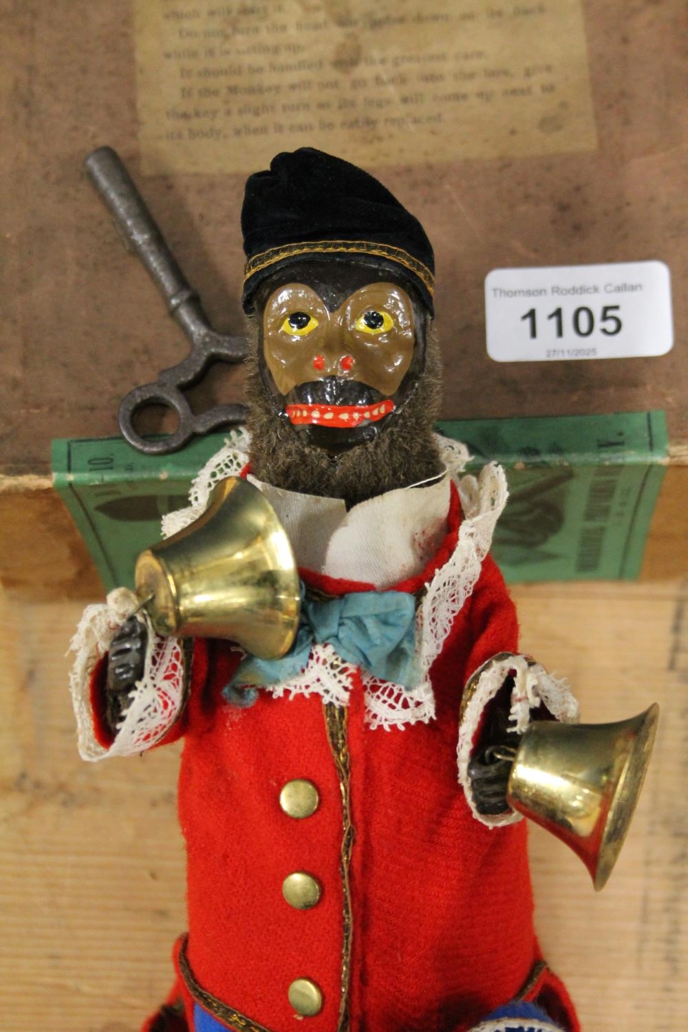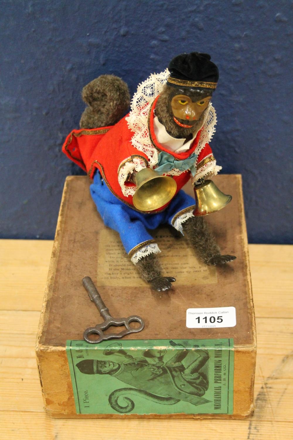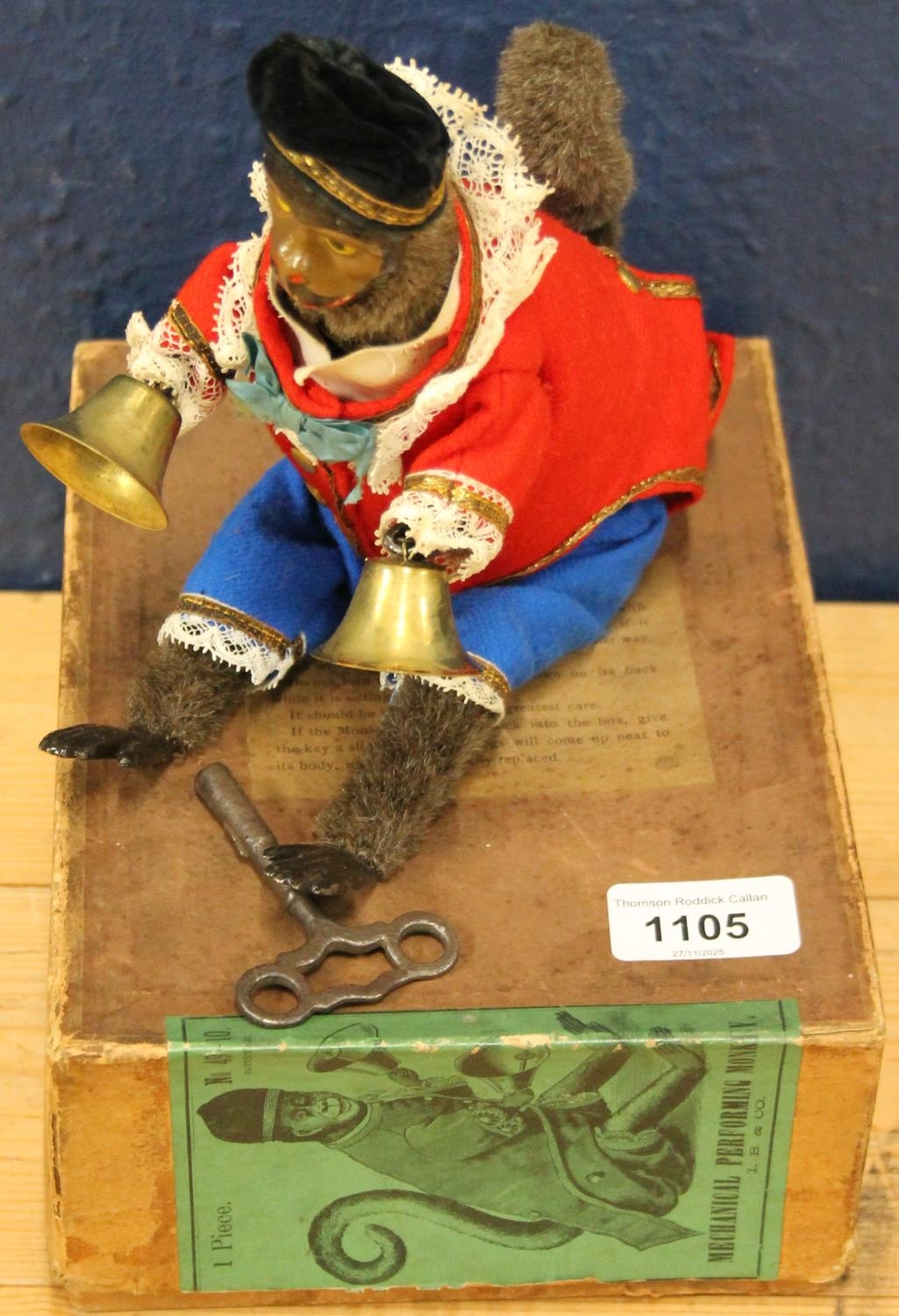 Ives Blakeslee & Company of Connecticut, United States of America, clockwork automaton in the form of a monkey with bells, held in original box with 'Mechanical Performing Monkey' label.