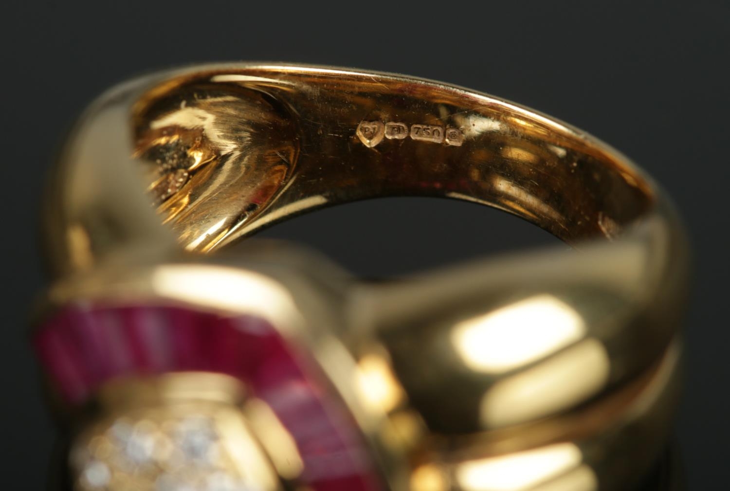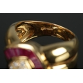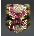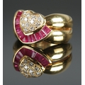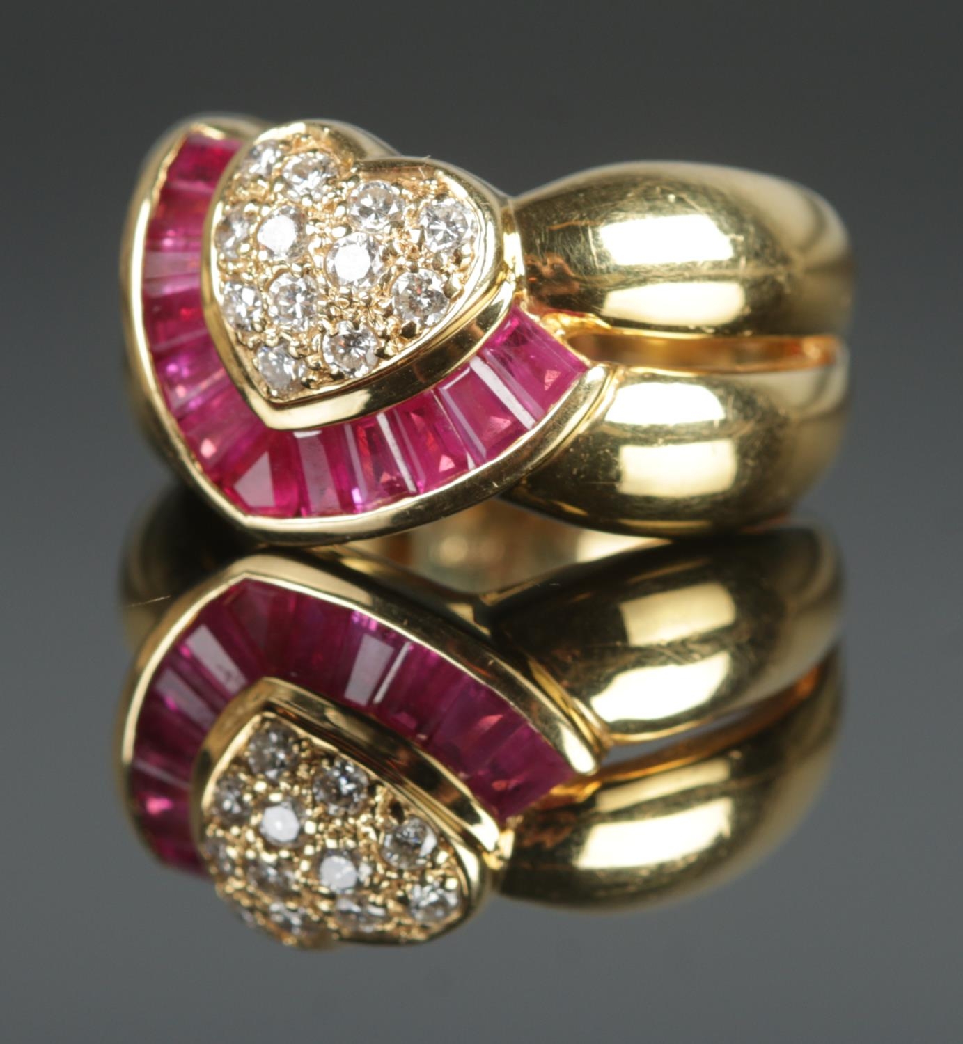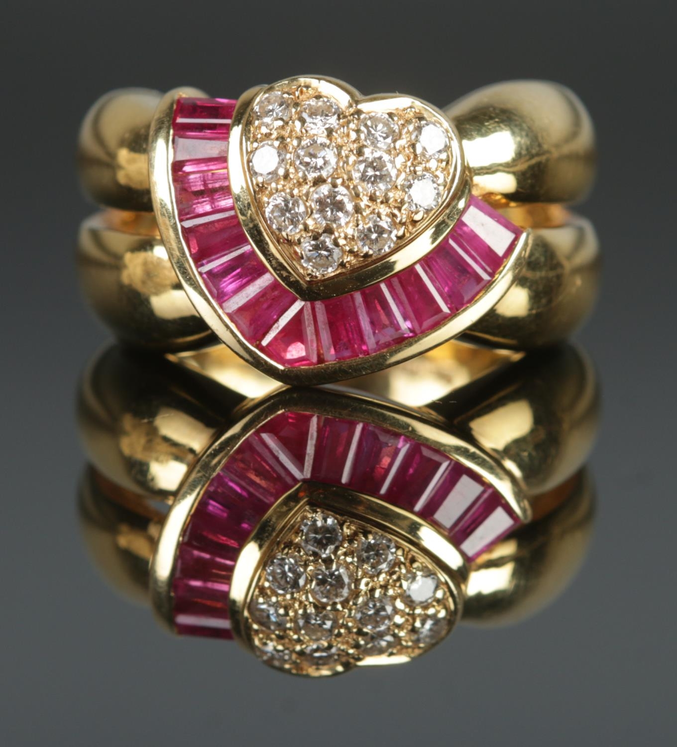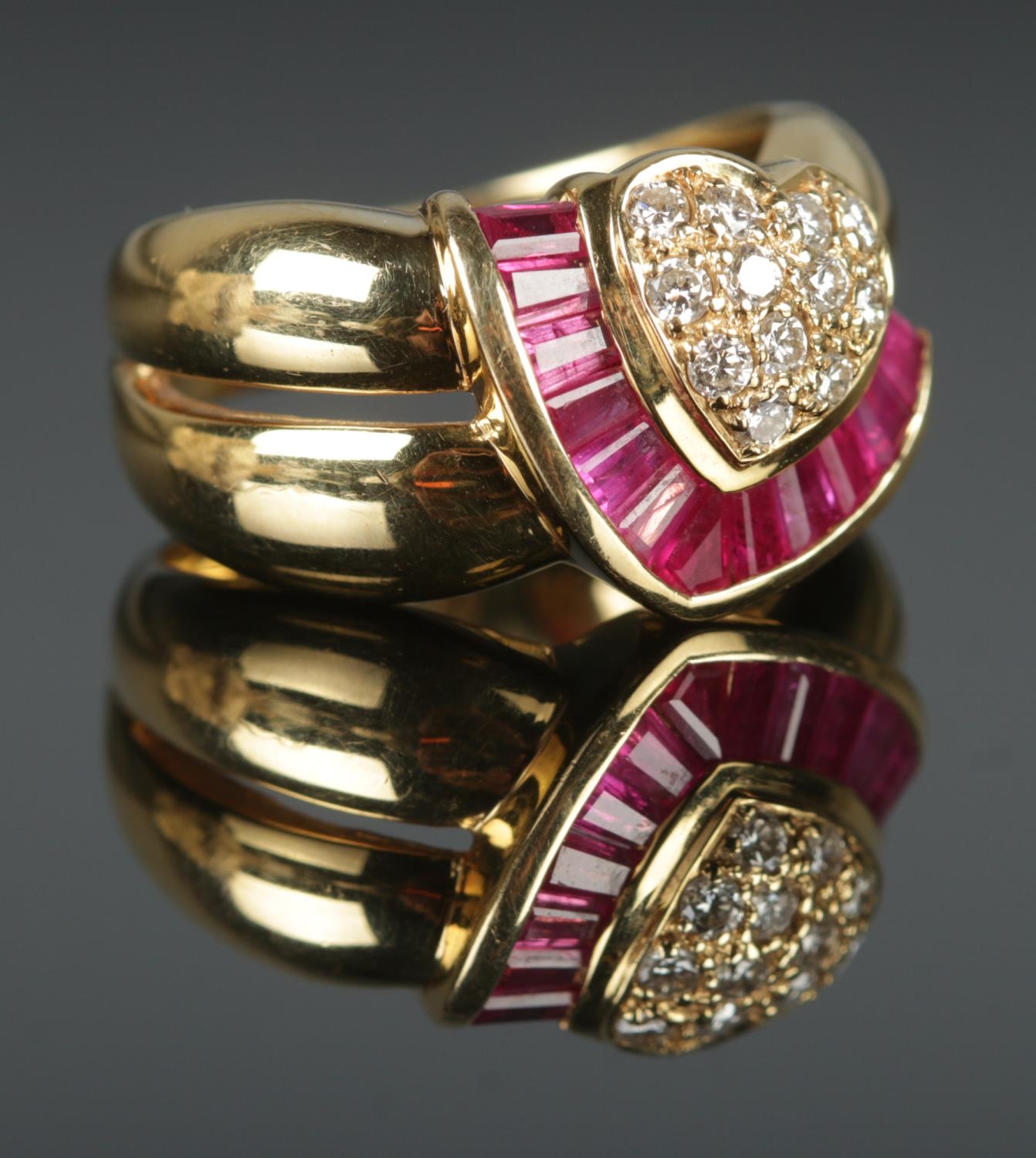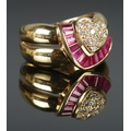 An unusual 18ct yellow gold, diamond and ruby ring with heart shaped setting. Rubies approximately 0.8ct. Diamonds approximately 0.25ct. Size N. 10.21g.