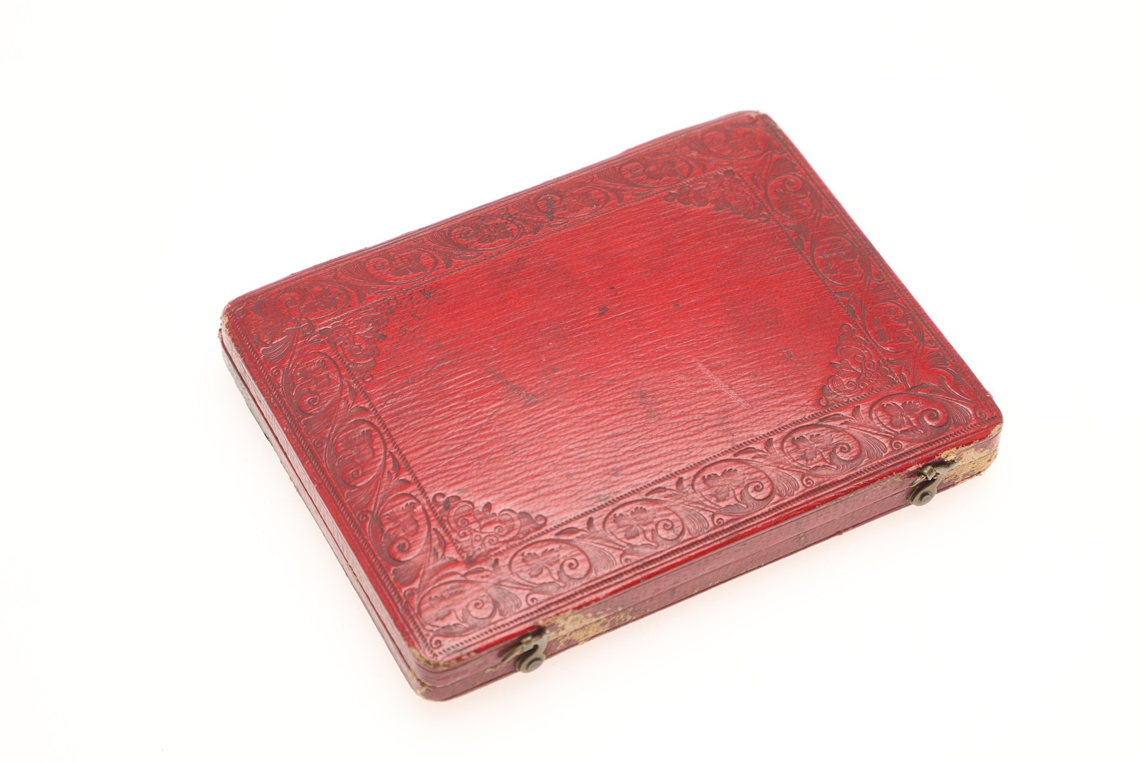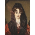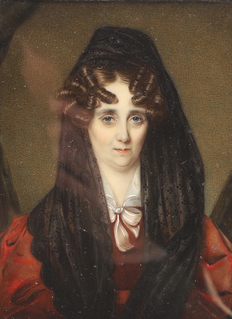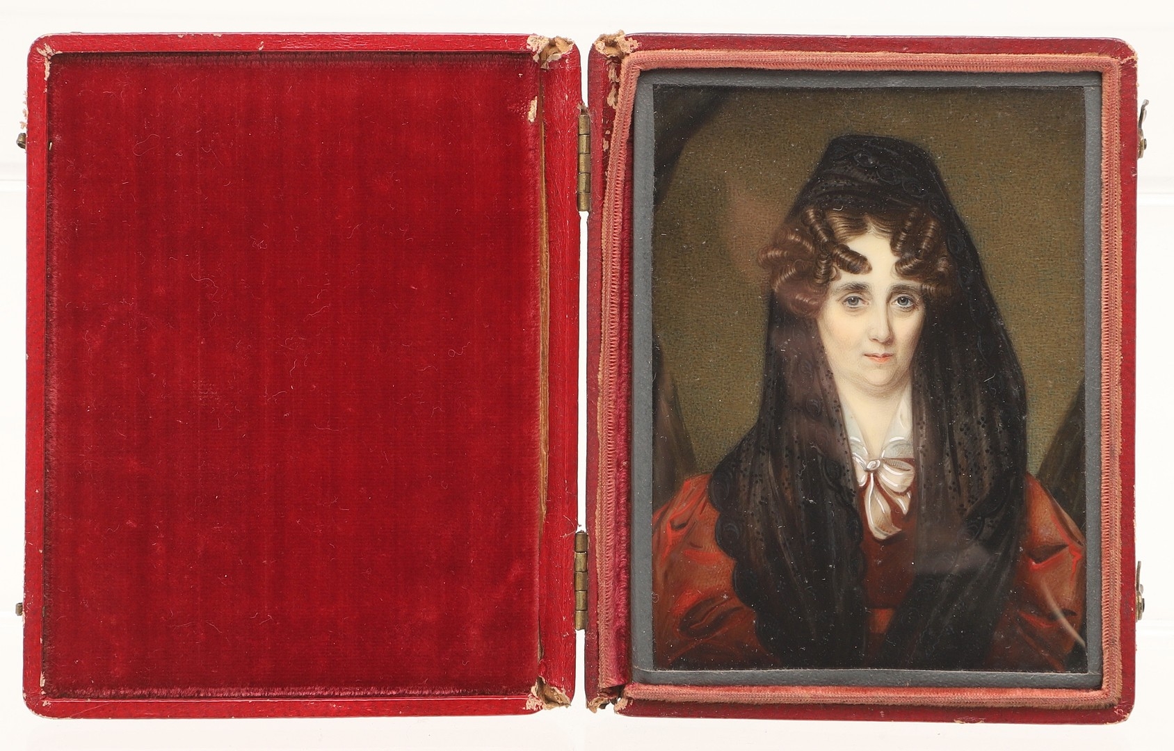 CHARLES FOOT TAYLER. Miniature portrait of a lady wearing red dress with white collar and bow, her hair adorned with a black lace mantilla 9.5 x 7 cm. Inscribed on reverse Gay Street, Bath and dated 1829(?) in red morocco folding outer case Ivory Submission Reference: RZRQ81NT CITES permit is included. Exporting outside the EU will require an additional export permit.