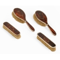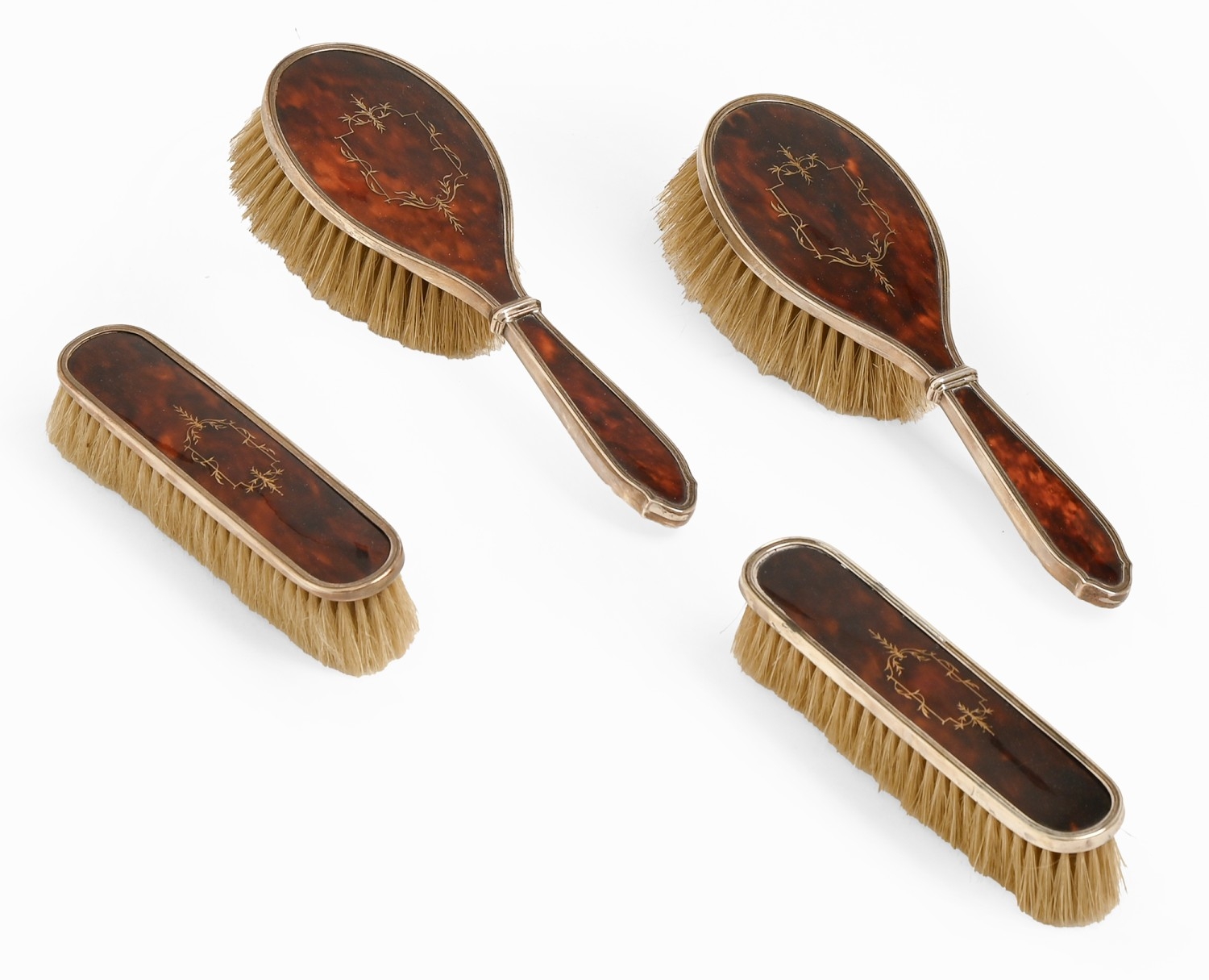 A set of four George V gold inlaid tortoiseshell inset silver brushes, by Synyer & Beddoes, Birmingham 1927