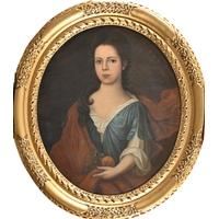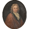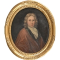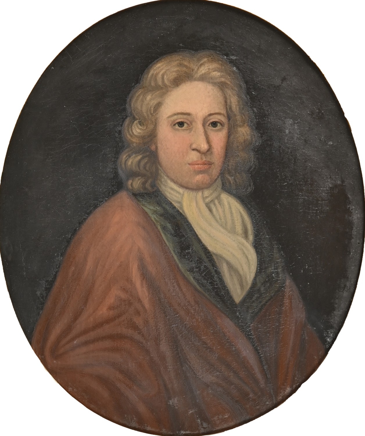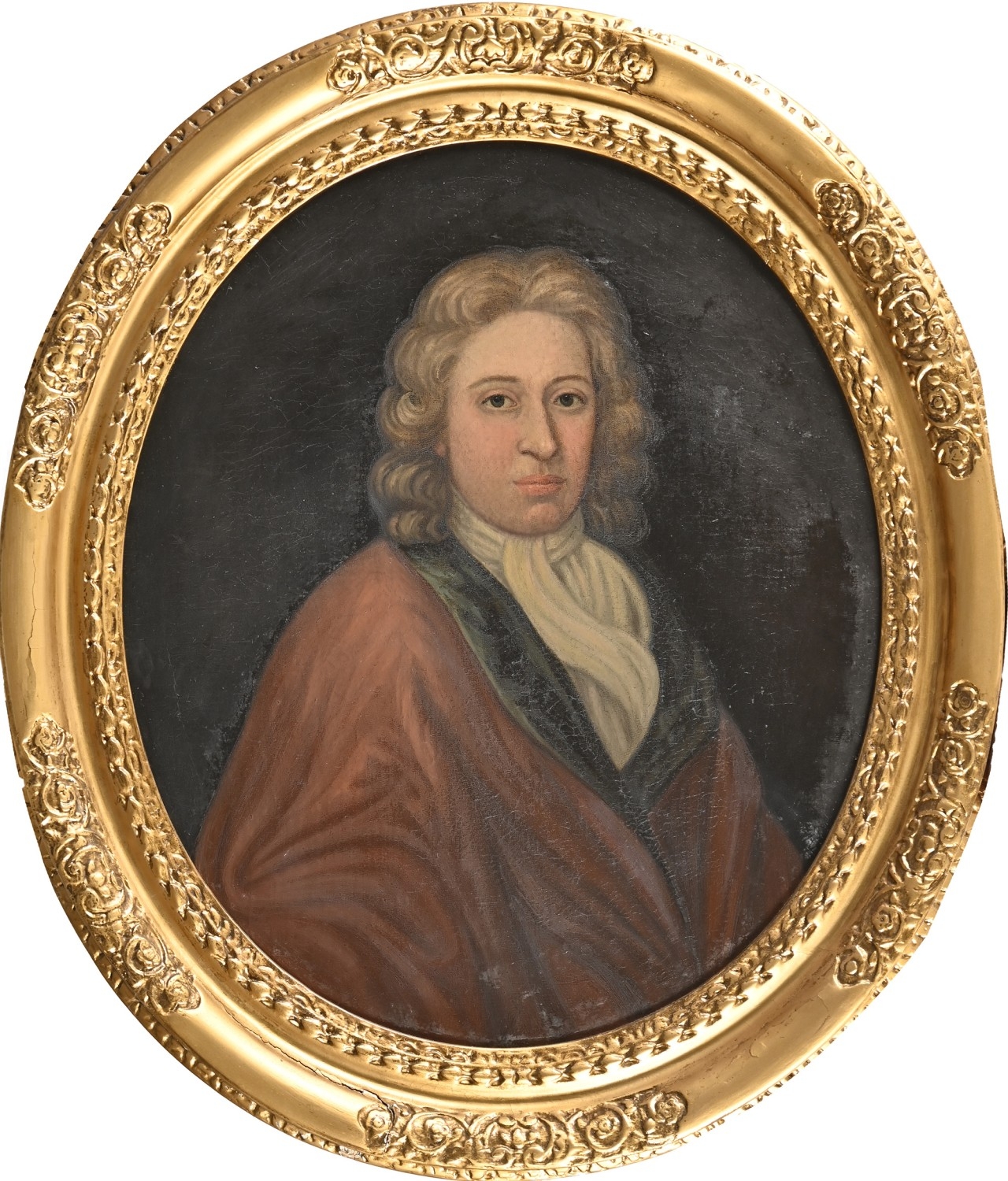 English School, early 18th century - Portrait of a Gentleman, bust length, in red robe, oil on canvas, oval 74cm, carved and gilded panel frame