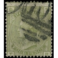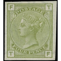 1877 4d Sage-green Pl.17 (Wmk. Inverted). Fine used example of this scarce ‘abnormal’ issue lettered TB, cancelled with part Bradford ‘107’ duplex at top leaving left hand plate number clearly visible. Approximately 28-30 examples recorded of which half have the watermark inverted. SG153. Cat. £15,000.