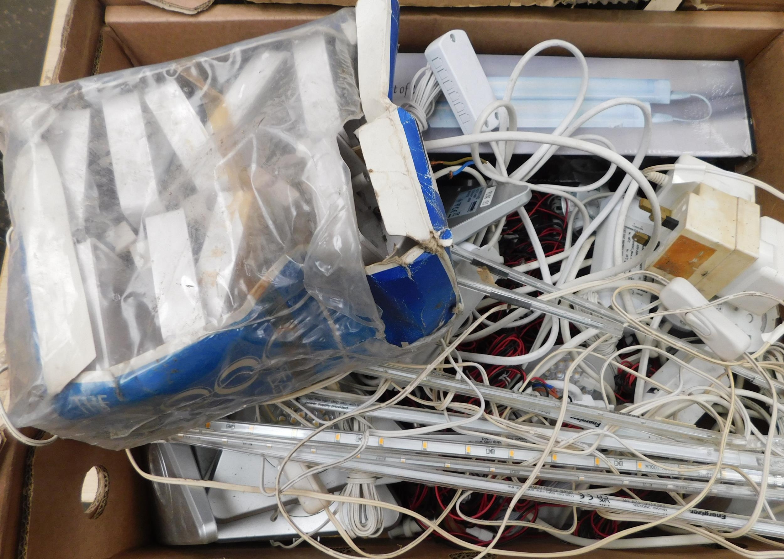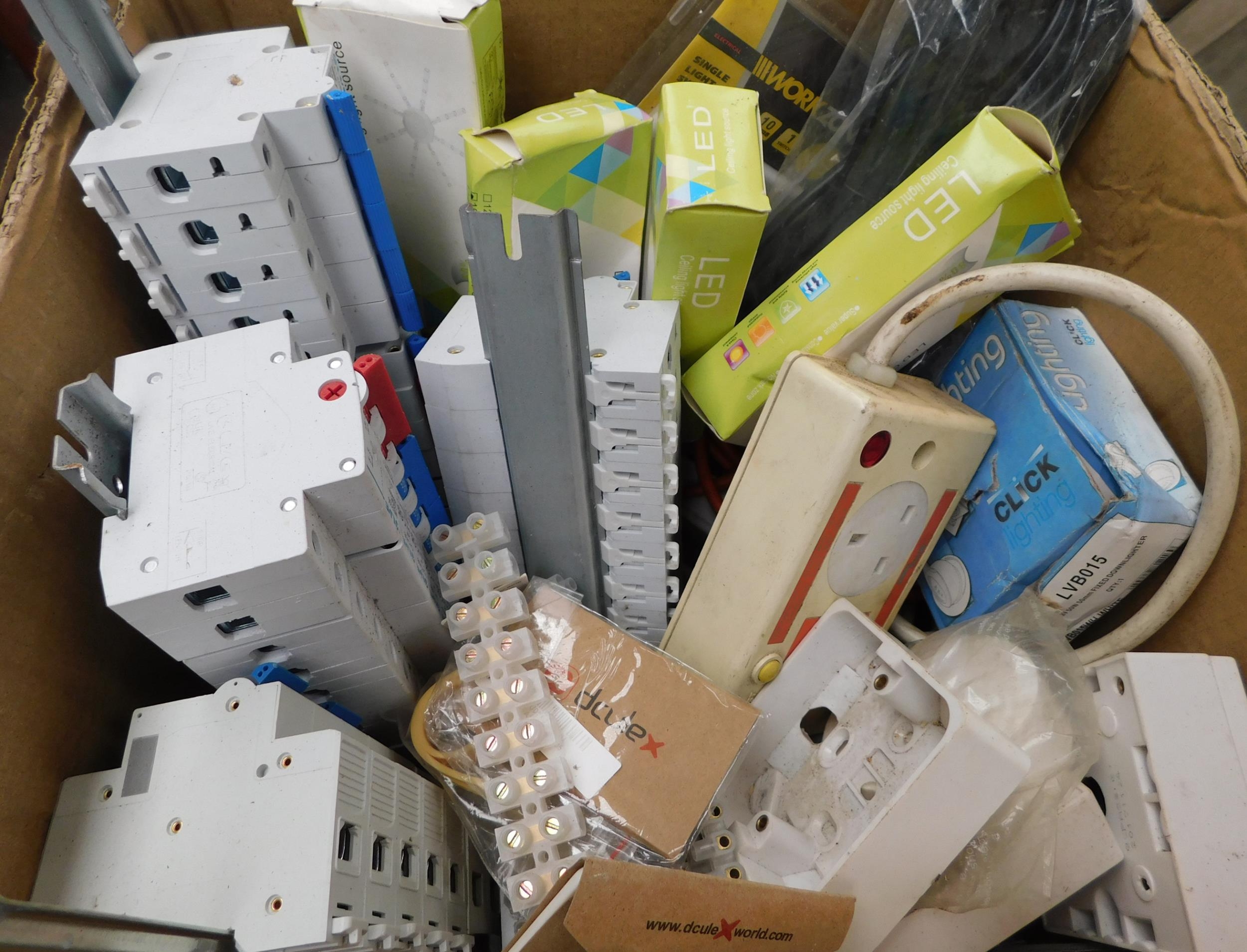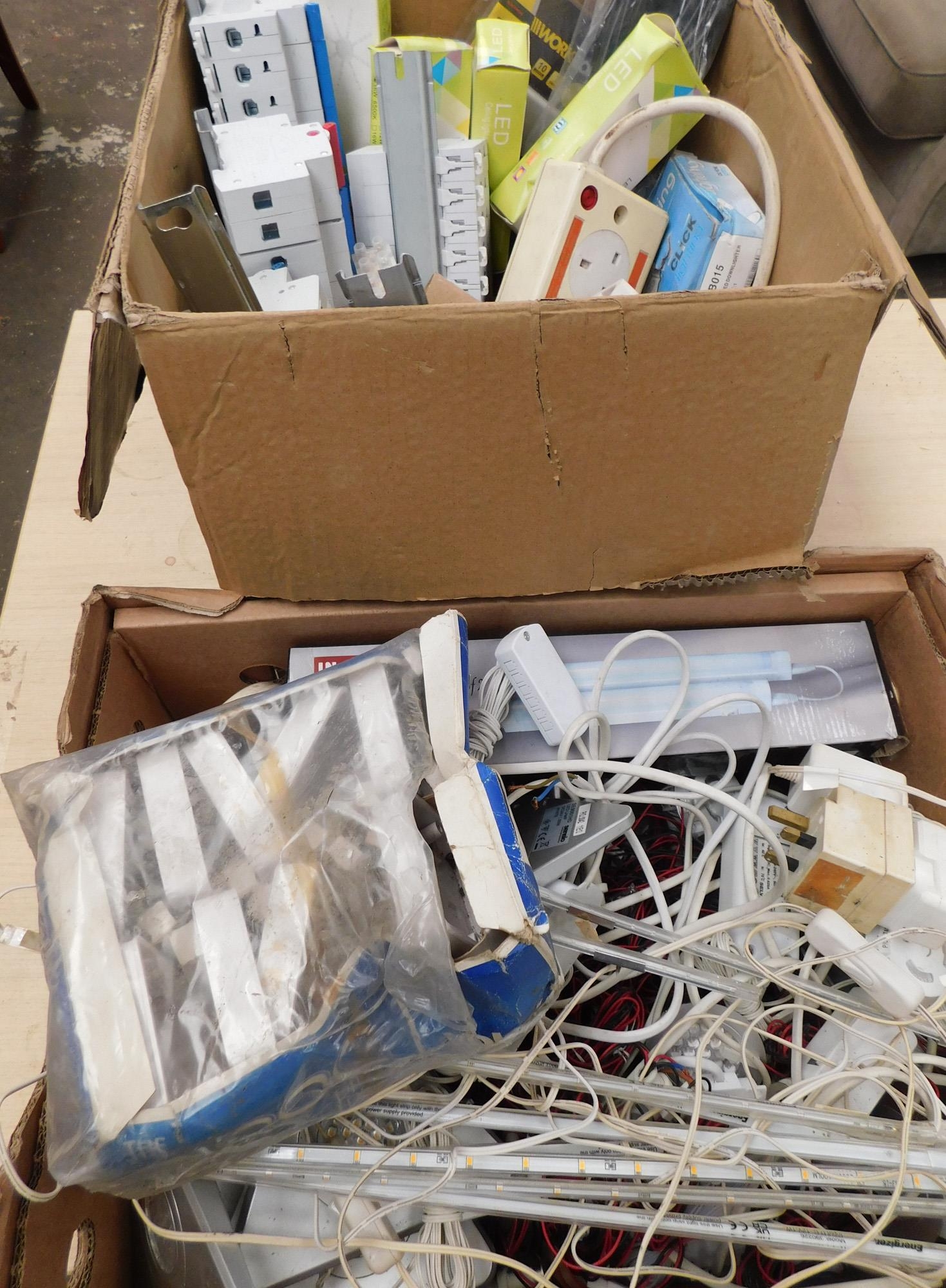 Two boxes of household electricals - incl. consumer boxes, sockets and LED lights