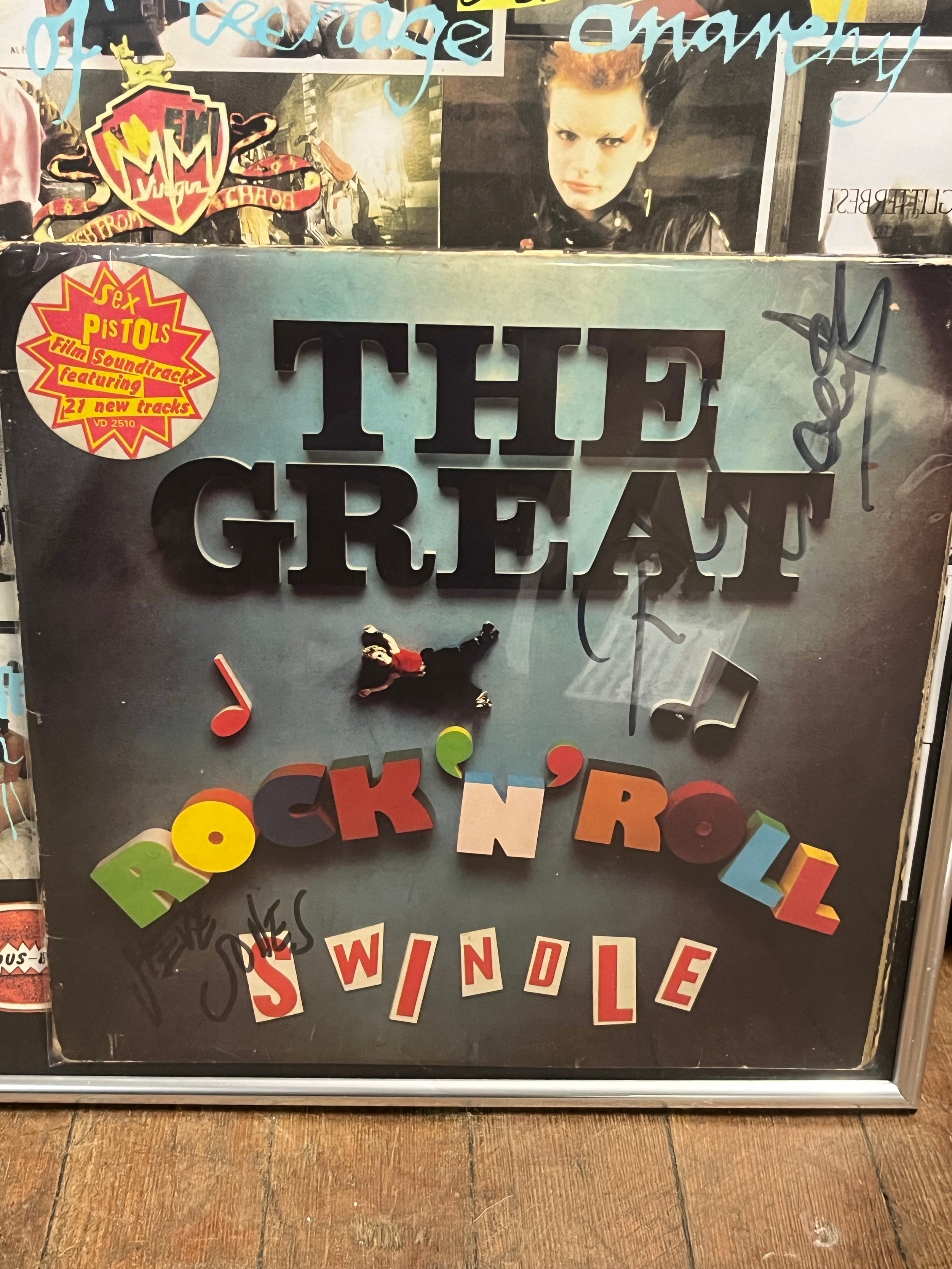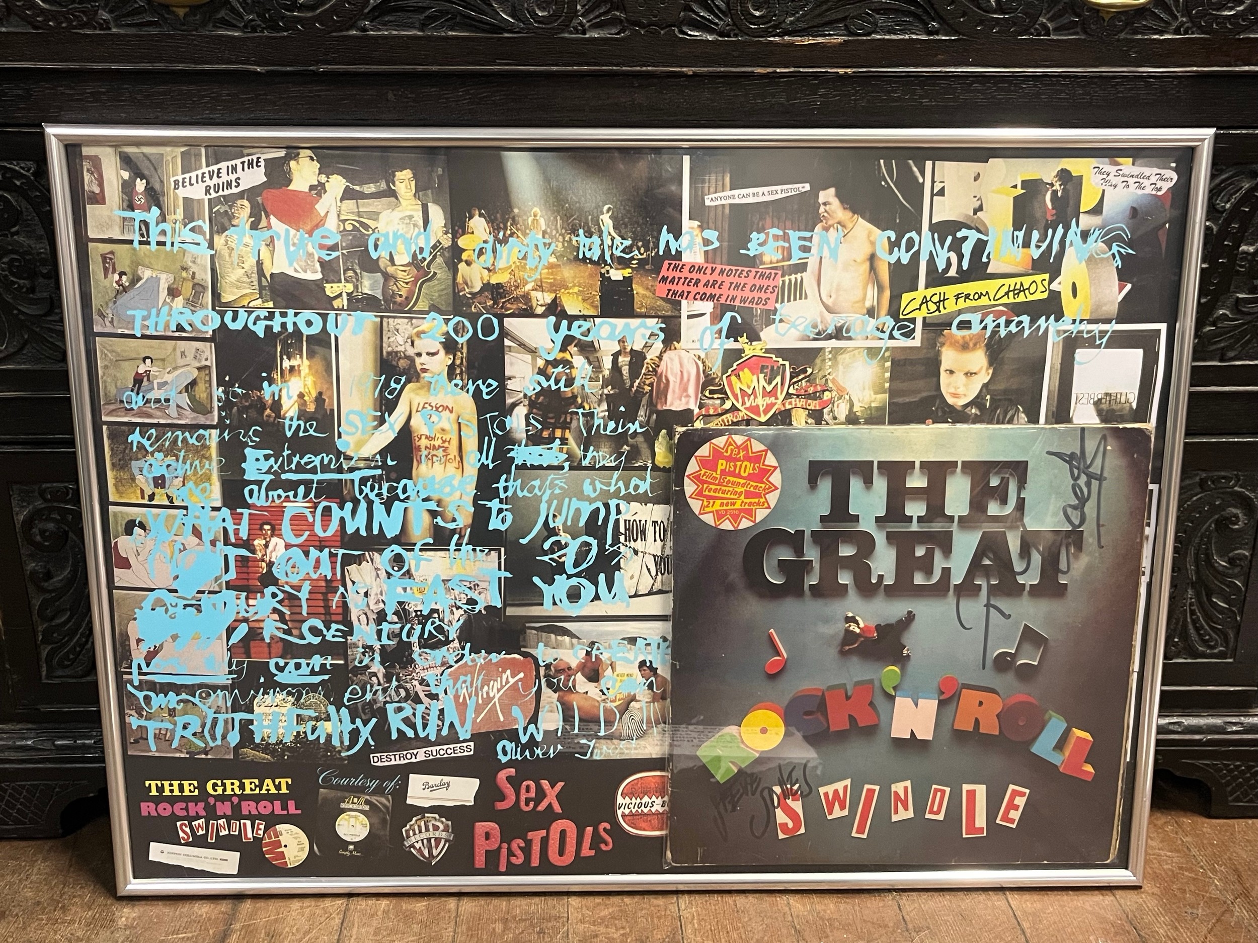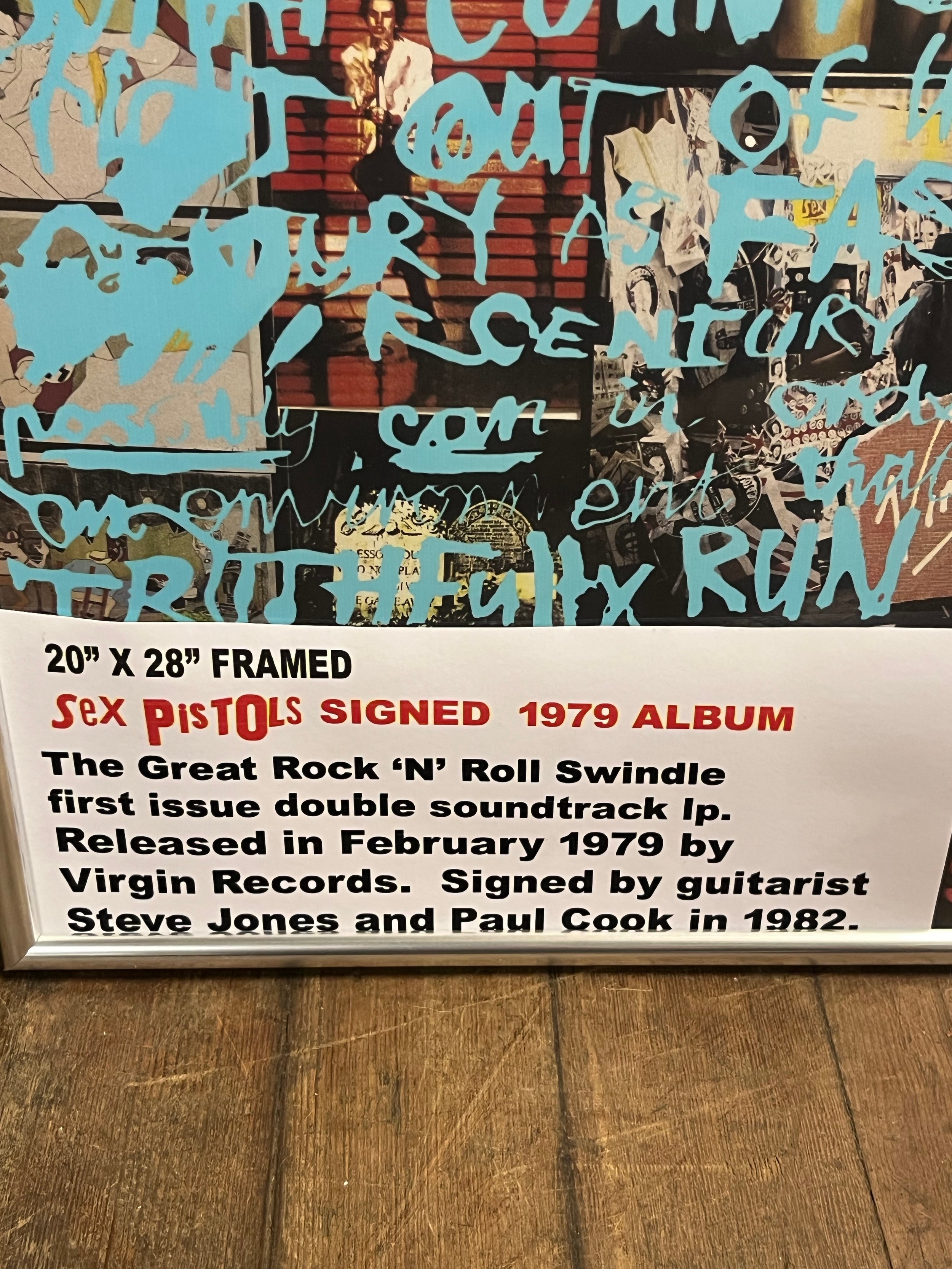 Framed sex pistols the great rock and roll swindle signed by Steve Jones and Paul Cook in 1982 (Info in pictures) 20x28"