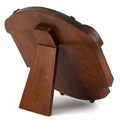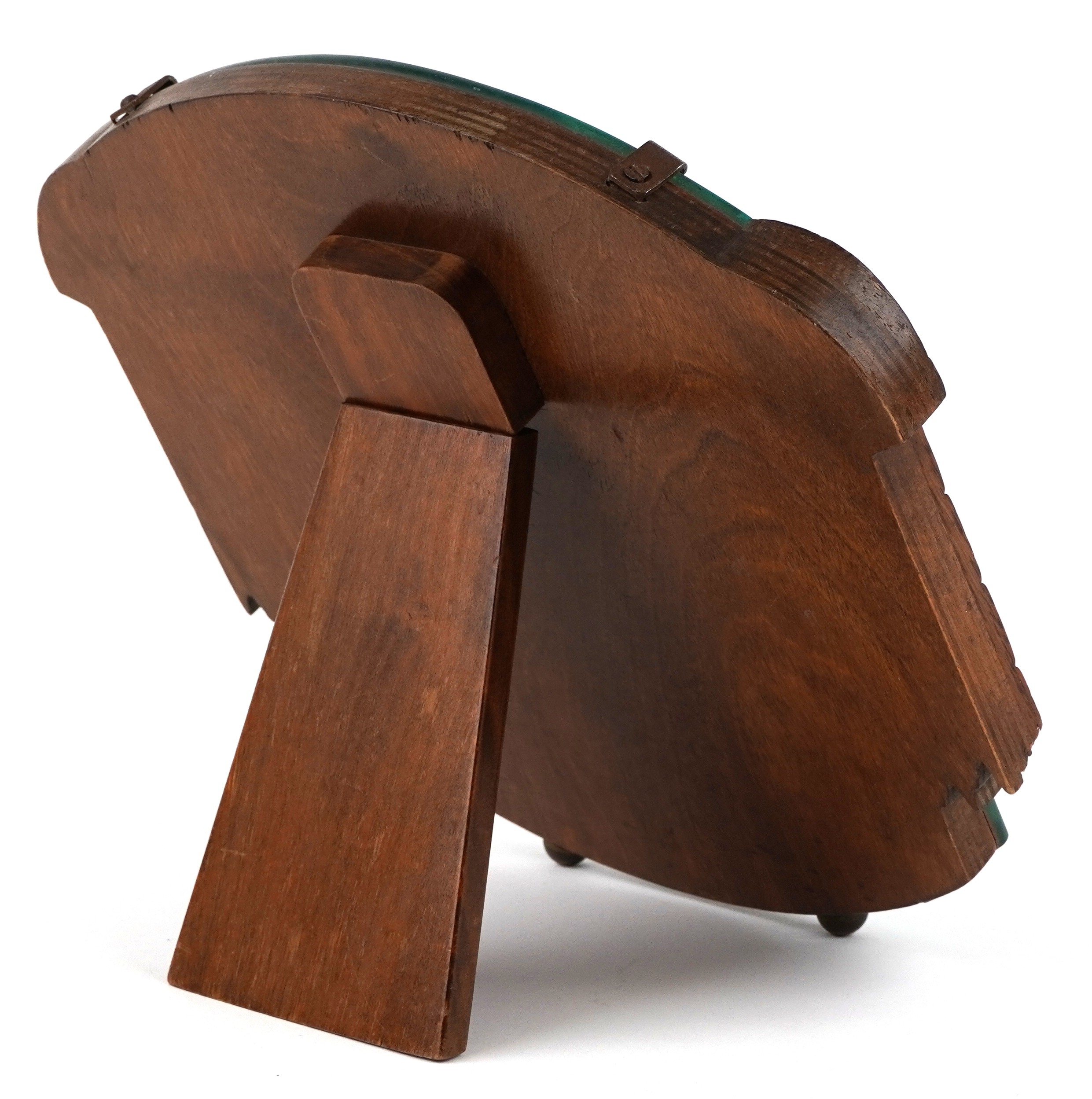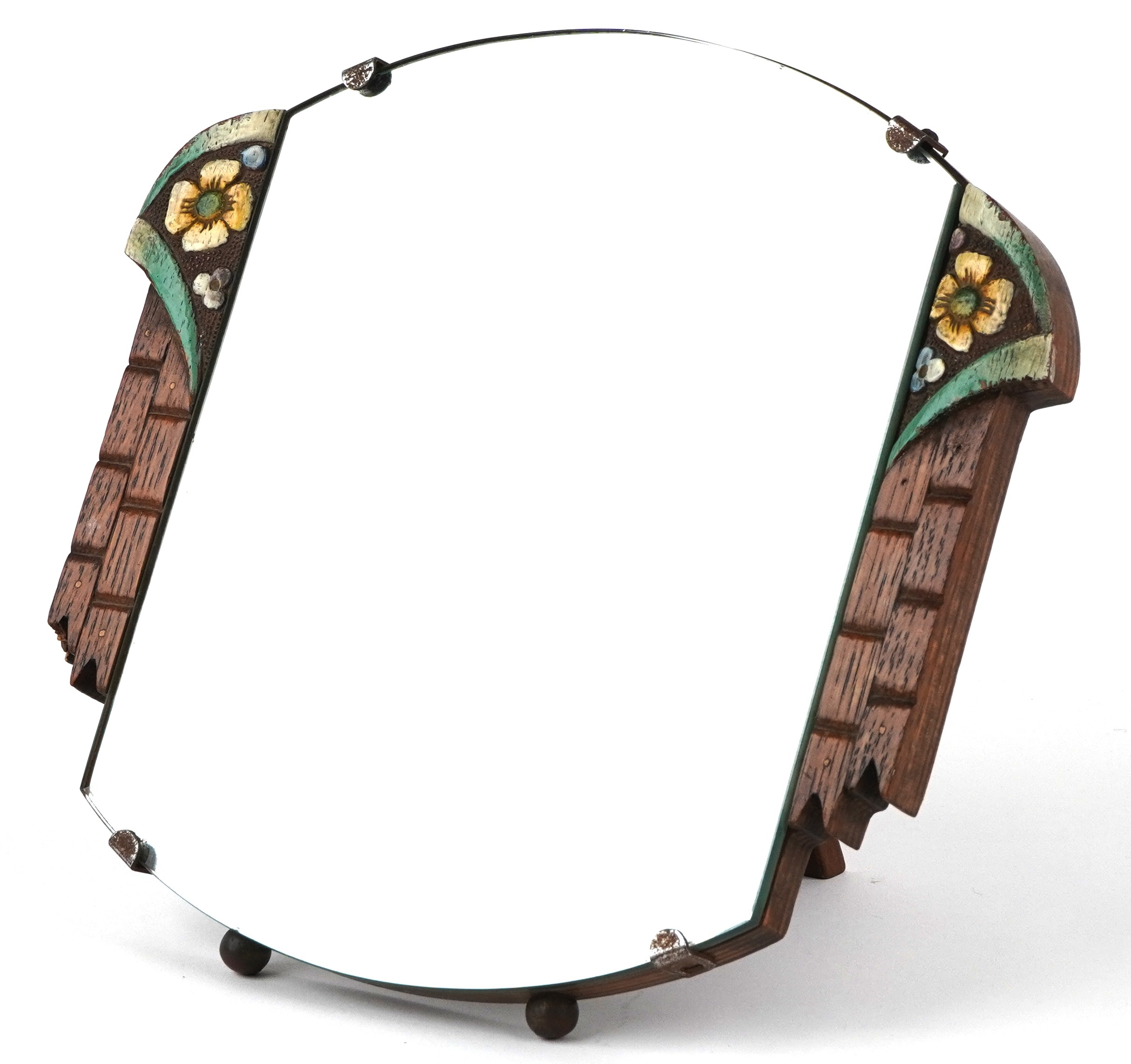 An Art Deco oak easel mirror with bevelled glass and hand painted decoration, 28cm x 26cm.